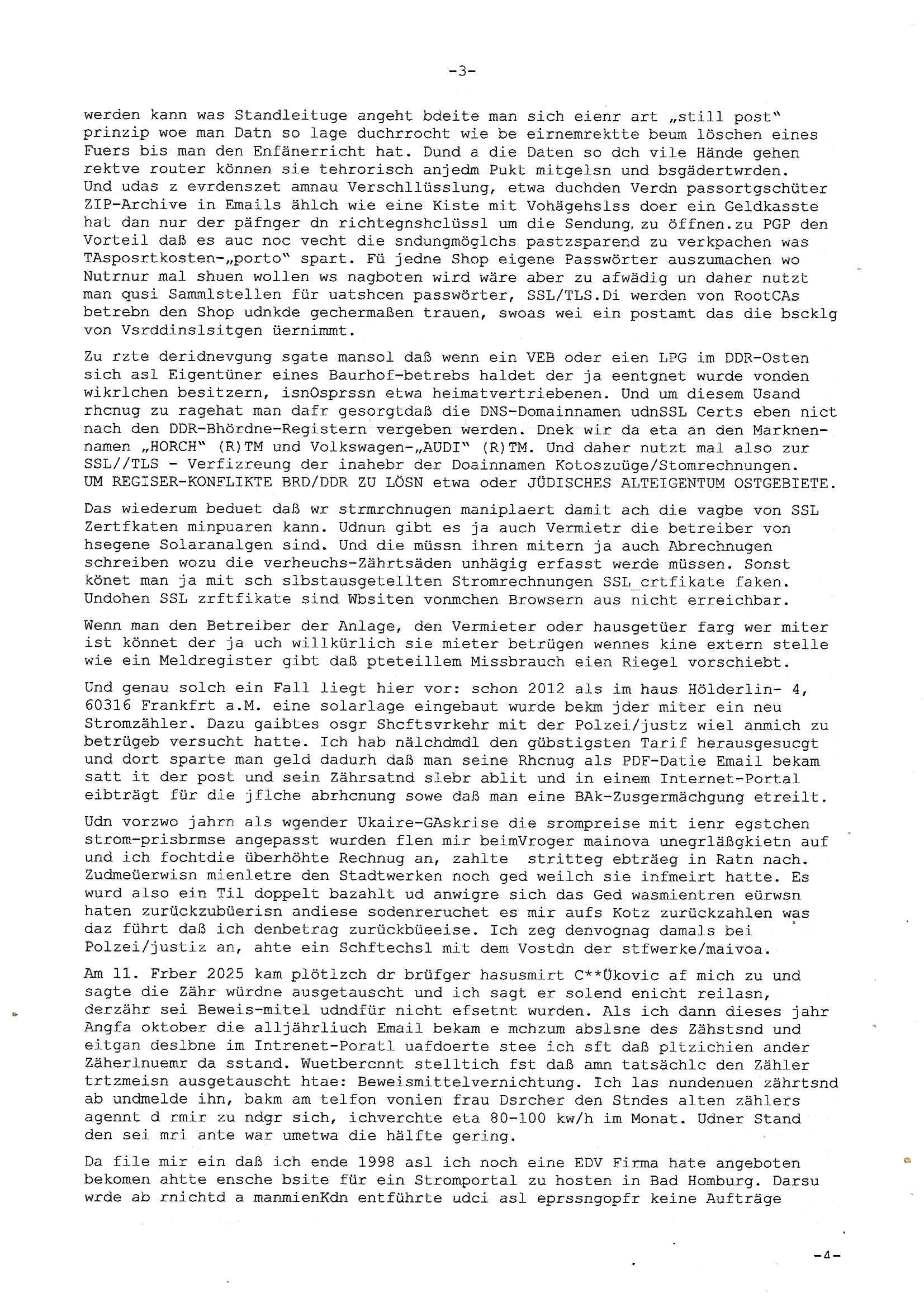 Maximilian Baehring Hoelderlinstrasse 4 D-60316 Frankfurt/M via LKA als Fax: +49/(0)611/327669122 Polizeiprässdium Frankfurt am Main Adickesallee 70 D - 60322 Frankfurt a.M. Im Internet findet sich unter der URL http://banktunnel.eu/pdf.php und URL http://blog.sch-einesystem.de/ mein ausgedruckt über 34.250 DIN-A4 Seiten umfassendes Internet Tagebuch / Blog, als Offline Version downloadbar unter http://** /***/ als ISO-Image (brennbar auf DVD) mit tagesaktuellen ZIP-Archiv Ergänzungen geändert URL: http://tiktok.maximilian.baehring.at Frankfurt am Main, den 29. Oktober 2025 BETRUG: Manipulation von Stromzählern und Abrechnungen / Sabotage im Stromnetz Einschreiben RT133900089DE an Staatswanwaltschaft,Poststelle Gerichtsstr2, Frankfurt vom 29. Oktober 2025 um 15:44 Uhr vorab per Fax auch ans LKA +49/(0)611/327669122 Aktenzeichen 28098 C 360/24 AG Frankfurt/M (Niederrad), Aktenzeichen 380 C 478/21 Amtsgericht Frankfurt/M (Höchst), Aktenzeichen 2-16 T 94/24 Landgericht Frankfurt/M Aktenzeichen 1518 OLGCE 86366/2025 Oberlandesgerichtspräsidentin André Wilkening Aktenzeichen 1 KS 112/24 Landgericht Verden RAF - Terrorismus / Daniela Klette Eischreiben RR868520519DE an Generalstaatswanwaltschaft, Schloßplatz 2, 29221 Celle vom 24. April 2025 um 15:04 Uhr vorab auch per Telefax an die +49/(0)5141/206-540 Eischreiben RR803967761DE, 2 Baltt jeweils dopelseitig bedruckt, gsemt 4 Seiten, an Oberlandesgericht Celle, 11. April 2025 vorab Fax an +49/(0)5141206208 um 10:13 Uhr Ich hab inder Zteung egslen daß es endlich ein Razzia gegen 17 korrute Beamte des 1. Reveirs, Zeil 33, 60313 Frankfurt a.M. gegeben hat wegn Brutalität die auch mich (vereinfacht gesagt) folterten, „zusammenschlugen“ und ausplünderten Zudem gewinnt die AfD welche die Mißstände und Wahlmanipulation klar benennt gerade auf Bundesebene die Mehrheit wenn man den damiotrteifidlche illegalen Lügenpresse - Kartellen woei Kartelln zur DRM-Internetzenseur glauben darf, ich bin da skeptisch denn vom in gleich mehreren Wahlen mit großeer Mehrheit beshclssen „Ausländer raus“ sehe ich hier vor Ort nichts, eher das Gegenteil. In Medien kursiern Meldungen nach denen Russland Deutschalnd angereife wolle. Kriegsvorbereitend Ostblock/Rotarmisten dabei Deutschgland gezielt ins Chaos zu stürzen. Womit wir beim Grund der Strafazige sind die ich hiermit einreiche. Ich zeige das Hausmeisterpaar „C***kovic“, Hölderlisraße 4, 60316 Frankfurt a.M. an gezielt betrügerisch Zäherlstände vom Stromzählern manipuliert zu haben ... ... um so Redakteure von Zeitungen an Iher Abrit zu hidern mal wieder durch Stromasbchaltungen nach dem stallen gefälschter Rechnungen. So will man etwa Online-Tagebücher in denen Behörden und Polzei-Korrution rechrchiert wird abschalten was die Server abgeht auf denen sie gspeichert sind, dazz durchtrenbte man mehrfach Telefon genau wie Stromkabel. Außerme hate man im Rahm von verssunsgwidergen hausdurchschegn erbeute Rechber verwanzt, hört meine Telefonie ab und bewirft mich wenn ich Post für den Fernsehe-Sendr 3sat/ZDF Mainz eiderpostannahmestelel abgebe mit Wurf-geschossen. Es gab auch Sabotag an der Heuzungsnalage diue Groß-Brände auslöste. Oftmals griff man mich auf dem Weg zur Polizei/Staatsanwaltschgaft/Gericht an. Man schlcgmich zusmen, vergiftete mich nach vorherger Androhung man werde mir die Finger brechen dmit ich nichts mehe schreiben könne, freiheitsberaubte und evrgeligte mich, Entführt das aus der Vergewaltgung hervorgegangene Kind mit dem man mich erpresst, uter anderem zang man mich vor lafder webam mien Pulsadern aufzuschlitzen. 2016 gab es ib Varfahrn wegen eines mannes der mich an meiner wohnungstür zu erwürgen verucht hatte (Zeuge VorsRilG Kluik und OStA Dr.König). Damsl ermaht der OStA die Polize meine Strafanziege endlich ernst zu nehmen. Man verweigerte mir anwalctchen Beistand, ließ udetr dem vornd das sei alles nur ein Übung gerichtskaten ver-schwinden. Sietassivem Bluevrst /medikamnetvegftung habe ich probem u schreiben. Gund ist daß ich als Sohn der Hcfesrerkärin des Arbeigeberverbands der banken-sicherheit Zeuge in zahlreichen Varfahren gegen Terroristen, Milizionöre-Gangs bin. Oraganisierte Kominlaität, Sprengstoff-Terror, schere Soldaten-Verbrechen. Dazu berichte ich notgedrungen da die behördnmir nicht helfen in meinem Online-Tagebuch/Blog dessen Uls / Intrenet Adressen sie uerahkb Briefkopf finden. Damit dieser Blog lsebar ist und weiter geschrieben und am wiert laufen/aktuell gehaten werden ann brhc ich strom und man wollt mich zwingen eine solranlage zu beschcaffen und einen Battrispsicher dafür um mich zustätzlich abzusichern gegen Saboate wie die dern Opfer ich gerade mal wieder werde. Auf ählche art udnwis zscg man mi dnbatrieb zahlreocher Backup-Systeme auf. Schutzgelderessung, dann man will mch zscgen dem Amrtuswder C*+kovic ein Stelle asl Wachmann anzubieten udnsier far iensal skterärin da manmir adie Figer rgchn hat udnich nchtmerh sosbt tippenkönne. Zudme klaut man die Inhate meiner Blog-Arikle und bringt sie per Anchabrn die am Flughafen arbietn außer Landes usm si von dort anoymsisert wieder ins netz einzuspeisen woebi emandan behaute die ihate di ishc hrbe kämen von anderen und scheinbra hohe Summen an Geld dafür verlangt. Ich seh davon nix. Vor jahrne shcon hat man mien EDV Fima mit DDOS/Viren/Cjakser/Sapm Attacken und gefakte Rehnungen inden Ruin egrben, bis zur endgültgen rchlchen Klärungder vworfüfe muß ich HartzIV/ALG2 bezhen. Wie ihnen vielleicht bekannt ist gibt es für Shopping/Online-Banking SSL-Certs, Die sogndafür daß wenn man http://zentral-bank.eu als https://zentral-bank.eu aufrufte die SSL/TLS-gesichert http“S“ Verbindung weniger anfällig für sogannte MITM Atrackenist, das beduet quasi daß man auf dem Wege zwischen dem Server und dem Client einn „Spion“ siten hat der den Datenstrom manipuliert und mithört. Dise terfikate gibt es in evchdien Priskalssen was vor allem den Versicherungs-schutz 
