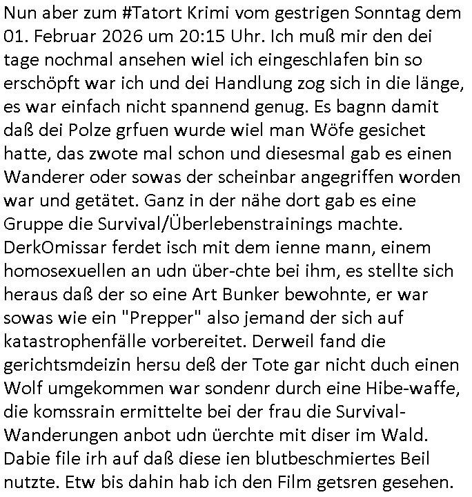 | Nun aber zum #Tatort Krimi vom gestrigen Sonntag dem 01. Februar 2026 um 20:15 Uhr. Ich muß mir den dei tage nochmal ansehen wiel ich eingeschlafen bin so erschöpft war ich und dei Handlung zog sich in die länge, es war einfach nicht spannend genug. Es bagnn damit daß dei Polze grfuen wurde wiel man Wöfe gesichet hatte, das zwote mal schon und diesesmal gab es einen Wanderer oder sowas der scheinbar angegriffen worden war und getätet. Ganz in der nähe dort gab es eine Gruppe die Survival/Überlebenstrainings machte. DerkOmissar ferdet isch mit dem ienne mann, einem homosexuellen an udn über-chte bei ihm, es stellte sich heraus daß der so eine Art Bunker bewohnte, er war sowas wie ein "Prepper" also jemand der sich auf katastrophenfälle vorbereitet. Derweil fand die gerichtsmdeizin hersu deß der Tote gar nicht duch einen Wolf umgekommen war sondenr durch eine Hibe-waffe, die komssrain ermittelte bei der frau die Survival-Wanderungen anbot udn üerchte mit diser im Wald. Dabie file irh auf daß diese ien blutbeschmiertes Beil nutzte. Etw bis dahin hab ich den Film getsren gesehen.