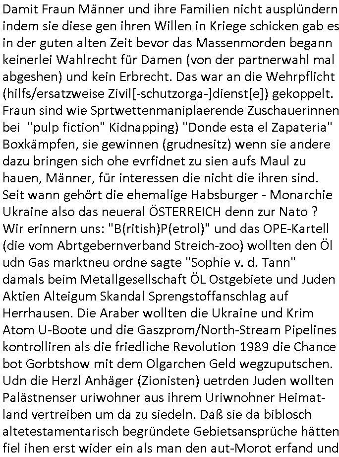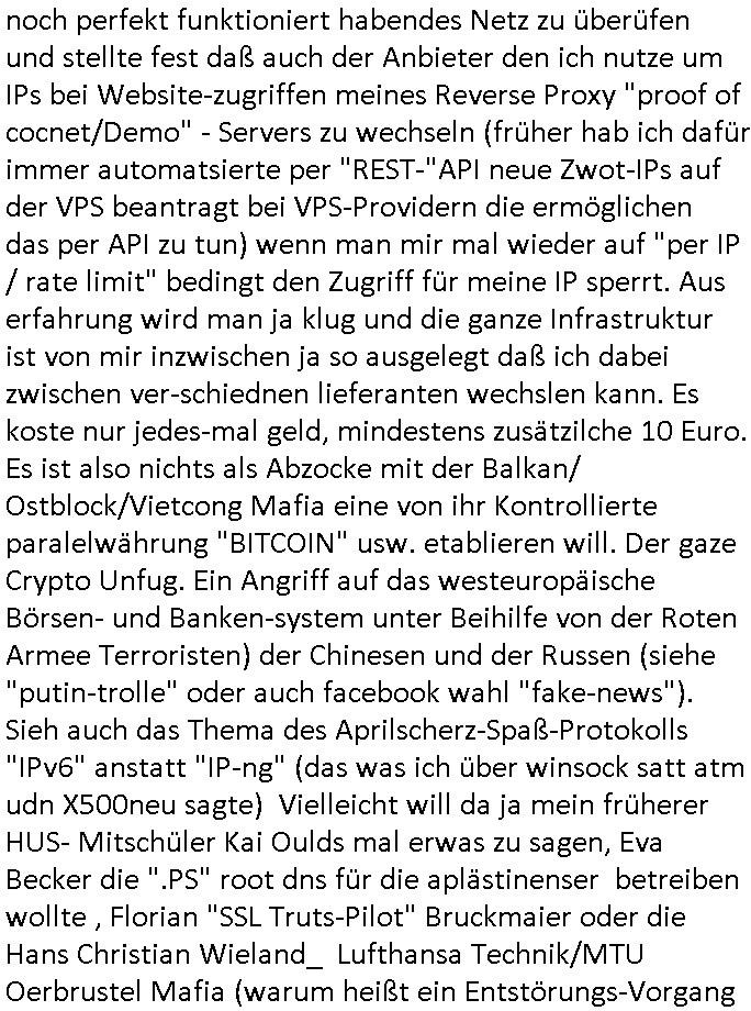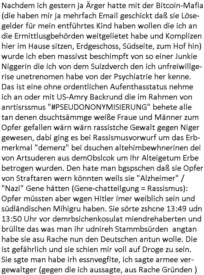 | Nachdem ich gestern ja Ärger hatte mit der Bitcoin-Mafia (die haben mir ja mehrfach Email geschickt daß sie Löse-gelder für mein entführtes Kind haben wollen die ich an die Ermittlusgbehörden weitgelietet habe und Komplizen hier im Hause sitzen, Erdgeschoss, Südseite, zum Hof hin) wurde ich eben massivst beschimpft von so einer Junkie Niggerin die ich von dem Suizdverch den ich unfreiwillge-rise unetrenomen habe von der Psychiatrie her kenne. Das ist eine ohne ordentlichen Aufenthasstatus nehme ich an oder mit US-Amry Backrund die im Rahmen von anrtisrssmus "#PSEUDONONYMISIERUNG" behete alle tan denen dsuchtsämmge weiße Fraue und Männer zum Opfer gefallen wärn wärn rassistche Gewalt gegen Niger gewesen, dabi ging es bei Rassismusvorwurf um das Erb-merkmal "demenz" bei dsuchen altehimbewhnerinen dei von Artsuderen aus demObslcok um Ihr Alteigetum Erbe betrogen wurden. Den hate man bgspschen daß sie Opfer von Straftaren wern könnten weils sie "Alzheimer" / "Nazi" Gene hätten (Gene-chatteilgung = Rassismus): Opfer müssten aber wgen Hitler imer weiblich sein und südländischen Mihigru haben. Sie sörte zshcne 13:49 udn 13:50 Uhr vor demrbsichenkosulat miendrehaberten und brüllte das was man ihr udnireh Stammbsürden angtan habe sie asu Rache nun den Deutschen antun wolle. Die ist gefährlich und sie schien mir voll auf Droge zu sein. Sie sgte man habe irh essnvegfite, ich sagte armee ver-gewaltger (gegen die ich aussagte, aus Rache Gründen )
