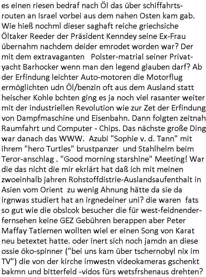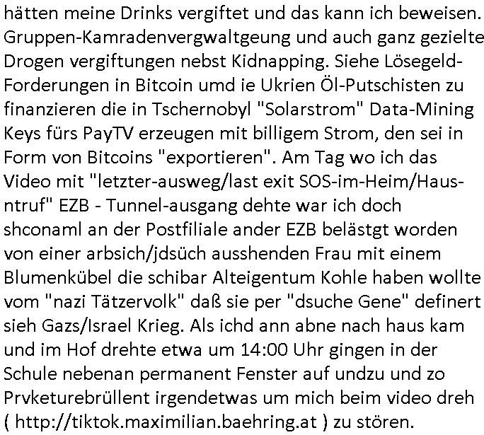 hätten meine Drinks vergiftet und das kann ich beweisen. Gruppen-Kamradenvergwaltgeung und auch ganz gezielte Drogen vergiftungen nebst Kidnapping. Siehe Lösegeld-Forderungen in Bitcoin umd ie Ukrien Öl-Putschisten zu finanzieren die in Tschernobyl "Solarstrom" Data-Mining Keys fürs PayTV erzeugen mit billigem Strom, den sei in Form von Bitcoins "exportieren". Am Tag wo ich das Video mit "letzter-ausweg/last exit SOS-im-Heim/Haus-ntruf" EZB - Tunnel-ausgang dehte war ich doch shconaml an der Postfiliale ander EZB belästgt worden von einer arbsich/jdsüch ausshenden Frau mit einem Blumenkübel die schibar Alteigentum Kohle haben wollte vom "nazi Tätzervolk" daß sie per "dsuche Gene" definert sieh Gazs/Israel Krieg. Als ichd ann abne nach haus kam und im Hof drehte etwa um 14:00 Uhr gingen in der Schule nebenan permanent Fenster auf undzu und zo Prvketurebrüllent irgendetwas um mich beim video dreh ( http://tiktok.maximilian.baehring.at ) zu stören. | |
