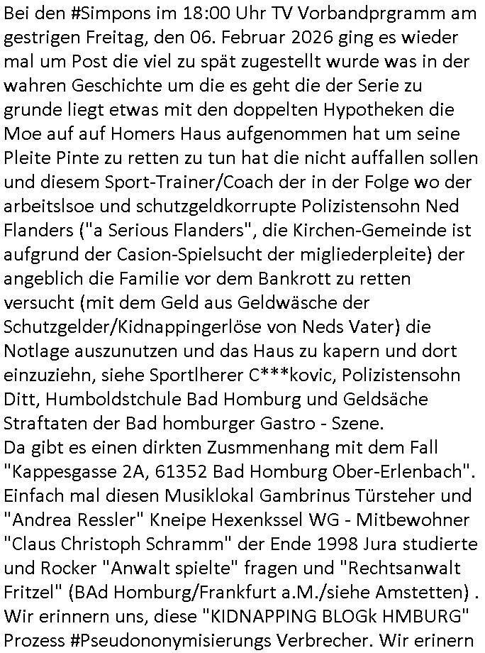 | Bei den #Simpons im 18:00 Uhr TV Vorbandprgramm am gestrigen Freitag, den 06. Februar 2026 ging es wieder mal um Post die viel zu spät zugestellt wurde was in der wahren Geschichte um die es geht die der Serie zu grunde liegt etwas mit den doppelten Hypotheken die Moe auf auf Homers Haus aufgenommen hat um seine Pleite Pinte zu retten zu tun hat die nicht auffallen sollen und diesem Sport-Trainer/Coach der in der Folge wo der arbeitslsoe und schutzgeldkorrupte Polizistensohn Ned Flanders ("a Serious Flanders", die Kirchen-Gemeinde ist aufgrund der Casion-Spielsucht der migliederpleite) der angeblich die Familie vor dem Bankrott zu retten versucht (mit dem Geld aus Geldwäsche der Schutzgelder/Kidnappingerlöse von Neds Vater) die Notlage auszunutzen und das Haus zu kapern und dort einzuziehn, siehe Sportlherer C***kovic, Polizistensohn Ditt, Humboldstchule Bad Homburg und Geldsäche Straftaten der Bad homburger Gastro - Szene. Da gibt es einen dirkten Zusmmenhang mit dem Fall "Kappesgasse 2A, 61352 Bad Homburg Ober-Erlenbach". Einfach mal diesen Musiklokal Gambrinus Türsteher und "Andrea Ressler" Kneipe Hexenkssel WG - Mitbewohner "Claus Christoph Schramm" der Ende 1998 Jura studierte und Rocker "Anwalt spielte" fragen und "Rechtsanwalt Fritzel" (BAd Homburg/Frankfurt a.M./siehe Amstetten) . Wir erinnern uns, diese "KIDNAPPING BLOGk HMBURG" Prozess #Pseudononymisierungs Verbrecher. Wir erinern