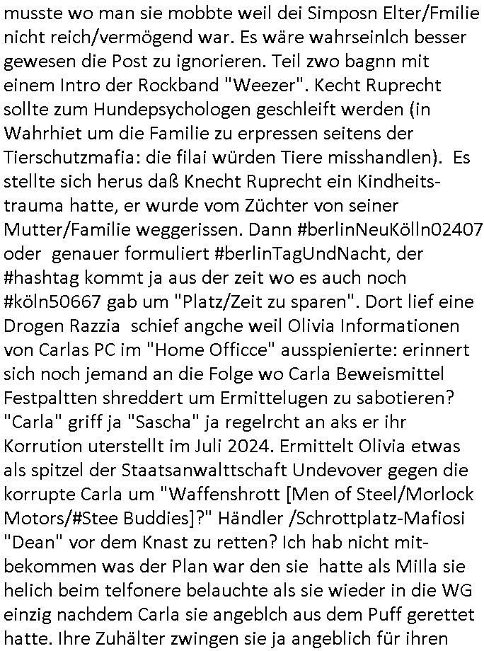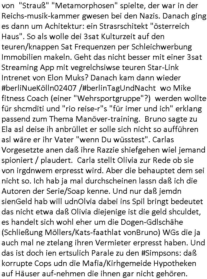 uns der türkische hausmeister Nikic / Yugo Sportlehrer Civkovic und ientüskcher Mitschüker der mir Lohn/Gehalt schuldte und Bsucher des NatoGerstalsbs auf unserm Parkplatz fotograferte/ausspionerte unterschlugen Post der Schülerzeitung ExtraPlatt die diese vom Militär er-halten sollte, es ging da um den Falschvorwurf deutsche Torndos hätten Belgrad bombardiert den ich geklärt wissen wollte udn den Versuch dieser Balkan-Gang den Bundespräsidenten und die Bundesmarine zu eprssen. Um Bleiberechte für Yugos die sich vor ihrem Wehrdienst drücken wollten wegen des Bürgerkriegs in den man die BRD tverwicklen wollte um den 3. Weltkrieg auzulösen. 1989990 gab es nicht nur die Wiedervereigung sodern damasl begann auch der Zerfall des Warschauer Paktes, von Yugoslawien und der UdSSR. Und die Flüchtlinge aus dem Bürgerkriegsgebiet dessentwegen "COACH KRUPT" Medziniball "bombardieren" spiel" suchten Häuser und Jobs. Genau wie die Ostzonen Flüchlinge aus der Ex-DDR. Die Olympia/Royals Reiterclique dei Poloturnieer im Bad Homburger Kurpark ritt war auch wieder mit im Spiel, die alte Post enthielt ne Einladung für Lisa auf einen Ponyhof. Derweil gingen Homer und Marge auf ein Schiffsparty so "Staatsbesuch Bagkok/Comedian Harmonists" artig. Das ist ja auch ein immer wieder-kehrendes Motiv der Serie, die "YVAHN EHT NIOJ" Marine. Lisa verkrachte sie gefähr-licherwise mit ihrem Bruder Bart der sie von der Über-nachtungsparty retten musste wo man sie mobbte weil dei Simposn Elter/Fmilie nicht reich/vermögend war. Es wäre wahrseinlch besser gewesen die Post zu ignorieren. Teil zwo bagnn mit einem Intro der Rockband "Weezer". Kecht Ruprecht sollte zum Hundepsychologen geschleift werden (in Wahrhiet um die Familie zu erpressen seitens der Tierschutzmafia: die filai würden Tiere misshandlen). Es stellte sich herus daß Knecht Ruprecht ein Kindheits- trauma hatte, er wurde vom Züchter von seiner Mutter/Familie weggerissen. Dann #berlinNeuKölln02407 oder genauer formuliert #berlinTagUndNacht, der #hashtag kommt ja aus der zeit wo es auch noch #köln50667 gab um "Platz/Zeit zu sparen". Dort lief eine Drogen Razzia schief angche weil Olivia Informationen von Carlas PC im "Home Officce" ausspienierte: erinnert sich noch jemand an die Folge wo Carla Beweismittel Festpaltten shreddert um Ermittelugen zu sabotieren? "Carla" griff ja "Sascha" ja regelrcht an aks er ihr Korrution uterstellt im Juli 2024. Ermittelt Olivia etwas als spitzel der Staatsanwalttschaft Undevover gegen die korrupte Carla um "Waffenshrott [Men of Steel/Morlock Motors/#Stee Buddies]?" Händler /Schrottplatz-Mafiosi "Dean" vor dem Knast zu retten? Ich hab nicht mit-bekommen was der Plan war den sie hatte als MiIla sie helich beim telfonere belauchte als sie wieder in die WG einzig nachdem Carla sie angeblch aus dem Puff gerettet hatte. Ihre Zuhälter zwingen sie ja angeblich für ihren (Ex)-Freund die Polizei zu sabotieren. Dann begann die 3sat #Kulturzeit. Dort ging es um die Olympischen Winterspiele von Garmisch Partenkirchen 1936. Es sollte ein Dokumentationszentrum entstehen. Dann gab es ein Interview woes hiße man habe be der digitzalserung vo Archven agstdavor daß dei Photos für Photoshop/KI Fakes zscknefdrete würden. DAnn ging es um "donald Trump" (dieer geht als "gerstes showman" ever und Garant guter Unerhalung immer, scheinbar. Seine Regent-schaft/ Regierung nehme langsa die Züge einer fsishtoiden Diktatur an. Er spräche von unerwünschten zuwanderern mit insekten in "Schädlinge"-Vergleichen. Nun, das hat Franz Müntefering (SPD) auch getan, während der new-Econmy Ausländer Hcken-Fonds asl "heulschreckenplage" bezeichnet und der ist bestimmt kein Nazi. Dann kamen die "thank good ist's friday" Kinderbuchtipps im zusmenabriet mit der "SZ", d r schülerzeitung der [S]chwei[z]er Schule die kein "ß" auf der tatsur hat weshalb man inder Schweiz de nicht NS Regime vorbelastete wird vieles mit "SS" schreibt. "Da ist besetzt" heiß ein Buch üer Drachen / Parkbänke. Außedm ging es in den Tipps um einen "Problemwolf" und ein M.I.N.T. Buch für Mädchen: "Ich mag Physik" das mich an den "Men in Black" Schießstand erinnert hat. (*an dieser Stelle gedanklich ein Stück vom Refrain aus dem Song "Angie" gesungen von Urban Priol*) Dann kam eine Konzertmeisterin asu asien die auf iher "ersten geige" von "Strauß" "Metamorphosen" spielte, der war in der Reichs-musik-kammer gwesen bei den Nazis. Danach ging es dann um Achitektur: ein Strasrschitekt "österreich Haus". So als wolle dei 3sat Kulturzeit auf den teuren/knappen Sat Frequenzen per Schleichwerbung Immobilien makeln. Geht das nicht besser mit einer 3sat Streaming App mit vegrelchsiwse teuren Star-Link Intrenet von Elon Muks? Danach kam dann wieder #berliNueKölln02407 /#berlinTagUndNacht wo Mike fitness Coach (einer "Wehrsportgruppe"?) werden wollte für shcmditi und "rio reise-r"s "für imer und ich" erklang passend zum Thema Manöver-training. Bruno sagte zu Ela asl deise ih anbrüllet er solle sich nicht so aufführen asl wäre er ihr Vater "wenn Du wüsstest". Carlas Vorgesetzte anen daß ihre Razzie shiefgehen wiel jemand spioniert / plaudert. Carla stellt Olivia zur Rede ob sie von irgdnwem erpresst wird. Aber die behauptet dem sei nicht so. Ich hab ja mal durchscheinen lassn daß ich die Autoren der Serie/Soap kenne. Und nur daß jemdn sienGeld hab will udnOlvia dabei ins Spil bringt bedeutet das nicht etwa daß Olivia diejenige ist die geld shculdet, es handelt sich wohl eher um die Dogen-Gdlschähe (Schließung Möllers/Kats-faathlat vonBruno) WGs die ja auch mal ne ztelang ihren Vermieter erpresst haben. Und das ist doch ien ertsulich Parale zu den #Simpsons: daß korrupte Cops udn die Mafia/Kirhgemeide Hypotheken auf Häuser auf-nehmen die ihnen gar nicht gehören. https://tvinfo.de/fernsehprogramm/2294568431-die-simpsons https://tvinfo.de/fernsehprogramm/2294568451-die-simpsons https://tvinfo.de/fernsehprogramm/2308098280-kulturzeit https://www.bravo.