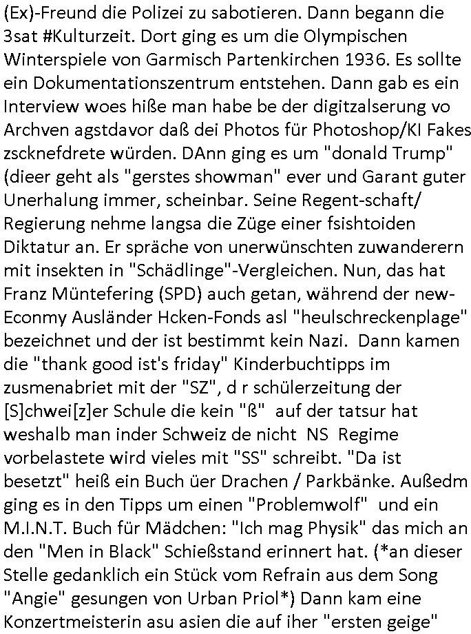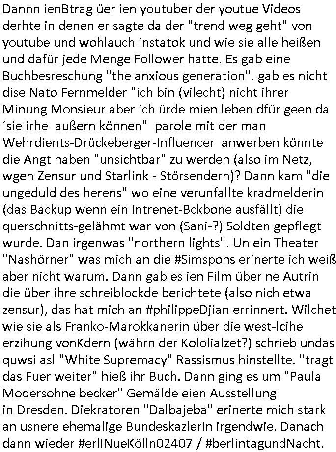 Dannn ienBtrag üer ien youtuber der youtue Videos derhte in denen er sagte da der "trend weg geht" von youtube und wohlauch instatok und wie sie alle heißen und dafür jede Menge Follower hatte. Es gab eine Buchbesreschung "the anxious generation". gab es nicht dise Nato Fernmelder "ich bin (vilecht) nicht ihrer Minung Monsieur aber ich ürde mien leben dfür geen da´sie irhe außern können" parole mit der man Wehrdients-Drückeberger-Influencer anwerben könnte die Angt haben "unsichtbar" zu werden (also im Netz, wgen Zensur und Starlink - Störsendern)? Dann kam "die ungeduld des herens" wo eine verunfallte kradmelderin (das Backup wenn ein Intrenet-Bckbone ausfällt) die querschnitts-gelähmt war von (Sani-?) Soldten gepflegt wurde. Dan irgenwas "northern lights". Un ein Theater "Nashörner" was mich an die #Simspons erinerte ich weiß aber nicht warum. Dann gab es ien Film über ne Autrin die über ihre schreiblockde berichtete (also nich etwa zensur), das hat mich an #philippeDjian errinnert. Wilchet wie sie als Franko-Marokkanerin über die west-lcihe erzihung vonKdern (währn der Kololialzet?) schrieb undas quwsi asl "White Supremacy" Rassismus hinstellte. "tragt das Fuer weiter" hieß ihr Buch. Dann ging es um "Paula Modersohne becker" Gemälde eien Ausstellung in Dresden. Diekratoren "Dalbajeba" erinerte mich stark an usnere ehemalige Bundeskazlerin irgendwie. Danach dann wieder #erlINueKölln02407 / #berlintagundNacht. malt brucht zsmen, er hat ien "blaue 'pro Baby' Pille" aus dem Viagaria-Connection Eail-Spam ausprobiert. Und Olivia löscht indm sie scih in WG Mitbewhnerin Carlas acoount Beweismittel-Daten vom Polizeiserver. https://tvinfo.de/fernsehprogramm/2299002929-die-simpsons https://tvinfo.de/fernsehprogramm/2299002941-die-simpsons https://tvinfo.de/fernsehprogramm/2275556819-kulturzeit | |
