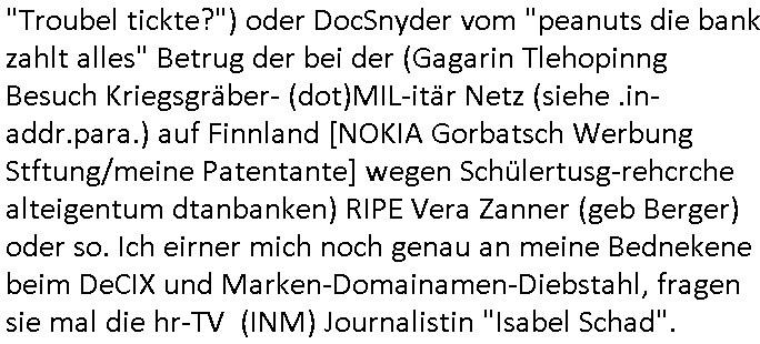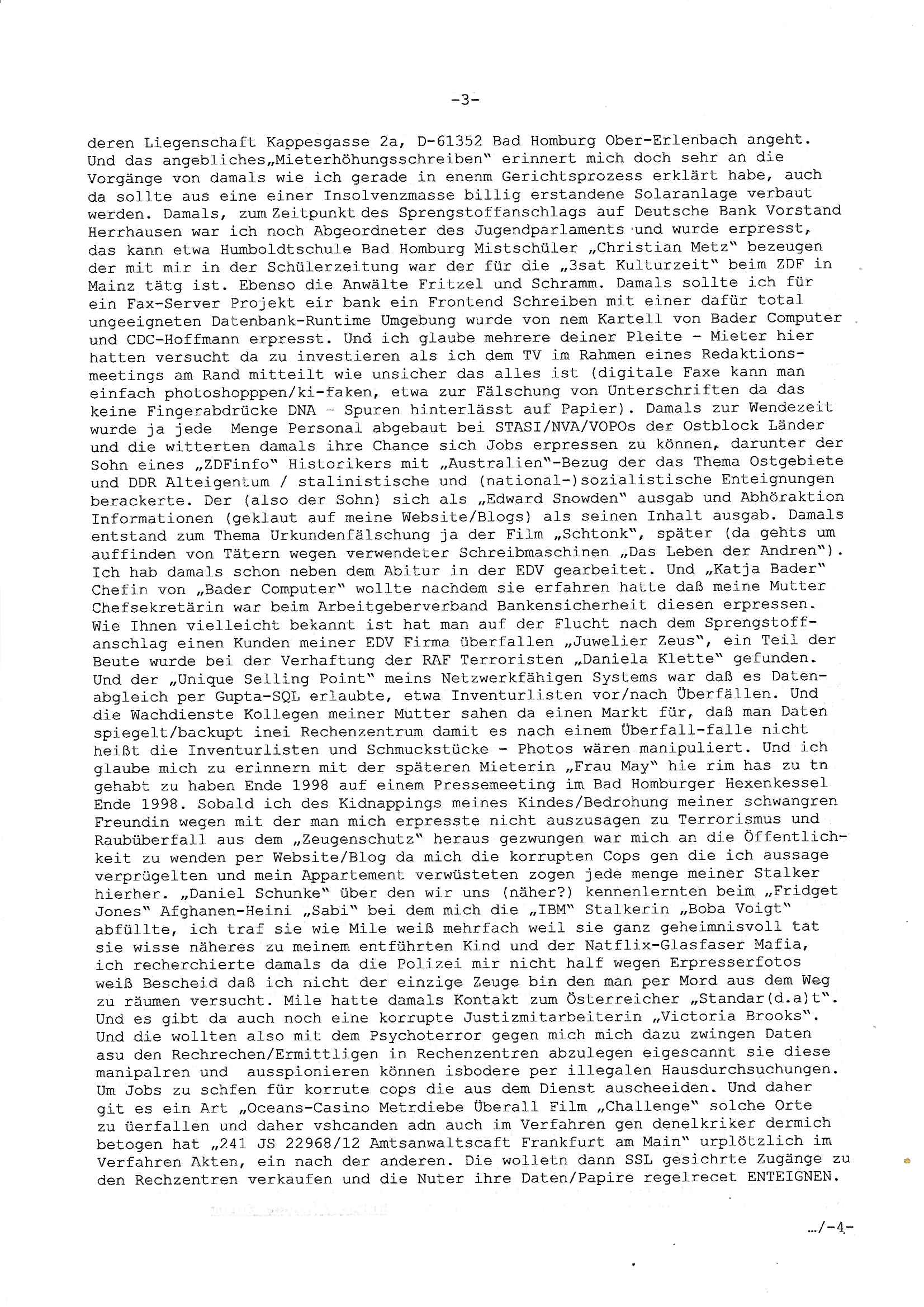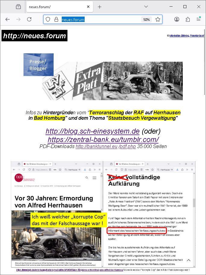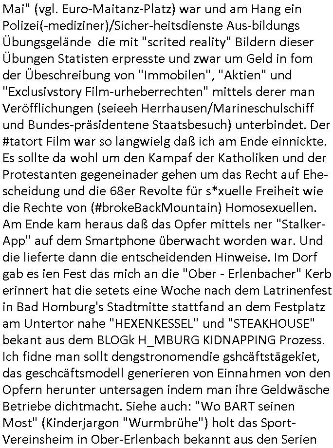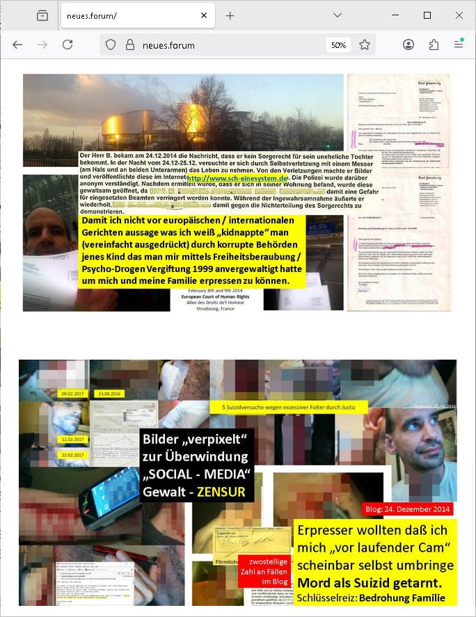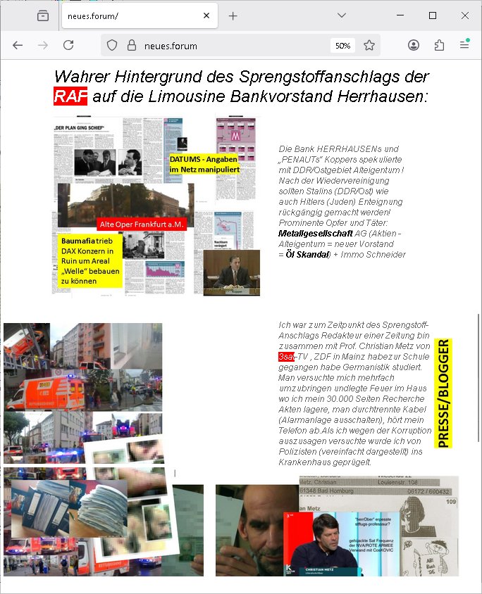 http://neues.forum © Maximilian Bähring, Frankfurt a.M. Presse/Blogger Infos zu Hintergründen vom "Terroranschlag der RAF auf Herrhausen in Bad Homburg" und dem Thema "Staatsbesuch Vergewaltigung" http://blog.sch-einesystem.de (oder) https://zentral-bank.eu/tumblr.com/ PDF-Downloads http://banktunnel.eu /pdf.php 35.000 Seiten https://www.bpb.de/kurz-knapp/hintergrund-aktuell/196955/vor-30-jahren-ermordung-von-alfred-herrhausen/ Ich weiß welcher "korrupte Cop" das mit der Falschaussage war ! https://www.fnp.de/frankfurt/frankfurter-netzaktivist-legt-sich-10753211.html halbseitiger Artikel 24. Juni 2015 Frankfurter Neue Presse/Blockupy 18. März 2015 Ich bin politisch aktiver Blogger, war unter anderem Parlamentarier und habe für Datenschutz - Demos mit tausenden Teilnehmern in Frankfurt im Umfeld der Piraten- partei Plakate geklebt. Der Grund ist daß ich in der EDV unternehmerisch tätig war bis man durch Schutzgeld - Erpressung / Hacks/DDOS –Kosten meine Firma ruinierte wegen Server mit KORRUTIONS – Beweismitteln die ich zensur-geschützt betrieb. Wahrer Hintergrund des Sprengstoffanschlags der RAF auf die Limousine Bankvorstand Herrhausen: DATUMS - Angaben im Netz manipuliert Die Bank HERRHAUSENs und „PENAUTs“ Koppers spekulierte mit DDR/Ostgebiet Alteigentum ! Nach der Wiedervereinigung sollten Stalins (DDR/Ost) wie auch Hitlers (Juden) Enteignung rückgängig gemacht werden! Prominente Opfer und Täter: Metallgesellschaft AG (Aktien - Alteigentum = neuer Vorstand = Öl Skandal) + Immo Schneider Alte Oper Frankfurt a.M. Baumafia trieb DAX Konzern in Ruin um Areal „Welle“ bebauen zu können Ich war zum Zeitpunkt des Sprengstoff-Anschlags Redakteur einer Zeitung bin zusammen mit Prof. Christian Metz von 3sat-TV , ZDF in Mainz habezur Schule gegangen habe Germanistik studiert.Man versuchte mich mehrfach umzubringen undlegte Feuer im Haus wo ich mein 30.000 Seiten Recherche Akten lagere, man durchtrennte Kabel(Alarmanlage ausschalten), hört mein Telefon ab.Als ich wegen der Korruption auszusagen versuchte wurde ich von Polizisten (vereinfacht dargestellt) insKrankenhaus geprügelt. Der Herr B. bekam am 24.12.2014 die Nachricht, dass er kein Sorgerecht für seine uneheliche Tochter bekommt. In der Nacht vom 24.12-25.12. versuchte er sich durch Selbstverletzung mit einem Messer (am Hals und an beiden Unterarmen) das Leben zu nehmen. Von den Verletzungen machte er Bilder und verÃöffentlichte diese im lnternet- http://www.sch-einesystem.de . Die Polizei wurde darüber anonym verstöndigt. Nachdem ermittelt wurde, dass er sich in seiner Wohnung befand, wurde diese gewaltsam geöffnetâda damit eine Gefahr für eingesetzten Beamten verringert werden konnte. Während der Ingewahrsamnahme äußrte er wiederholtâgegen die Nichterteilung des Sorgerechts zu demonstrieren. Damit ich nicht vor europäischen / internationalen Gerichten aussage was ich weiß "kidnappte" man (vereinfacht ausgeddückt) durch korrupte Behörden jenes Kind das man mir mittels Freiheitsberaubung / Psycho-Drogen Vergiftung 1999 anvergewaltigt hatte um mich und meine Familie erpressen zu können. Erpresser wollten daß ich mich "vor laufender Cam" scheinbar selbst umbringe Mord als Suizid getarnt. Schlüsselreiz: Bedrohung Familie Bilder "verpixelt" zur Überwindung "SOCIAL - MEDIA" Gewalt - ZENSUR 5 Suizidversuche wegen exzessiver Folter durch Justiz / Blog: 24. Dezember 2014 === << http://neues.forum Maximilian Baehring - Hoelderlinstrasse 4 - D-60316 Frankfurt/M. http://maximilian.baehring.at Mail: maximilian@baehring.at Fon: +49/(0)69/17320776 +49/(0)176/65605075 Fax: +49/(0)69/67831634 Blog(s): http://blog.sch-einesystem.de http://tabea-lara.blogna.me http://wuergerjagd.blogna.me http://decl-war.blogna.me http://anschlag215.blogna.me PDFs: http://banktunnel.eu /pdf.php http://bad-homburg.eu/download/ Tiktok: http://tiktok.maximilian.baehring.at | |