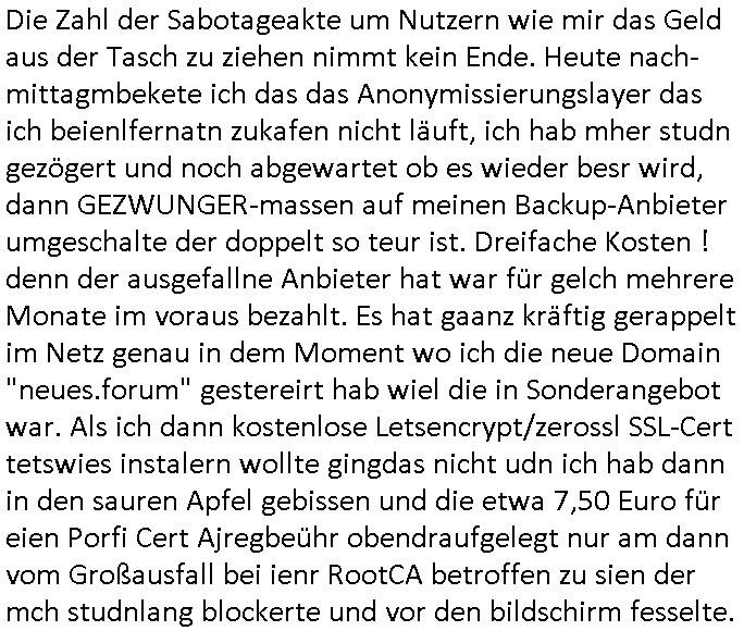 | Die Zahl der Sabotageakte um Nutzern wie mir das Geld aus der Tasch zu ziehen nimmt kein Ende. Heute nach-mittagmbekete ich das das Anonymissierungslayer das ich beienlfernatn zukafen nicht läuft, ich hab mher studn gezögert und noch abgewartet ob es wieder besr wird, dann GEZWUNGER-massen auf meinen Backup-Anbieter umgeschalte der doppelt so teur ist. Dreifache Kosten ! denn der ausgefallne Anbieter hat war für gelch mehrere Monate im voraus bezahlt. Es hat gaanz kräftig gerappelt im Netz genau in dem Moment wo ich die neue Domain "neues.forum" gestereirt hab wiel die in Sonderangebot war. Als ich dann kostenlose Letsencrypt/zerossl SSL-Cert tetswies instalern wollte gingdas nicht udn ich hab dann in den sauren Apfel gebissen und die etwa 7,50 Euro für eien Porfi Cert Ajregbeühr obendraufgelegt nur am dann vom Großausfall bei ienr RootCA betroffen zu sien der mch studnlang blockerte und vor den bildschirm fesselte.