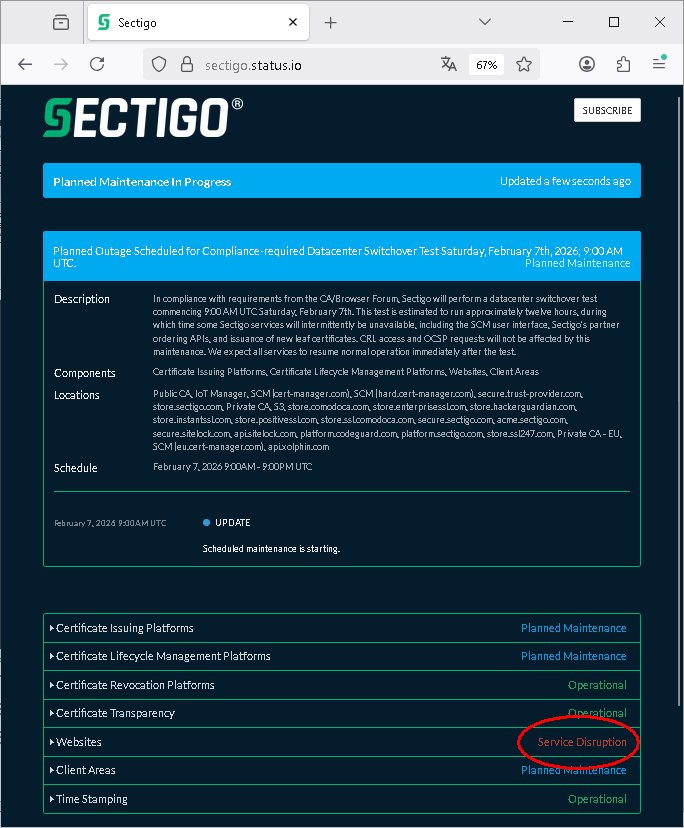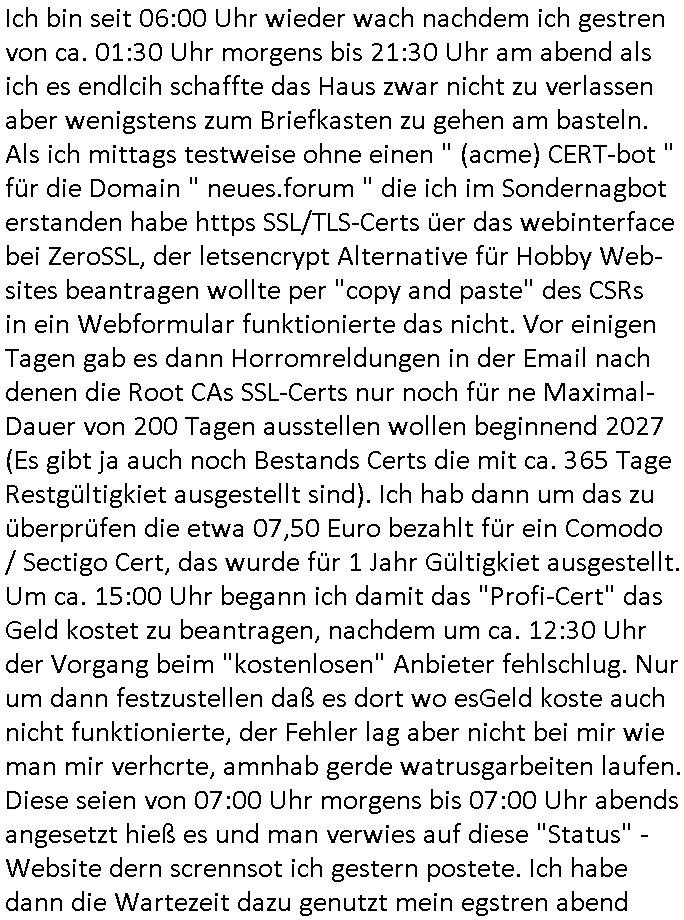 | Ich bin seit 06:00 Uhr wieder wach nachdem ich gestren von ca. 01:30 Uhr morgens bis 21:30 Uhr am abend als ich es endlcih schaffte das Haus zwar nicht zu verlassen aber wenigstens zum Briefkasten zu gehen am basteln. Als ich mittags testweise ohne einen " (acme) CERT-bot " für die Domain " neues.forum " die ich im Sondernagbot erstanden habe https SSL/TLS-Certs üer das webinterface bei ZeroSSL, der letsencrypt Alternative für Hobby Web-sites beantragen wollte per "copy and paste" des CSRs in ein Webformular funktionierte das nicht. Vor einigen Tagen gab es dann Horromreldungen in der Email nach denen die Root CAs SSL-Certs nur noch für ne Maximal- Dauer von 200 Tagen ausstellen wollen beginnend 2027 (Es gibt ja auch noch Bestands Certs die mit ca. 365 Tage Restgültigkiet ausgestellt sind). Ich hab dann um das zu überprüfen die etwa 07,50 Euro bezahlt für ein Comodo / Sectigo Cert, das wurde für 1 Jahr Gültigkiet ausgestellt. Um ca. 15:00 Uhr begann ich damit das "Profi-Cert" das Geld kostet zu beantragen, nachdem um ca. 12:30 Uhr der Vorgang beim "kostenlosen" Anbieter fehlschlug. Nur um dann festzustellen daß es dort wo esGeld koste auch nicht funktionierte, der Fehler lag aber nicht bei mir wie man mir verhcrte, amnhab gerde watrusgarbeiten laufen. Diese seien von 07:00 Uhr morgens bis 07:00 Uhr abends angesetzt hieß es und man verwies auf diese "Status" - Website dern scrennsot ich gestern postete. Ich habe dann die Wartezeit dazu genutzt mein egstren abend