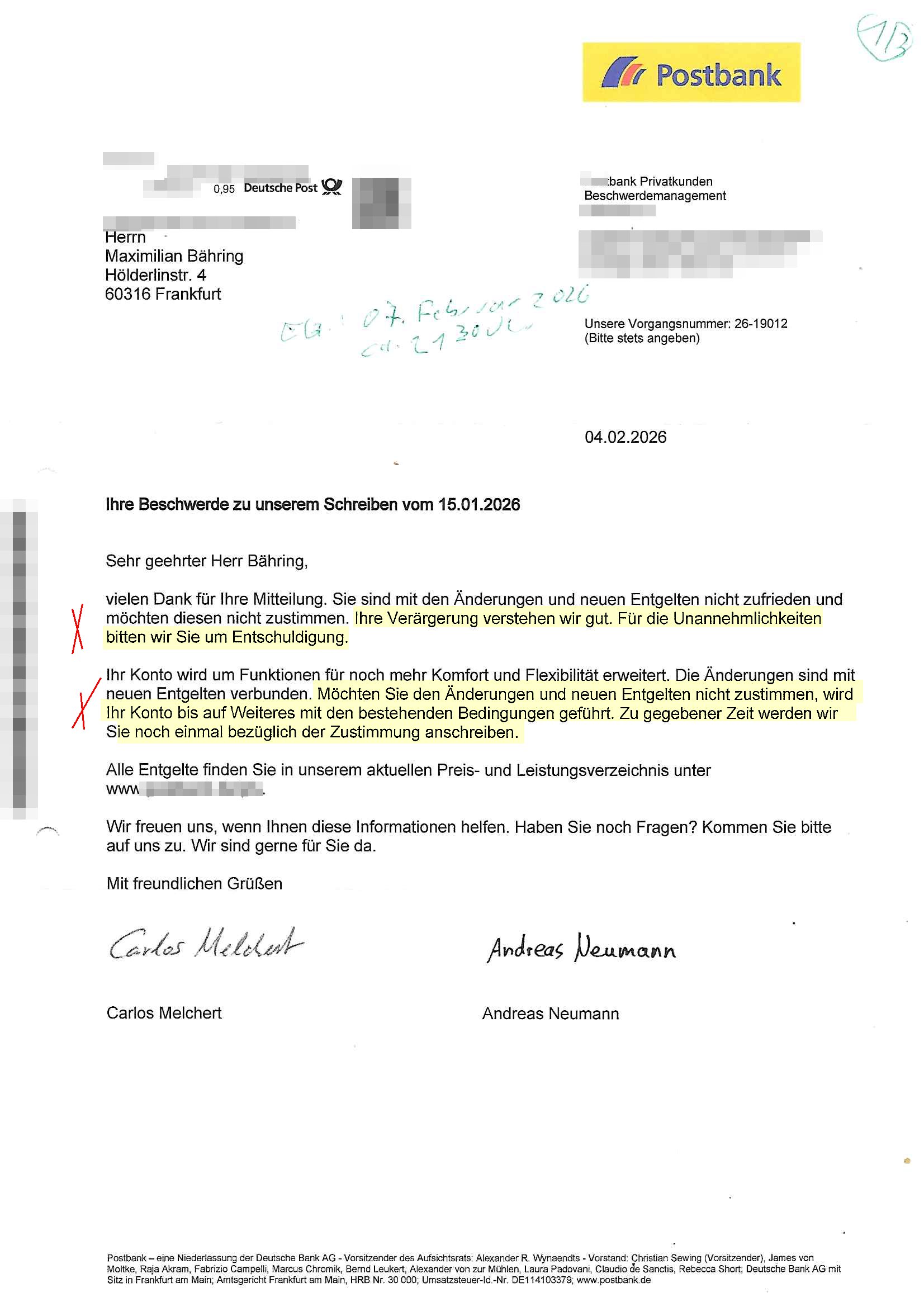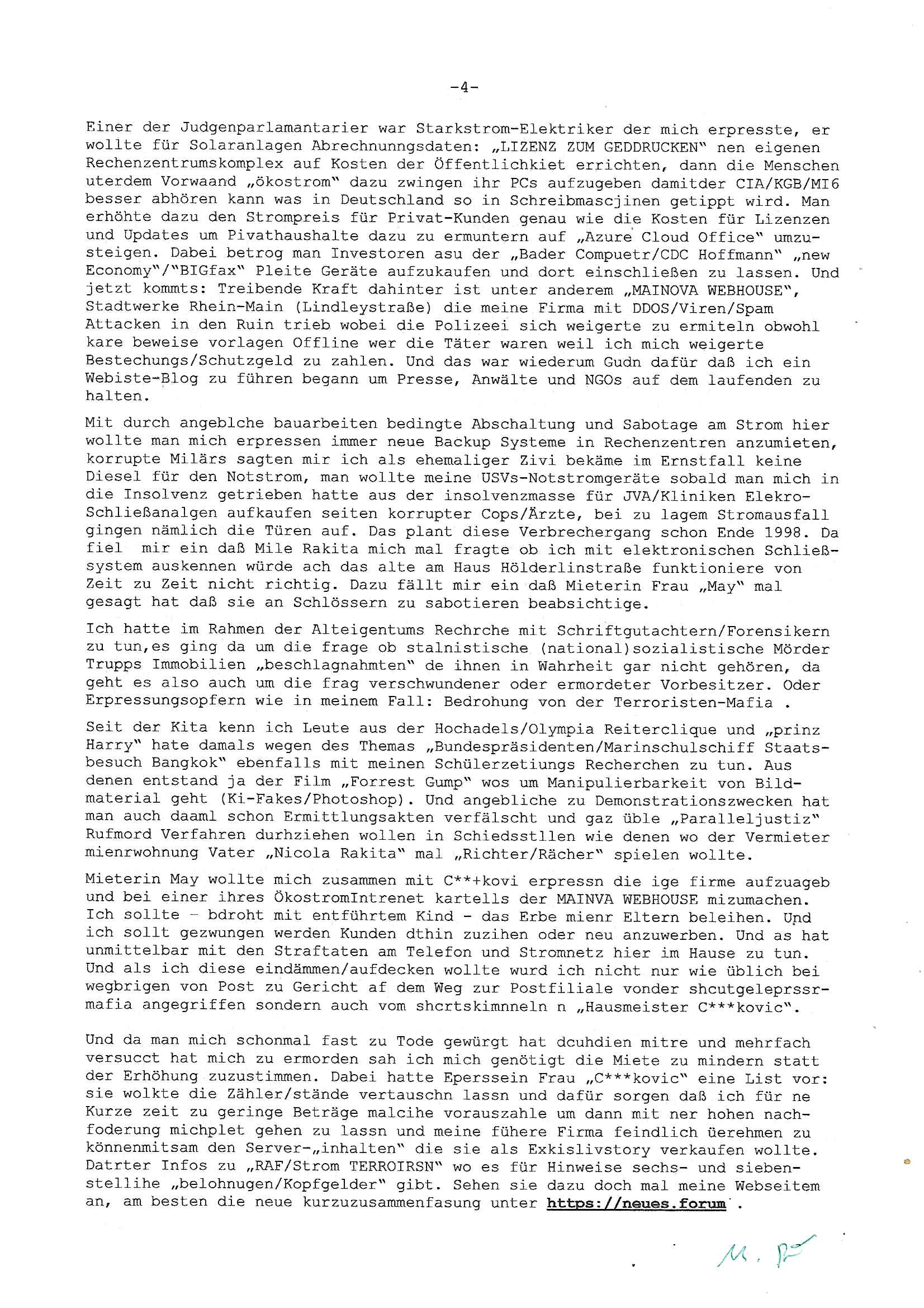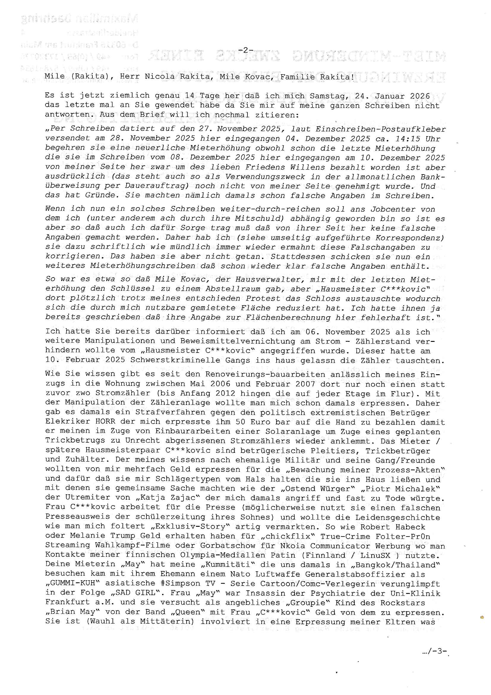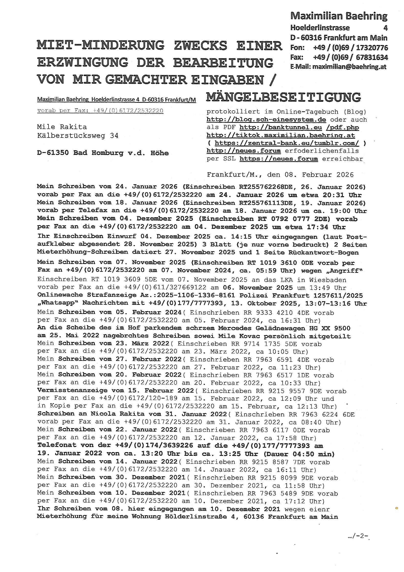ERZWINGUNG DER BEARBEITUNG VON MIR GEMACHTER EINGABEN / MÄNGELBESEITIGUNG Maximilian Baehring Hoelderlinstrasse 4 D-60316 Frankfurt/M vorab per Fax: +49/(0)6172/2532220 Mile Rakita Kälberstücksweg 34 D-61350 Bad Homburg v.d. Höhe protokolliert im Online-Tagebuch (Blog) http://blog.sch-einesystem.de oder auch als PDF http://banktunnel.eu /pdf.php http://tiktok.maximilian.baehring.at ( https://zentral-bank.eu/tumblr.com/ ) http://neues.forum erfoderlichenfalls per SSL https://neues.forum erreichbar Frankfurt/M., den 08. Februar 2026 Mein Schreiben vom 24. Januar 2026 (Einschreiben RT255762268DE, 26. Januar 2026) vorab per Fax an die +49/(0)6172/2532220 am 24. Januar 2026 um etwa 20:31 Uhr Mein Schreiben vom 18. Januar 2026 (Einschreiben RT255761113DE, 19. Januar 2026) vorab per Telefax an die +49/(0)6172/2532220 am 18. Januar 2026 um ca. 19:00 Uhr Mein Schreiben vom 04. Dezember 2025 (Einschreiben RT 0792 0777 2DE) vorab per Fax an die +49/(0)6172/2532220 am 04. Dezember 2025 um etwa 17:34 Uhr Ihr Einschreiben Einwurf 04. Dezember 2025 ca. 14:15 Uhr eingegangen (laut Post-aufkleber abgesendet 28. November 2025) 3 Blatt (je nur vorne bedruckt) 2 Seiten Mieterhöhung-Schreiben datiert 27. November 2025 und 1 Seite Rückantwort-Bogen Mein Schreiben vom 07. November 2025 (Einschreiben RT 1019 3610 0DE vorab per Fax an +49/(0)6172/2532220 am 07. November 2024, ca. 05:59 Uhr) wegen „Angriff“ Einschreiben RT 1019 3609 5DE vom 07. November 2025 an das LKA in Wiesbaden vorab per Fax an die +49/(0)611/327669122 am 06. November 2025 um 13:49 Uhr Onlinewache Strafanzeige Az.:2025-1106-1336-8161 Polizei Frankfurt 1257611/2025 „Whatsapp“ Nachrichten mit +49/(0)177/7777393, 13. Oktober 2025, 13:07–13:16 Uhr Mein Schreiben vom 05. Februar 2024( Einschrieben RR 9333 4210 4DE vorab per Fax an die +49/(0)6172/2532220 am 05. Februar 2024, ca 16:31 Uhr) An die Scheibe des im Hof parkendem schrzem Mercedes Gelädnewagen HG XX 9500 am 25. Mai 2022 nagebrchtes Schreiben sowei Mile Kovac persönlich mitgeteilt Mein Schreiben vom 23. März 2022( Einschrieben RR 9714 1735 5DE vorab per Fax an die +49/(0)6172/2532220 am 23. März 2022, ca 10:05 Uhr) Mein Schreiben vom 27. Februar 2022( Einschrieben RR 7963 6591 4DE vorab per Fax an die +49/(0)6172/2532220 am 27. Februar 2022, ca 11:23 Uhr) Mein Schreiben vom 20. Februar 2022( Einschrieben RR 7963 6517 1DE vorab per Fax an die +49/(0)6172/2532220 am 20. Februar 2022, ca 10:33 Uhr) Vermisstenanzeige vom 15. Februar 2022( Einschrieben RR 9215 9557 9DE vorab per Fax an die +49/(0)6172/120-189 am 15. Februar 2022, ca 12:09 Uhr und in Kopie per Fax an die +49/(0)6172/2532220 am 15. Februar, ca 12:13 Uhr) Schreiben an Nicola Rakita vom 31. Januar 2022( Einschrieben RR 7963 6224 6DE vorab per Fax an die +49/(0)6172/2532220 am 31. Januar 2022, ca 08:40 Uhr) Mein Schreiben vom 22. Januar 2022( Einschrieben RR 7963 6117 0DE vorab per Fax an die +49/(0)6172/2532220 am 12. Januar 2022, ca 17:58 Uhr) Telefonat von der +49/(0)174/3639226 auf die +49/(0)177/7777393 am 19. Januar 2022 von ca. 13:20 Uhr bis ca. 13:25 Uhr (Dauer 04:50 min) Mein Schreiben vom 14. Januar 2022( Einschrieben RR 9215 8587 7DE vorab per Fax an die +49/(0)6172/2532220 am 14. Jnauar 2022, ca 16:11 Uhr) Mein Schreiben vom 30. Dezember 2021( Einschrieben RR 9215 8099 9DE vorab per Fax an die +49/(0)6172/2532220 am 30. Dezember 2021, ca 11:58 Uhr) Mein Schreiben vom 10. Dezember 2021( Einschrieben RR 7963 5489 9DE vorab per Fax an die +49/(0)6172/2532220 am 10. Dezember 2021, ca 17:12 Uhr) Ihr Schreiben vom 08. hier eingegangen am 10. Dezemebr 2021 wegen eienr Mieterhöhung für meine Wohnung Hölderlinstraße 4, 60136 Frankfurt am Main Mile (Rakita), Herr Nicola Rakita, Mile Kovac, Familie Rakita! Es ist jetzt ziemlich genau 14 Tage her daß ich mich Samstag, 24. Januar 2026 das letzte mal an Sie gewendet habe da Sie mir auf meine ganzen Schreiben nicht antworten. Aus dem Brief will ich nochmal zitieren: „Per Schreiben datiert auf den 27. November 2025, laut Einschreiben-Postaufkleber versendet am 28. November 2025 hier eingegangen 04. Dezember 2025 ca. 14:15 Uhr begehren sie eine neuerliche Mieterhöhung obwohl schon die letzte Mieterhöhung die sie im Schreiben vom 08. Dezember 2025 hier eingegangen am 10. Dezember 2025 von meiner Seite her zwar um des lieben Friedens Willens bezahlt worden ist aber ausdrücklich (das steht auch so als Verwendungszweck in der allmonatlichen Bank-überweisung per Dauerauftrag) noch nicht von meiner Seite genehmigt wurde. Und das hat Gründe. Sie machten nämlich damals schon falsche Angaben im Schreiben. Wenn ich nun ein solches Schreiben weiter-durch-reichen soll ans Jobcenter von dem ich (unter anderem ach durch ihre Mitschuld) abhängig geworden bin so ist es aber so daß auch ich dafür Sorge trag muß daß von ihrer Seit her keine falsche Angaben gemacht werden. Daher hab ich (siehe umseitig aufgeführte Korrespondenz) sie dazu schriftlich wie mündlich immer wieder ermahnt diese Falschangaben zu korrigieren. Das haben sie aber nicht getan. Stattdessen schicken sie nun ein weiteres Mieterhöhungschreiben daß schon wieder klar falsche Angaben enthält. So war es etwa so daß Mile Kovac, der Hausverwalter, mir mit der letzten Miet-erhöhung den Schlüssel zu einem Abstellraum gab, aber „Hausmeister C***kovic“ dort plötzlich trotz meines entschieden Protest das Schloss austauschte wodurch sich die durch mich nutzbare gemietete Fläche reduziert hat. Ich hatte ihnen ja bereits geschrieben daß ihre Angabe zur Flächenberechnung hier fehlerhaft ist.“ Ich hatte Sie bereits darüber informiert daß ich am 06. November 2025 als ich weitere Manipulationen und Beweismittelvernichtung am Strom - Zählerstand ver-hindern wollte vom „Hausmeister C***kovic“ angegriffen wurde. Dieser hatte am 10. Februar 2025 Schwerstkriminelle Gangs ins haus gelassn die Zähler tauschten. Wie Sie wissen gibt es seit den Renoveirungs-bauarbeiten anlässlich meines Ein-zugs in 