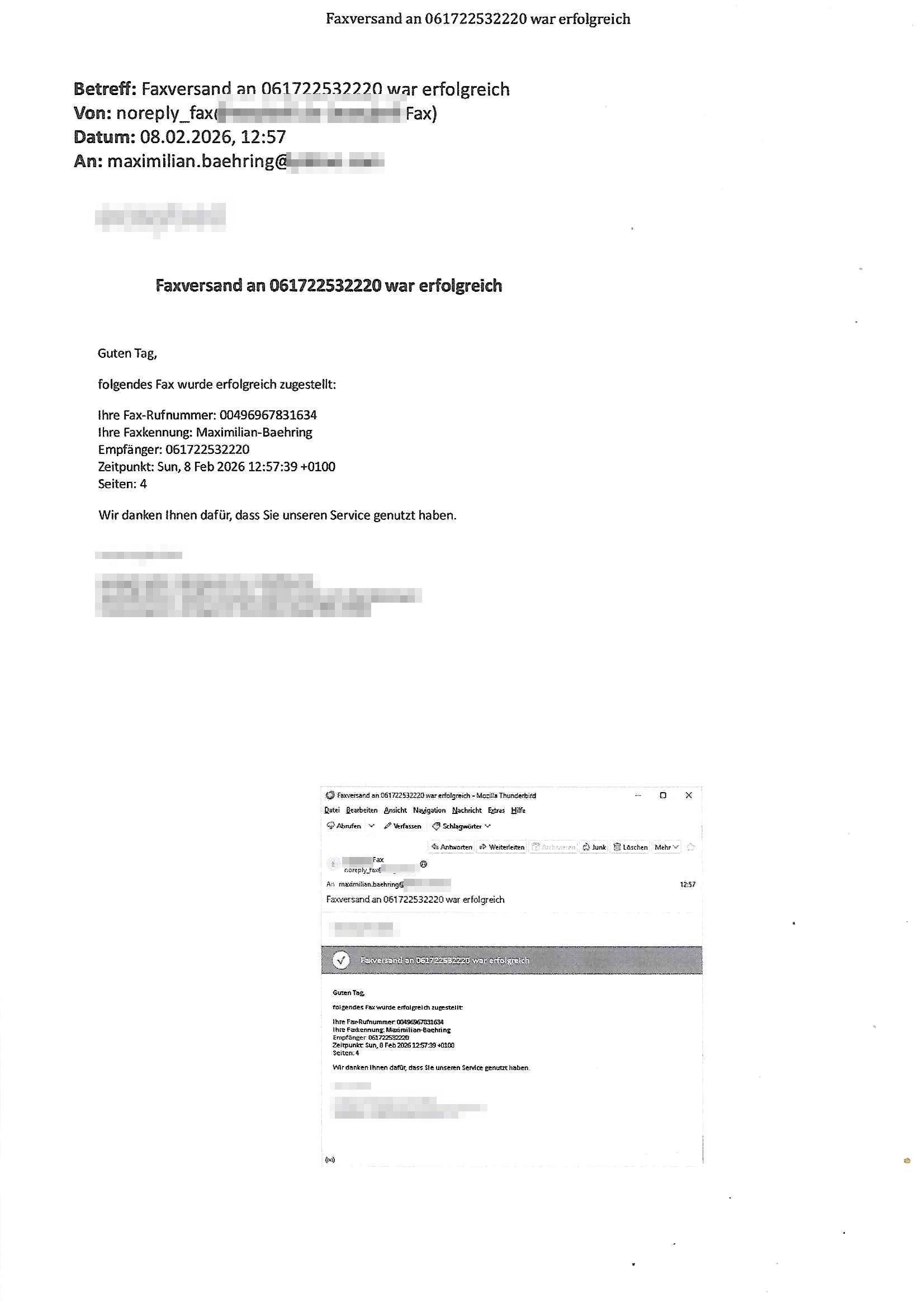 Betreff: Faxversand an 061722532220 war erfolgreich Datum: Sun, 08 Feb 2026 11:57:39 +0000 (UTC) Von: Fax <noreply_fax@> An: maximilian.baehring@ Web2Fax Faxversand an 061722532220 war erfolgreich Guten Tag, folgendes Fax wurde erfolgreich zugestellt: Ihre Fax-Rufnummer: 00496967831634 Ihre Faxkennung: Maximilian-Baehring Empfänger: 061722532220 Zeitpunkt: Sun, 8 Feb 2026 12:57:39 +0100 Seiten: 4 Wir danken Ihnen dafür, dass Sie unseren Service genutzt haben. | |