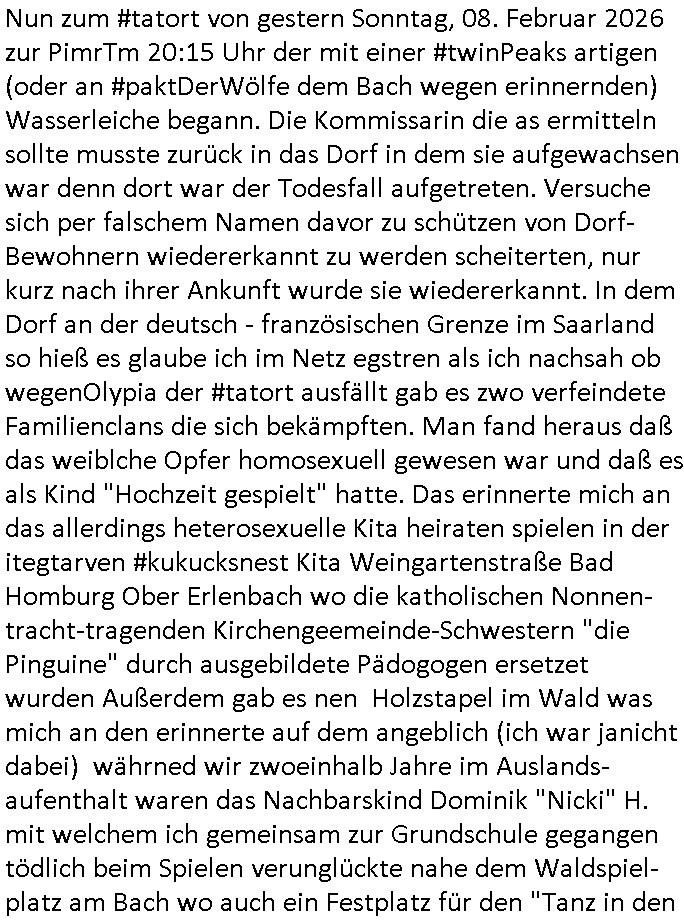 | Nun zum #tatort von gestern Sonntag, 08. Februar 2026 zur PimrTm 20:15 Uhr der mit einer #twinPeaks artigen (oder an #paktDerWölfe dem Bach wegen erinnernden) Wasserleiche begann. Die Kommissarin die as ermitteln sollte musste zurück in das Dorf in dem sie aufgewachsen war denn dort war der Todesfall aufgetreten. Versuche sich per falschem Namen davor zu schützen von Dorf- Bewohnern wiedererkannt zu werden scheiterten, nur kurz nach ihrer Ankunft wurde sie wiedererkannt. In dem Dorf an der deutsch - französischen Grenze im Saarland so hieß es glaube ich im Netz egstren als ich nachsah ob wegenOlypia der #tatort ausfällt gab es zwo verfeindete Familienclans die sich bekämpften. Man fand heraus daß das weiblche Opfer homosexuell gewesen war und daß es als Kind "Hochzeit gespielt" hatte. Das erinnerte mich an das allerdings heterosexuelle Kita heiraten spielen in der itegtarven #kukucksnest Kita Weingartenstraße Bad Homburg Ober Erlenbach wo die katholischen Nonnen-tracht-tragenden Kirchengeemeinde-Schwestern "die Pinguine" durch ausgebildete Pädogogen ersetzet wurden Außerdem gab es nen Holzstapel im Wald was mich an den erinnerte auf dem angeblich (ich war janicht dabei) währned wir zwoeinhalb Jahre im Auslands-aufenthalt waren das Nachbarskind Dominik "Nicki" H. mit welchem ich gemeinsam zur Grundschule gegangen tödlich beim Spielen verunglückte nahe dem Waldspiel-platz am Bach wo auch ein Festplatz für den "Tanz in den