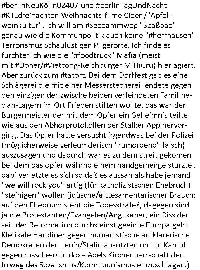 Mai" (vgl. Euro-Maitanz-Platz) war und am Hang ein Polizei(-mediziner)/Sicher-heitsdienste Aus-bildungs Übungsgelände die mit "scrited reality" Bildern dieser Übungen Statisten erpresste und zwar um Geld in fom der Übeschreibung von "Immobilen", "Aktien" und "Exclusivstory Film-urheberrechten" mittels derer man Veröfflichungen (seieeh Herrhausen/Marineschulschiff und Bundes-präsidentene Staatsbesuch) unterbindet. Der #tatort Film war so langwielg daß ich am Ende einnickte. Es sollte da wohl um den Kampaf der Katholiken und der Protestanten gegeneinader gehen um das Recht auf Ehe-scheidung und die 68er Revolte für s*xuelle Freiheit wie die Rechte von (#brokeBackMountain) Homosexuellen. Am Ende kam heraus daß das Opfer mittels ner "Stalker- App" auf dem Smartphone überwacht worden war. Und die lieferte dann die entscheidenden Hinweise. Im Dorf gab es ien Fest das mich an die "Ober - Erlenbacher" Kerb erinnert hat die setets eine Woche nach dem Latrinenfest in Bad Homburg's Stadtmitte stattfand an dem Festplatz am Untertor nahe "HEXENKESSEL" und "STEAKHOUSE" bekant aus dem BLOGk H_MBURG KIDNAPPING Prozess. Ich fidne man sollt dengstronomendie gshcäftstägekiet, das geschcäftsmodell generieren von Einnahmen von den Opfern herunter untersagen indem man ihre Geldwäsche Betriebe dichtmacht. Siehe auch: "Wo BART seinen Most" (Kinderjargon "Wurmbrühe") holt das Sport-Vereinsheim in Ober-Erlenbach bekannt aus den Serien #berlinNeuKölln02407 und #berlinTagUndNacht #RTLdreinachten Weihnachts-filme Cider /"Apfel-weinkultur". Ich will am #Seedammweg "Spaßbad" genau wie die Kommunpolitik auch keine "#herrhausen"-Terrorismus Schaulustigen Pilgerorte. Ich finde es fürchterlich wie die "#foodtruck" Mafia (meist mit #Döner/#Vietcong-Reichbürger MiHiGru) hier agiert. Aber zurück zum #tatort. Bei dem Dorffest gab es eine Schlägerei die mit einer Messerstecherei endete gegen den einzigen der zwische beiden verfeindeten Familine-clan-Lagern im Ort Frieden stiften wollte, das war der Bürgermeister der mit dem Opfer ein Geheimnis teilte wie aus den Abhörprotokollen der Stalker App hervor- ging. Das Opfer hatte versucht irgendwas bei der Polizei (möglicherweise verleumderisch "rumordend" falsch) auszusagen und dadurch war es zu dem streit gekomen bei dem das opfer währnd einem handgemenge stürzte . dabi verletzte es sich so daß es aussah als habe jemand "we will rock you" artig (für katholizistschen Ehebruch) "steinigen" wollen (jdüsche/alttesamentarischer Brauch: auf den Ehebruch steht die Todesstrafe?, dagegen sind ja die Protestanten/Evangelen/Anglikaner, ein Riss der seit der Reformation durchs einst geeinte Europa geht: Klerikale Hardliner gegen humanistische aufklärerische Demokraten den Lenin/Stalin ausntzten um im Kampf gegen russche-othodoxe Adels Kirchenherrschaft den Irrweg des Sozalismus/Kommuunismus einzuschlagen.) Also defitiv kein Totschlag oder Mord, eher ein Unfall von Kindern/Jugedlcihen die miteiander spielten. Aber das interessierte die (religiösen?) Hetzer im Dorf nicht. Die hatten nur eine Zile, die nächste blutige Schlägerei. https://tvinfo.de/fernsehprogramm/2280571169-tatort | |