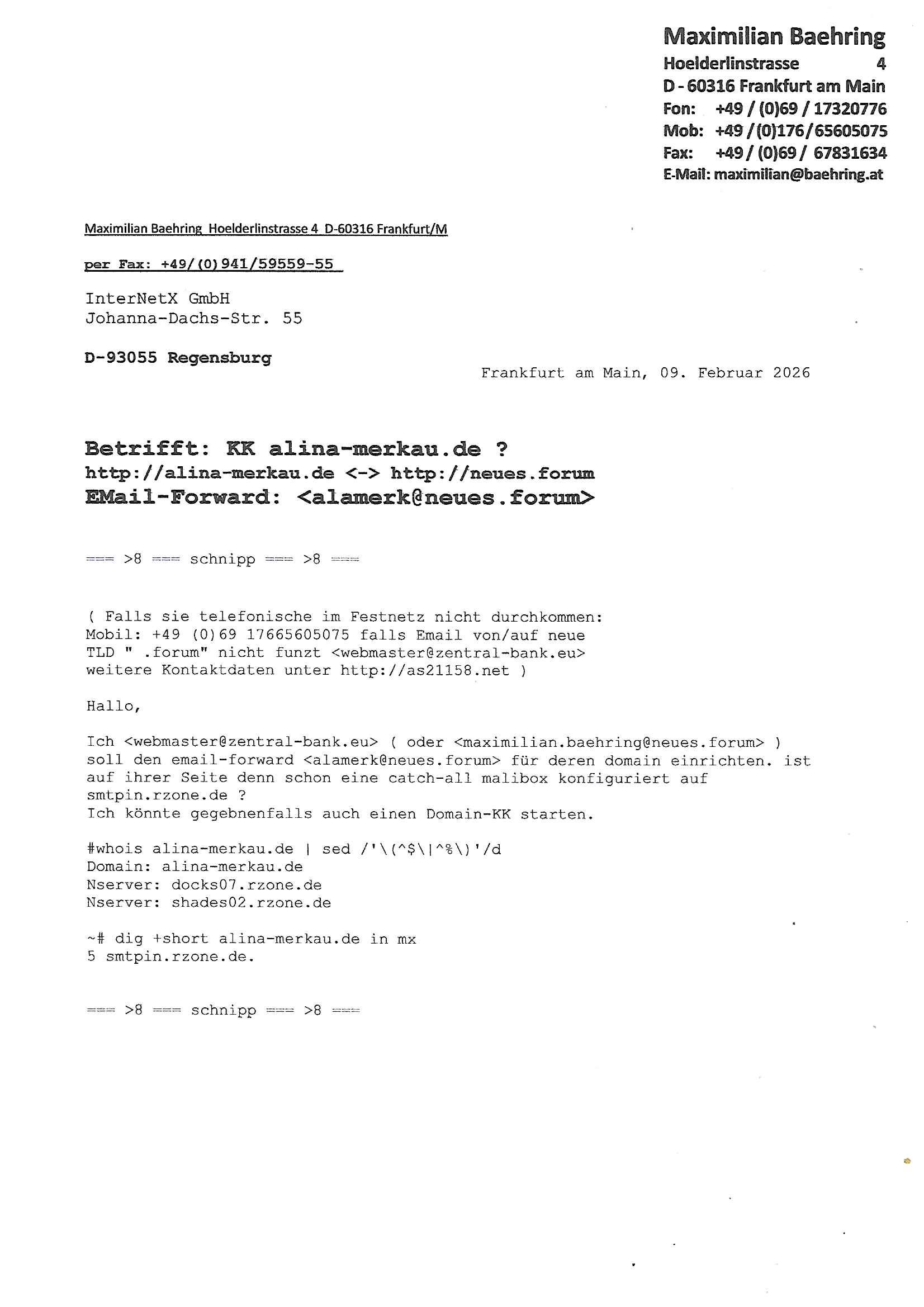 per Fax: +49/(0)941/59559-55 InterNetX GmbH Johanna-Dachs-Str. 55 D-93055 Regensburg Frankfurt am Main, 09. Februar 2026 Betrifft: KK alina-merkau.de ? http://alina-merkau.de <-> http://neues.forum EMail-Forward: <alamerk@neues.forum> === >8 === schnipp === >8 === ( Falls sie telefonische im Festnetz nicht durchkommen: Mobil: +49 (0)69 17665605075 falls Email von/auf neue TLD " .forum" nicht funzt <webmaster@zentral-bank.eu> weitere Kontaktdaten unter http://as21158.net ) Hallo, Ich <webmaster@zentral-bank.eu> ( oder <maximilian.baehring@neues.forum> ) soll den email-forward <alamerk@neues.forum> für deren domain einrichten. ist auf ihrer Seite denn schon eine catch-all malibox konfiguriert auf smtpin.rzone.de ? Ich könnte gegebnenfalls auch einen Domain-KK starten. #whois alina-merkau.de | sed /'\(^$\|^%\)'/d Domain: alina-merkau.de Nserver: docks07.rzone.de Nserver: shades02.rzone.de ~# dig +short alina-merkau.de in mx 5 smtpin.rzone.de. === >8 === schnipp === >8 === | |