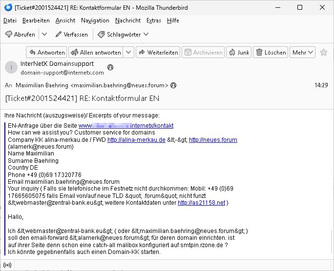 Betreff: [Ticket#2001524421] RE: Kontaktformular EN Datum: Mon, 9 Feb 2026 13:29:43 +0000 Von: InterNetX Domainsupport <domain-support@internetx.com> Organisation: InterNetX GmbH An: Maximilian Baehring <maximilian.baehring@neues.forum> Subject: AutoReply: "Kontaktformular EN" Sehr geehrte Damen und Herren, vielen Dank für Ihre Anfrage. Dieser wurde die folgende Nummer zugeordnet: [Ticket#2001524421] Wir werden Ihre E-Mail umgehend beantworten, eine Antwort auf diese Nachricht ist nicht erforderlich. Bitte achten Sie darauf, dass beim weiteren Gesprächsverlauf die oben genannte Ticket-Nummer in der Betreffzeile erhalten bleibt und auch Ihre an uns gesendeten Faxe diese Nummer enthalten. So können wir Ihre Anfrage jederzeit korrekt zuordnen. Mit freundlichen Grüßen, Ihr Team Domain Services [...] -- InterNetX GmbH Team Domain Services *** *** Fax +49 941 59559-55 E-Mail: domains@internetx.com internetx.com • internetx.com/linkedin • internetx.com/twitter Alle Kontaktmöglichkeiten finden Sie unter: http://www.***/kontakt.html < http://www.***/kontakt.html > Geschäftsführer: [...] ------------------------------------------------------------------------- Ihre Nachricht (auszugsweise)/ Excerpts of your message: > EN-Anfrage über die Seite www.internetx.com/internetx/kontakt > <http://www.internetx.com/internetx/kontakt> > How can we assist you? Customer service for domains > Company KK alina-merkau.de / FWD http://alina-merkau.de > < http://alina-merkau.de > <-> http://neues.forum > < http://neues.forum > > (alamerk@neues.forum) > Name Maximilian > Surname Baehring > Country DE > Phone +49 (0)69 17320776 > Email maximilian.baehring@neues.forum > Your inquiry ( Falls sie telefonische im Festnetz nicht durchkommen: > Mobil: +49 (0)69 > 17665605075 falls Email von/auf neue TLD " .forum" nicht funzt > <webmaster@zentral-bank.eu> weitere Kontaktdaten unter > http://as21158.net < http://as21158.net > ) > > Hallo, > > Ich <webmaster@zentral-bank.eu> ( oder > <maximilian.baehring@neues.forum> ) > soll den email-forward <alamerk@neues.forum> für deren domain > einrichten. ist > auf ihrer Seite denn schon eine catch-all malibox konfiguriert auf > smtpin.rzone.de ? > Ich könnte gegebnenfalls auch einen Domain-KK starten. -------- Nachricht -------- Betreff: Re: [Ticket#2001524421] RE: Kontaktformular EN Datum: Mon, 9 Feb 2026 16:00:45 +0100 Von: webmaster@zentral-bank.eu <webmaster@zentral-bank.eu> An: InterNetX Domainsupport <domain-support@internetx.com> Danke! <webmaster@zentral-bank.eu> === Maximilian Baehring Hoelderlinstrasse 4 D-60316 Frankfurt/M [...] | |