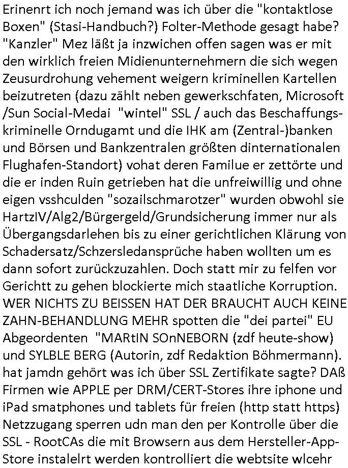 | Erinenrt ich noch jemand was ich über die "kontaktlose Boxen" (Stasi-Handbuch?) Folter-Methode gesagt habe? "Kanzler" Mez läßt ja inzwichen offen sagen was er mit den wirklich freien Midienunternehmern die sich wegen Zeusurdrohung vehement weigern kriminellen Kartellen beizutreten (dazu zählt neben gewerkschfaten, Microsoft /Sun Social-Medai "wintel" SSL / auch das Beschaffungs-kriminelle Orndugamt und die IHK am (Zentral-)banken und Börsen und Bankzentralen größten dinternationalen Flughafen-Standort) vohat deren Familue er zettörte und die er inden Ruin getrieben hat die unfreiwillig und ohne eigen vsshculden "sozailschmarotzer" wurden obwohl sie HartzIV/Alg2/Bürgergeld/Grundsicherung immer nur als Übergangsdarlehen bis zu einer gerichtlichen Klärung von Schadersatz/Schzersledansprüche haben wollten um es dann sofort zurückzuzahlen. Doch statt mir zu felfen vor Gerichtt zu gehen blockierte mich staatliche Korruption. WER NICHTS ZU BEISSEN HAT DER BRAUCHT AUCH KEINE ZAHN-BEHANDLUNG MEHR spotten die "dei partei" EU Abgeordenten "MARtIN SOnNEBORN (zdf heute-show) und SYLBLE BERG (Autorin, zdf Redaktion Böhmermann). hat jamdn gehört was ich über SSL Zertifikate sagte? DAß Firmen wie APPLE per DRM/CERT-Stores ihre iphone und iPad smatphones und tablets für freien (http statt https) Netzzugang sperren udn man den per Kontrolle über die SSL - RootCAs die mit Browsern aus dem Hersteller-App-Store instalelrt werden kontrolliert die webtsite wlcehr