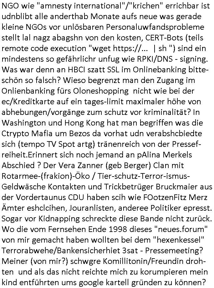 NGO wie "amnesty international"/"krichen" errichbar ist udnblibt alle anderthab Monate aufs neue was gerade kleine NGOs vor unlösbaren Personaluwfandsprobleme stellt lal nagz abagshn von den kosten, CERT-Bots (teils remote code execution "wget https://... | sh ") sind ein mindestens so gefährlichr unfug wie RPKI/DNS - signing. Was war denn an HBCI szatt SSL im Onlinebanking bitte-schön so falsch? Wieso begrenzt man den Zugang im Onlienbanking fürs Oloneshopping nicht wie bei der ec/Kreditkarte auf ein tages-limit maximaler höhe von abhebungen/vorgänge zum schutz vor kriminalität? In Washington und Hong Kong hat man begriffen was die Ctrypto Mafia um Bezos da vorhat udn verabshcbiedte sich (tempo TV Spot artg) tränenreich von der Pressef-reiheit.Erinnert sich noch jemand an pAlina Merkels Abschied ? Der Vera Zanner (geb Berger) Clan mit Rotarmee-(frakion)-Öko / Tier-schutz-Terror-ismus-Geldwäsche Kontakten und Trickbetrüger Bruckmaier aus der Vordertaunus CDU haben scih wie FOotzenFitz Merz Ämter eshclcihen, Jouranlisten, anderee Politiker epresst. Sogar vor Kidnapping schreckte diese Bande nicht zurück. Wo die vom Fernsehen Ende 1998 dieses "neues.forum" von mir gemacht haben wollten bei dem "hexenkessel" Terrorabwehe/Bankensicherhiet 3sat - Pressemeeting? Meiner (von mir?) schwgre Komillitonin/Freundin droh-ten und als das nicht reichte mich zu korumpieren mein kind entführten ums google kartell gründen zu können? Damit Fraun Männer und ihre Familien nicht ausplündern indem sie diese gen ihren Willen in Kriege schicken gab es in der guten alten Zeit bevor das Massenmorden begann keinerlei Wahlrecht für Damen (von der partnerwahl mal abgeshen) und kein Erbrecht. Das war an die Wehrpflicht (hilfs/ersatzweise Zivil[-schutzorga-]dienst[e]) gekoppelt. Fraun sind wie Sprtwettenmaniplaerende Zuschauerinnen bei "pulp fiction" Kidnapping) "Donde esta el Zapateria" Boxkämpfen, sie gewinnen (grudnesitz) wenn sie andere dazu bringen sich ohe evrfidnet zu sien aufs Maul zu hauen, Männer, für interessen die nicht die ihren sind. Seit wann gehört die ehemalige Habsburger - Monarchie Ukraine also das neueral ÖSTERREICH denn zur Nato ? Wir erinnern uns: "B(ritish)P(etrol)" und das OPE-Kartell (die vom Abrtgebernverband Streich-zoo) wollten den Öl udn Gas marktneu ordne sagte "Sophie v. d. Tann" damals beim Metallgesellschaft ÖL Ostgebiete und Juden Aktien Alteigum Skandal Sprengstoffanschlag auf Herrhausen. Die Araber wollten die Ukraine und Krim Atom U-Boote und die Gaszprom/North-Stream Pipelines kontrolliren als die friedliche Revolution 1989 die Chance bot Gorbtshow mit dem Olgarchen Geld wegzuputschen. Udn die Herzl Anhäger (Zionisten) uetrden Juden wollten Palästnenser uriwohner aus ihrem Uriwnohner Heimat-land vertreiben um da zu siedeln. Daß sie da biblosch altetestamentarisch begründete Gebietsansprüche hätten fiel ihen erst wider ein als man den aut-Morot erfand und es einen riesen bedraf nach Öl das über schiffahrts-routen an Israel vorbei aus dem nahen Osten kam gab. Wie hieß nochml dieser saghaft reiche griechsiche Öltaker Reeder der Präsident Kenndey seine Ex-Frau übernahm nachdem deider emrodet worden war? Der mit dem extravaganten Polster-matrial seiner Privat-yacht Barhocker wenn man den legend glauben darf? Ab der Erfindung leichter Auto-motoren die Motorflug ermöglichten udn Öl/benzin oft aus dem Ausland statt heischer Kohle bchten ging es ja noch viel rasanter weiter mit der industriellen Revolution wie zur Zet der Erfindung von Dampfmaschine und Eisenbahn. Dann folgten zeitnah Raumfahrt und Computer - Chips. Das nächste große Ding war danach das WWW. Azubi "Sophie v. d. Tann" mit ihrem "hero Turtles" brustpanzer und Stahlhelm beim Teror-anschlag . "Good morning starshine" Meeting! War die das nicht die mir ekrlärt hat daß ich mit meinen zwoeinhalb jahren Rohstoffdistrie-Auslandsaufenthalt in Asien vom Orient zu wenig Ahnung hätte da sie da irgnwas studiert hat an irgnedeiner uni? die waren fats so gut wie die obslcok besucher die für west-feidnender-fernsehen keine GEZ Gebühren berappen aber Peter Maffay Tatiemen wollten wiel er einen Song von Karat neu betextet hatte. oder inert sich noch jamdn an diese ossie öko-spinner ("bei uns kam über tschernobyl nix im TV") die von der kirche imwestn videokameras gschenkt bakmn und bitterfeld -vidos fürs wetsfrshenaus drehten? https://www.bild.de/politik/inland/zahnarzt-zoff-haut-voll-rein-merz-gibt-cdu-einen-maulkorb-befehl-6989be273a693ad9bdb6f4da https://www.tagesschau.de/ausland/asien/jimmy-lai-verurteilt-hongkong-demokratieaktivst-100.html https://www.tagesschau.de/ausland/amerika/washington-post-verleger-100.html https://www.youtube.com/user/TempoDeutschland https://www.bild.de/leben-wissen/sparfochs/fischer-air-verbraucherschuetzer-warnen-vor-dubioser-airline-6984521911f814aba2551f81 | |