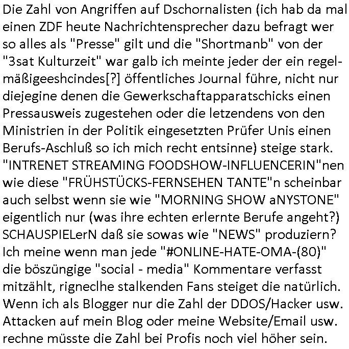 | Die Zahl von Angriffen auf Dschornalisten (ich hab da mal einen ZDF heute Nachrichtensprecher dazu befragt wer so alles als "Presse" gilt und die "Shortmanb" von der "3sat Kulturzeit" war galb ich meinte jeder der ein regel-mäßigeeshcindes[?] öffentliches Journal führe, nicht nur diejegine denen die Gewerkschaftapparatschicks einen Pressausweis zugestehen oder die letzendens von den Ministrien in der Politik eingesetzten Prüfer Unis einen Berufs-Aschluß so ich mich recht entsinne) steige stark. "INTRENET STREAMING FOODSHOW-INFLUENCERIN"nen wie diese "FRÜHSTÜCKS-FERNSEHEN TANTE"n scheinbar auch selbst wenn sie wie "MORNING SHOW aNYSTONE" eigentlich nur (was ihre echten erlernte Berufe angeht?) SCHAUSPIELerN daß sie sowas wie "NEWS" produziern? Ich meine wenn man jede "#ONLINE-HATE-OMA-(80)" die böszüngige "social - media" Kommentare verfasst mitzählt, rigneclhe stalkenden Fans steiget die natürlich. Wenn ich als Blogger nur die Zahl der DDOS/Hacker usw. Attacken auf mein Blog oder meine Website/Email usw. rechne müsste die Zahl bei Profis noch viel höher sein.