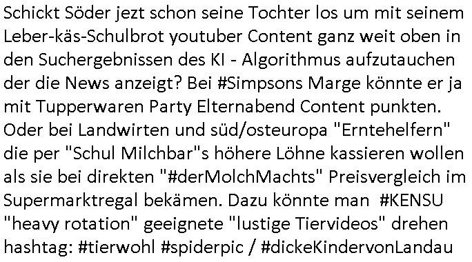 | Schickt Söder jezt schon seine Tochter los um mit seinem Leber-käs-Schulbrot youtuber Content ganz weit oben in den Suchergebnissen des KI - Algorithmus aufzutauchen der die News anzeigt? Bei #Simpsons Marge könnte er ja mit Tupperwaren Party Elternabend Content punkten. Oder bei Landwirten und süd/osteuropa "Erntehelfern" die per "Schul Milchbar"s höhere Löhne kassieren wollen als sie bei direkten "#derMolchMachts" Preisvergleich im Supermarktregal bekämen. Dazu könnte man #KENSU "heavy rotation" geeignete "lustige Tiervideos" drehen hashtag: #tierwohl #spiderpic / #dickeKindervonLandau
