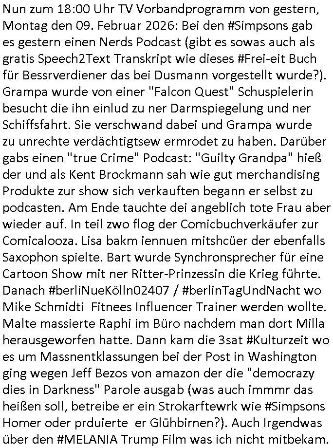 | Nun zum 18:00 Uhr TV Vorbandprogramm von gestern, Montag den 09. Februar 2026: Bei den #Simpsons gab es gestern einen Nerds Podcast (gibt es sowas auch als gratis Speech2Text Transkript wie dieses #Frei-eit Buch für Bessrverdiener das bei Dusmann vorgestellt wurde?). Grampa wurde von einer "Falcon Quest" Schuspielerin besucht die ihn einlud zu ner Darmspiegelung und ner Schiffsfahrt. Sie verschwand dabei und Grampa wurde zu unrechte verdächtigtsew ermrodet zu haben. Darüber gabs einen "true Crime" Podcast: "Guilty Grandpa" hieß der und als Kent Brockmann sah wie gut merchandising Produkte zur show sich verkauften begann er selbst zu podcasten. Am Ende tauchte dei angeblich tote Frau aber wieder auf. In teil zwo flog der Comicbuchverkäufer zur Comicalooza. Lisa bakm iennuen mitshcüer der ebenfalls Saxophon spielte. Bart wurde Synchronsprecher für eine Cartoon Show mit ner Ritter-Prinzessin die Krieg führte. Danach #berliNueKölln02407 / #berlinTagUndNacht wo Mike Schmidti Fitnees Influencer Trainer werden wollte. Malte massierte Raphi im Büro nachdem man dort Milla herausgeworfen hatte. Dann kam die 3sat #Kulturzeit wo es um Massnentklassungen bei der Post in Washington ging wegen Jeff Bezos von amazon der die "democrazy dies in Darkness" Parole ausgab (was auch immmr das heißen soll, betreibe er ein Strokarftewrk wie #Simpsons Homer oder prduierte er Glühbirnen?). Auch Irgendwas über den #MELANIA Trump Film was ich nicht mitbekam.