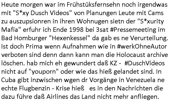 | Heute morgen war im Frühstüksfernsehn noch irgendwas mit "S*xy Dusch Videos" von Planungen Leute mit Cams zu auszupsionren in ihren Wohnugen sietn der "S*xurity Mafia" erfuhr ich Ende 1998 bei 3sat #Pressemeeting im Bad Homburger "Hexenkessel" da gab es ne Verurteilung. Ist doch Prima wenn Aufnahmen wie in #werkOhneAutor verboten sind denn dann kann man die Holocaust archive löschen. hab mich eh gewundert daß KZ - #DuschVideos nicht auf "youporn" oder wie das hieß gelandet sind. In Cuba gibt inzwischen wgen dr Vorgänge in Venezuela ne echte Flugbenzin - Krise hieß es in den Nachrichten die dazu führe daß Airlines das Land nicht mehr anfliegen.