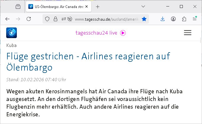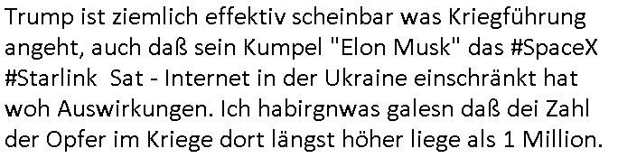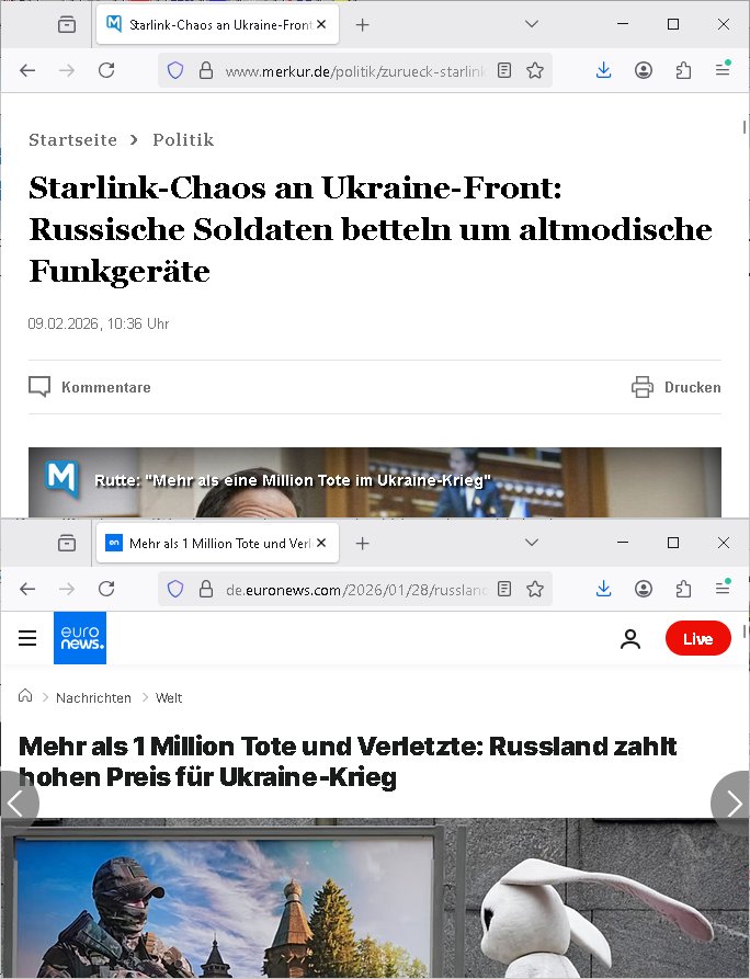 Trump ist ziemlich effektiv scheinbar was Kriegführung angeht, auch daß sein Kumpel "Elon Musk" das #SpaceX #Starlink Sat - Internet in der Ukraine einschränkt hat woh Auswirkungen. Ich habirgnwas galesn daß dei Zahl der Opfer im Kriege dort längst höher liege als 1 Million. https://www.tagesschau.de/ausland/amerika/kuba-treibstoffmangel-aircanada-100.html https://www.merkur.de/politik/zurueck-starlink-abschaltung-wirft-russische-soldaten-in-die-finsternis-zr-94159309.html https://de.euronews.com/2026/01/28/russland-ukraine-krieg-putin-selenskyj https://tvinfo.de/fernsehprogramm/2299006375-sat-1-fruehstuecksfernsehen | |