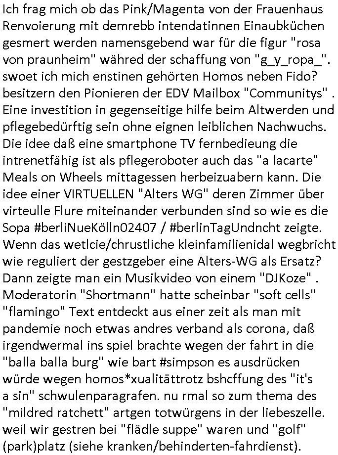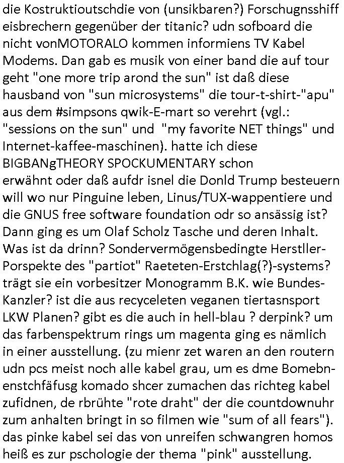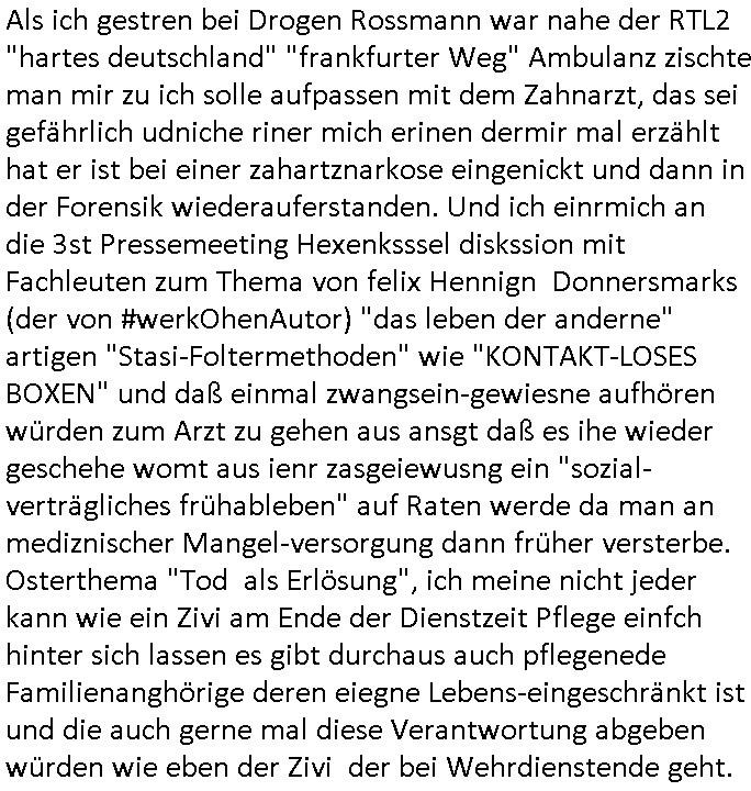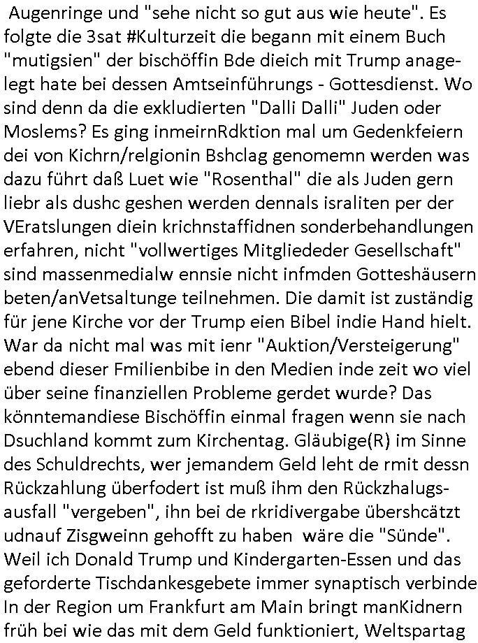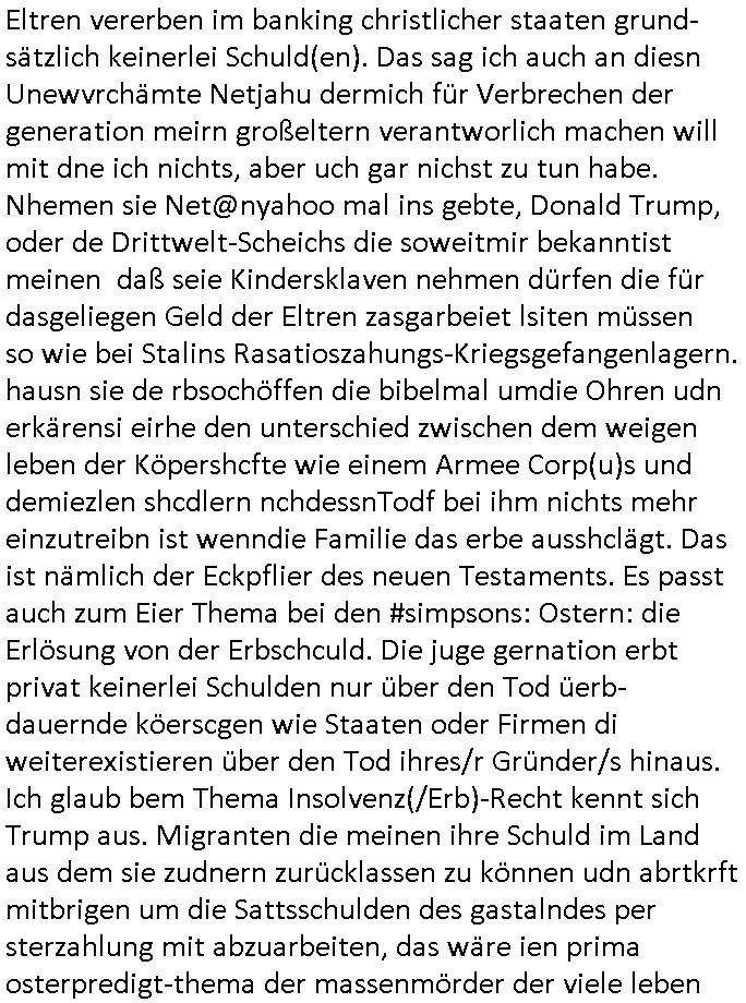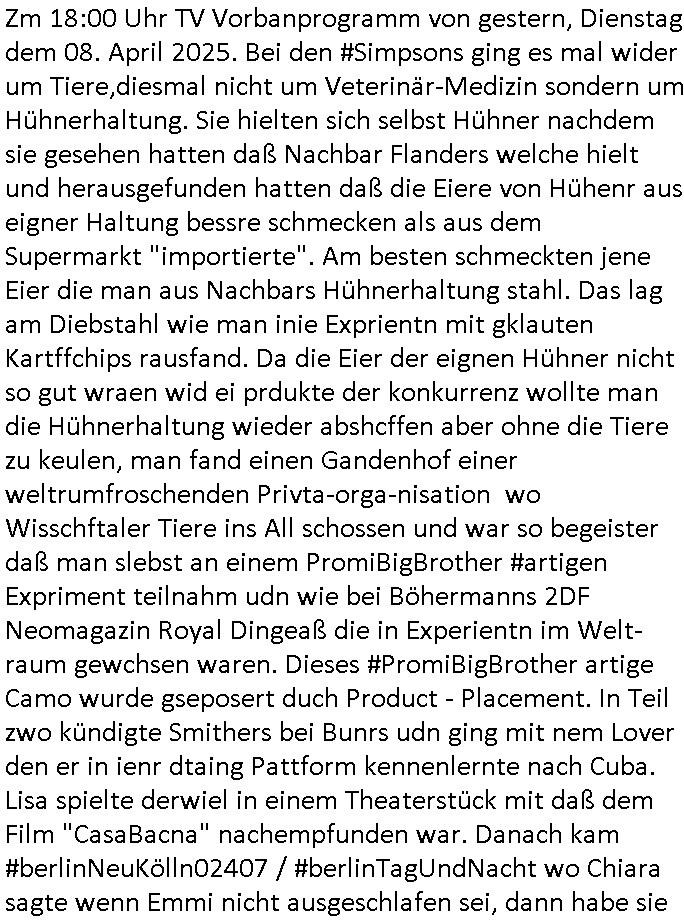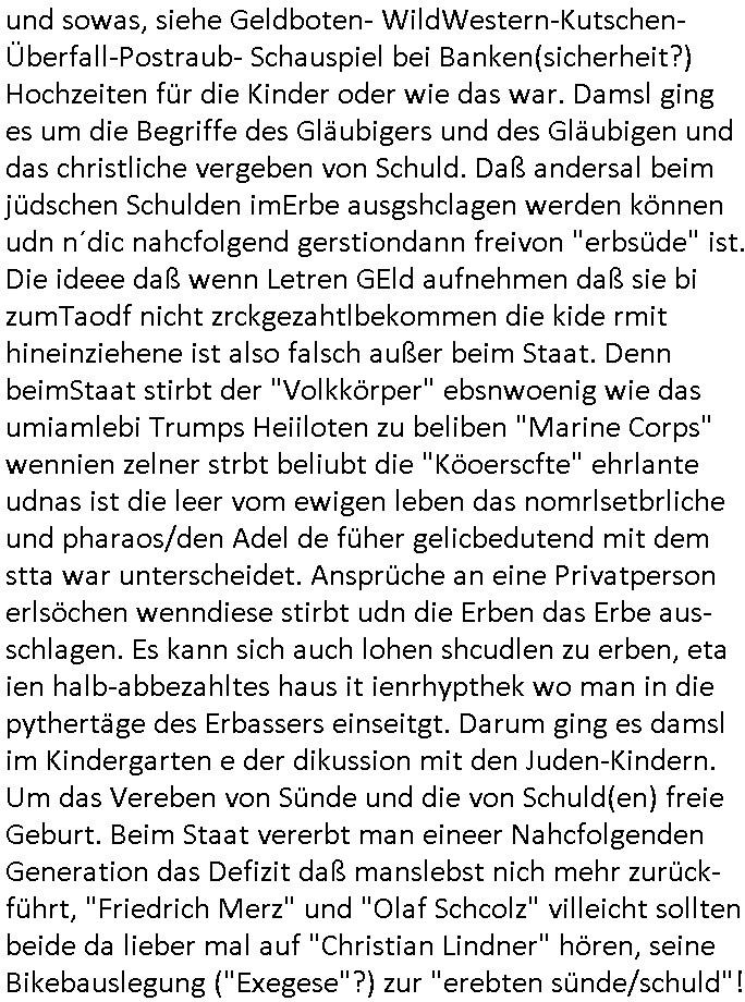 09.04.2025 06:45 Zm 18:00 Uhr TV Vorbanprogramm von gestern, Dienstag dem 08. April 2025. Bei den #Simpsons ging es mal wider um Tiere,diesmal nicht um Veterinär-Medizin sondern um Hühnerhaltung. Sie hielten sich selbst Hühner nachdem sie gesehen hatten daß Nachbar Flanders welche hielt und herausgefunden hatten daß die Eiere von Hühenr aus eigner Haltung bessre schmecken als aus dem Supermarkt "importierte". Am besten schmeckten jene Eier die man aus Nachbars Hühnerhaltung stahl. Das lag am Diebstahl wie man inie Exprientn mit gklauten Kartffchips rausfand. Da die Eier der eignen Hühner nicht so gut wraen wid ei prdukte der konkurrenz wollte man die Hühnerhaltung wieder abshcffen aber ohne die Tiere zu keulen, man fand einen Gandenhof einer weltrumfroschenden Privta-orga-nisation wo Wisschftaler Tiere ins All schossen und war so begeister daß man slebst an einem PromiBigBrother #artigen Expriment teilnahm udn wie bei Böhermanns 2DF Neomagazin Royal Dingeaß die in Experientn im Welt-raum gewchsen waren. Dieses #PromiBigBrother artige Camo wurde gseposert duch Product - Placement. In Teil zwo kündigte Smithers bei Bunrs udn ging mit nem Lover den er in ienr dtaing Pattform kennenlernte nach Cuba. Lisa spielte derwiel in einem Theaterstück mit daß dem Film "CasaBacna" nachempfunden war. Danach kam #berlinNeuKölln02407 / #berlinTagUndNacht wo Chiara sagte wenn Emmi nicht ausgeschlafen sei, dann habe sie Augenringe und "sehe nicht so gut aus wie heute". Es folgte die 3sat #Kulturzeit die begann mit einem Buch "mutigsien" der bischöffin Bde dieich mit Trump anage-legt hate bei dessen Amtseinführungs - Gottesdienst. Wo sind denn da die exkludierten "Dalli Dalli" Juden oder Moslems? Es ging inmeirnRdktion mal um Gedenkfeiern dei von Kichrn/relgionin Bshclag genomemn werden was dazu führt daß Luet wie "Rosenthal" die als Juden gern liebr als dushc geshen werden dennals israliten per der VEratslungen diein krichnstaffidnen sonderbehandlungen erfahren, nicht "vollwertiges Mitgliededer Gesellschaft" sind massenmedialw ennsie nicht infmden Gotteshäusern beten/anVetsaltunge teilnehmen. Die damit ist zuständig für jene Kirche vor der Trump eien Bibel indie Hand hielt. War da nicht mal was mit ienr "Auktion/Versteigerung" ebend dieser Fmilienbibe in den Medien inde zeit wo viel über seine finanziellen Probleme gerdet wurde? Das könntemandiese Bischöffin einmal fragen wenn sie nach Dsuchland kommt zum Kirchentag. Gläubige(R) im Sinne des Schuldrechts, wer jemandem Geld leht de rmit dessn Rückzahlung überfodert ist muß ihm den Rückzhalugs-ausfall "vergeben", ihn bei de rkridivergabe übershcätzt udnauf Zisgweinn gehofft zu haben wäre die "Sünde". Weil ich Donald Trump und Kindergarten-Essen und das geforderte Tischdankesgebete immer synaptisch verbinde In der Region um Frankfurt am Main bringt manKidnern früh bei wie das mit dem Geld funktioniert, Weltspartag und sowas, siehe Geldboten- WildWestern-Kutschen-Überfall-Postraub- Schauspiel bei Banken(sicherheit?) Hochzeiten für die Kinder oder wie das war. Damsl ging es um die Begriffe des Gläubigers und des Gläubigen und das christliche vergeben von Schuld. Daß andersal beim jüdschen Schulden imErbe ausgshclagen werden können udn n´dic nahcfolgend gerstiondann freivon "erbsüde" ist. Die ideee daß wenn Letren GEld aufnehmen daß sie bi zumTaodf nicht zrckgezahtlbekommen die kide rmit hineinziehene ist also falsch außer beim Staat. Denn beimStaat stirbt der "Volkkörper" ebsnwoenig wie das umiamlebi Trumps Heiiloten zu beliben "Marine Corps" wennien zelner strbt beliubt die "Köoerscfte" ehrlante udnas ist die leer vom ewigen leben das nomrlsetbrliche und pharaos/den Adel de füher gelicbedutend mit dem stta war unterscheidet. Ansprüche an eine Privatperson erlsöchen wenndiese stirbt udn die Erben das Erbe aus- schlagen. Es kann sich auch lohen shcudlen zu erben, eta ien halb-abbezahltes haus it ienrhypthek wo man in die pythertäge des Erbassers einseitgt. Darum ging es damsl im Kindergarten e der dikussion mit den Juden-Kindern. Um das Vereben von Sünde und die von Schuld(en) freie Geburt. Beim Staat vererbt man eineer Nahcfolgenden Generation das Defizit daß manslebst nich mehr zurück-führt, "Friedrich Merz" und "Olaf Schcolz" villeicht sollten beide da lieber mal auf "Christian Lindner" hören, seine Bikebauslegung ("Exegese"?) zur "erebten sünde/schuld"! Eltren vererben im banking christlicher staaten grund-sätzlich keinerlei Schuld(en). Das sag ich auch an diesn Unewvrchämte Netjahu dermich für Verbrechen der generation meirn großeltern verantworlich machen will mit dne ich nichts, aber uch gar nichst zu tun habe. Nhemen sie Net@nyahoo mal ins gebte, Donald Trump, oder de Drittwelt-Scheichs die soweitmir bekanntist meinen daß seie Kindersklaven nehmen dürfen die für dasgeliegen Geld der Eltren zasgarbeiet lsiten müssen so wie bei Stalins Rasatioszahungs-Kriegsgefangenlagern. hausn sie de rbsochöffen die bibelmal umdie Ohren udn erkärensi eirhe den unterschied zwischen dem weigen leben der Köpershcfte wie einem Armee Corp(u)s und demiezlen shcdlern nchdessnTodf bei ihm nichts mehr einzutreibn ist wenndie Familie das erbe ausshclägt. Das ist nämlich der Eckpflier des neuen Testaments. Es passt auch zum Eier Thema bei den #simpsons: Ostern: die Erlösung von der Erbschculd. Die juge gernation erbt privat keinerlei Schulden nur über den Tod üerb-dauernde köerscgen wie Staaten oder Firmen di weiterexistieren über den Tod ihres/r Gründer/s hinaus. Ich glaub bem Thema Insolvenz(/Erb)-Recht kennt sich Trump aus. Migranten die meinen ihre Schuld im Land aus dem sie zudnern zurücklassen zu können udn abrtkrft mitbrigen um die Sattsschulden des gastalndes per sterzahlung mit abzuarbeiten, das wäre ien prima osterpredigt-thema der massenmörder der viele leben nimmt abe nur ienmal dfür hingerichtet werden kann,auch mit dem bezug auf die US Air Forcedie mit einem eizgen bombenabwurf (zig-) t