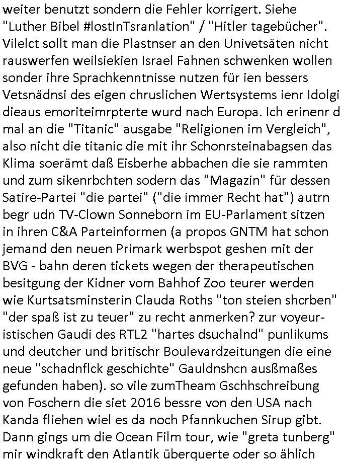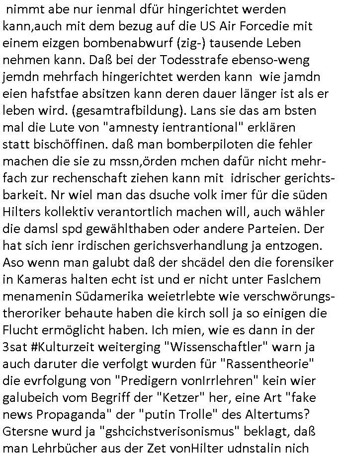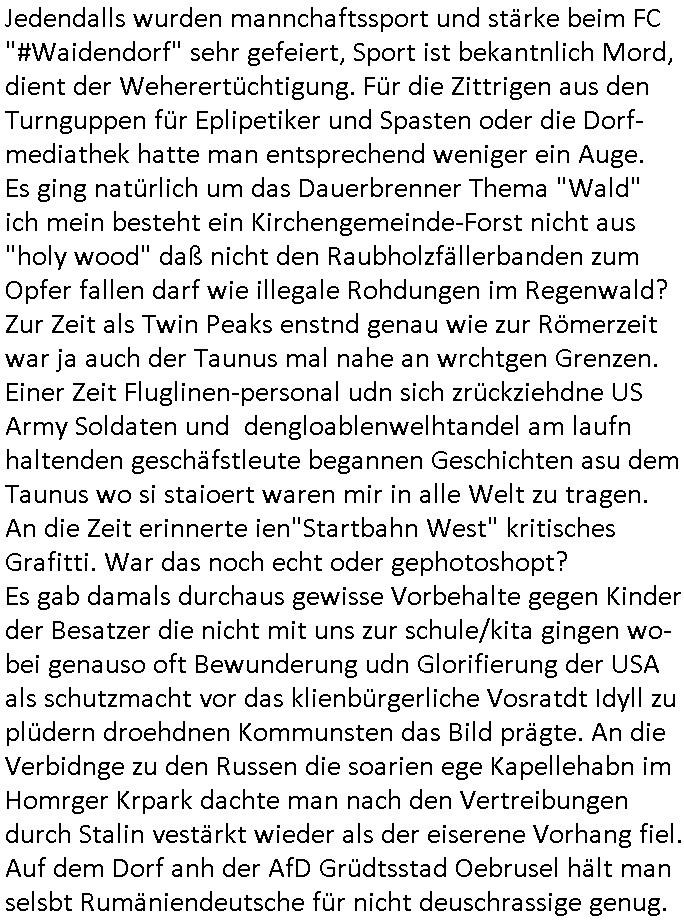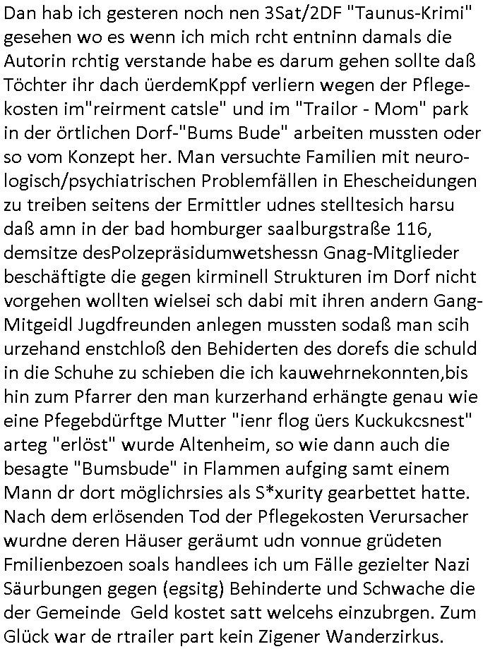 09.04.2025 14:30 Dan hab ich gesteren noch nen 3Sat/2DF "Taunus-Krimi" gesehen wo es wenn ich mich rcht entninn damals die Autorin rchtig verstande habe es darum gehen sollte daß Töchter ihr dach üerdemKppf verliern wegen der Pflege-kosten im"reirment catsle" und im "Trailor - Mom" park in der örtlichen Dorf-"Bums Bude" arbeiten mussten oder so vom Konzept her. Man versuchte Familien mit neuro-logisch/psychiatrischen Problemfällen in Ehescheidungen zu treiben seitens der Ermittler udnes stelltesich harsu daß amn in der bad homburger saalburgstraße 116, demsitze desPolzepräsidumwetshessn Gnag-Mitglieder beschäftigte die gegen kirminell Strukturen im Dorf nicht vorgehen wollten wielsei sch dabi mit ihren andern Gang- Mitgeidl Jugdfreunden anlegen mussten sodaß man scih urzehand enstchloß den Behiderten des dorefs die schuld in die Schuhe zu schieben die ich kauwehrnekonnten,bis hin zum Pfarrer den man kurzerhand erhängte genau wie eine Pfegebdürftge Mutter "ienr flog üers Kuckukcsnest" arteg "erlöst" wurde Altenheim, so wie dann auch die besagte "Bumsbude" in Flammen aufging samt einem Mann dr dort möglichrsies als S*xurity gearbettet hatte. Nach dem erlösenden Tod der Pflegekosten Verursacher wurdne deren Häuser geräumt udn vonnue grüdeten Fmilienbezoen soals handlees ich um Fälle gezielter Nazi Säurbungen gegen (egsitg) Behinderte und Schwache die der Gemeinde Geld kostet satt welcehs einzubrgen. Zum Glück war de rtrailer part kein Zigener Wanderzirkus. Jedendalls wurden mannchaftssport und stärke beim FC "#Waidendorf" sehr gefeiert, Sport ist bekantnlich Mord, dient der Weherertüchtigung. Für die Zittrigen aus den Turnguppen für Eplipetiker und Spasten oder die Dorf-mediathek hatte man entsprechend weniger ein Auge. Es ging natürlich um das Dauerbrenner Thema "Wald" ich mein besteht ein Kirchengemeinde-Forst nicht aus "holy wood" daß nicht den Raubholzfällerbanden zum Opfer fallen darf wie illegale Rohdungen im Regenwald? Zur Zeit als Twin Peaks enstnd genau wie zur Römerzeit war ja auch der Taunus mal nahe an wrchtgen Grenzen. Einer Zeit Fluglinen-personal udn sich zrückziehdne US Army Soldaten und dengloablenwelhtandel am laufn haltenden geschäfstleute begannen Geschichten asu dem Taunus wo si staioert waren mir in alle Welt zu tragen. An die Zeit erinnerte ien"Startbahn West" kritisches Grafitti. War das noch echt oder gephotoshopt? Es gab damals durchaus gewisse Vorbehalte gegen Kinder der Besatzer die nicht mit uns zur schule/kita gingen wo-bei genauso oft Bewunderung udn Glorifierung der USA als schutzmacht vor das klienbürgerliche Vosratdt Idyll zu plüdern droehdnen Kommunsten das Bild prägte. An die Verbidnge zu den Russen die soarien ege Kapellehabn im Homrger Krpark dachte man nach den Vertreibungen durch Stalin vestärkt wieder als der eiserene Vorhang fiel. Auf dem Dorf anh der AfD Grüdtsstad Oebrusel hält man selsbt Rumäniendeutsche für nicht deuschrassige genug. https://www.tvinfo.de/fernsehprogramm/2087124415-im-wald-1-2-ein-taunuskrimi [0] "202504091430-0-1.jpg" [1] "202504091430-0-2.jpg" |