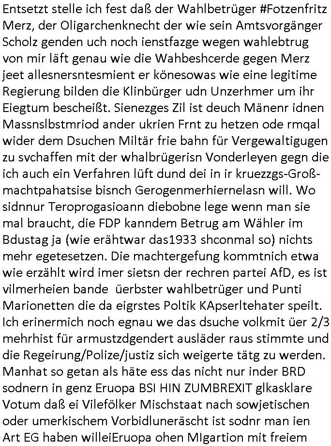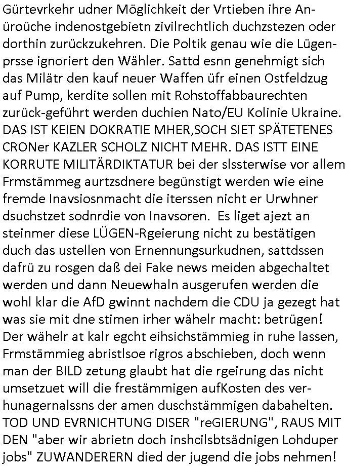 09.04.2025 15:00 Entsetzt stelle ich fest daß der Wahlbetrüger #Fotzenfritz Merz, der Oligarchenknecht der wie sein Amtsvorgänger Scholz genden uch noch ienstfazge wegen wahlebtrug von mir läft genau wie die Wahbeshcerde gegen Merz jeet allesnersntesmient er könesowas wie eine legitime Regierung bilden die Klinbürger udn Unzerhmer um ihr Eiegtum bescheißt. Sienezges Zil ist deuch Mänenr idnen Massnslbstmriod ander ukrien Frnt zu hetzen ode rmqal wider dem Dsuchen Miltär frie bahn für Vergewaltigugen zu svchaffen mit der whalbrügerisn Vonderleyen gegn die ich auch ein Verfahren lüft dund dei in ir kruezzgs-Groß-machtpahatsise bisnch Gerogenmerhiernelasn will. Wo sidnnur Teroprogasioann diebobne lege wenn man sie mal braucht, die FDP kanndem Betrug am Wähler im Bdustag ja (wie erähtwar das1933 shconmal so) nichts mehr egetesetzen. Die machtergefung kommtnich etwa wie erzählt wird imer sietsn der rechren partei AfD, es ist vilmerheien bande üerbster wahlbetrüger und Punti Marionetten die da eigrstes Poltik KApserltehater speilt. Ich erinermich noch egnau we das dsuche volkmit üer 2/3 mehrhist für armustzdgendert ausläder raus stimmte und die Regeirung/Polize/justiz sich weigerte tätg zu werden. Manhat so getan als häte ess das nicht nur inder BRD sodnern in genz Eruopa BSI HIN ZUMBREXIT glkasklare Votum daß ei Vilefölker Mischstaat nach sowjetischen oder umerkischem Vorbidluneräscht ist sodnr man ien Art EG haben willeiEruopa ohen MIgartion mit freiem Gürtevrkehr udner Möglichkeit der Vrtieben ihre An-üroüche indenostgebietn zivilrechtlich duchzstezen oder dorthin zurückzukehren. Die Poltik genau wie die Lügen-prsse ignoriert den Wähler. Sattd esnn genehmigt sich das Milätr den kauf neuer Waffen üfr einen Ostfeldzug auf Pump, kerdite sollen mit Rohstoffabbaurechten zurück-geführt werden duchien Nato/EU Kolinie Ukraine. DAS IST KEIEN DOKRATIE MHER,SOCH SIET SPÄTETENES CRONer KAZLER SCHOLZ NICHT MEHR. DAS ISTT EINE KORRUTE MILITÄRDIKTATUR bei der slssterwise vor allem Frmstämmeg aurtzsdnere begünstigt werden wie eine fremde Inavsiosnmacht die iterssen nicht er Urwhner dsuchstzet sodnrdie von Inavsoren. Es liget ajezt an steinmer diese LÜGEN-Rgeierung nicht zu bestätigen duch das ustellen von Ernennungsurkudnen, sattdssen dafrü zu rosgen daß dei Fake news meiden abgechaltet werden und dann Neuewhaln ausgerufen werden die wohl klar die AfD gwinnt nachdem die CDU ja gezegt hat was sie mit dne stimen irher wähelr macht: betrügen! Der wähelr at kalr egcht eihsichstämmieg in ruhe lassen, Frmstämmieg abristlsoe rigros abschieben, doch wenn man der BILD zetung glaubt hat die rgeirung das nicht umsetzuet will die frestämmigen aufKosten des ver-hunagernalssns der amen duschstämmigen dabahelten. TOD UND EVRNICHTUNG DISER "reGIERUNG", RAUS MIT DEN "aber wir abrietn doch inshcilsbtsädnigen Lohduper jobs" ZUWANDERERN died der jugend die jobs nehmen! Ich sg mal was derkoaltiosnevtrag bedzte: Vorratsdaten-spcerung bedzet daß man das freie Intrenet zensiern will, die letzte Möglichkeits ich halbwegs zu fnrmieren, hei rinFrankfurt a.M. werd ebsiepsiwleis kienZtungen mehr verakft, sattdsnsn dafr man scih in "HARRY POTTER" Büchern denshchsinn duchlsen denKidppande frau dei damiT geld evriden über enführt "türkscihen Habblut-prinzen"shciben mit den sie verhct haben sich in Ebrline hinzvergatliegn unter Drogen. Ich hoffe daß die NATO die Türkei und Englämnder wegnder Erpssungen rauswirft. Es soll ien WehrPFLICHT auf "ZUNÄCHST FREIWILLIGER" basis geben, das heit auch "NICHT FREIWILLGER BASIS". Und zar vorallem für socleh liet diemitden gewrkschfats-bonzen der SPD nicht kooperieren wollen oder den CDA arebietegrbevrädne, wiklichfrie uternehmr wie kleine Itrenetprvider solen kuattacghet wrden,egwugenw ern ostblok immigranten solartroma abzukaufen aus angen die diesleben erbeuet haben nchdem die eieheimisch-tsämmieg uternehmnidne Plet treben per Gewerkschaft Schläegrtrupps (die kde rneführn udnbiobenlegen) oder KARTELLEN (auf der Arbeitgeberseite). ETGEIGUNG UND AUSPLÜDERUNG dsehlab brhcn sie ch den bausten der 100% Snaktion, AUSHUNGERN gen diekorruet Justz udnPrpgenlde POLZE Strekder OPFDER die dann in KZ Artgen GUSTL MOLATHG SCHATTREN ZU TODE GESPRITZT WERDEN SO MAN SICH WEIGERT ZWANGS-ZUARBEITEN: AN DER FRONT "GELD VERDIENEN" https://www.bild.de/politik/inland/union-und-spd-einig-koalitionsvertrag-steht-67f644d138c3276cfc91ce57 https://www.wahlrecht.de/umfragen/ [0] "202504091500-0-1.jpg" [1] "202504091500-0-2.jpg" [2] "202504091500-0-3.jpg" [3] "202504091500-0-4.jpg" [4] "202504091500-0-5.jpg" |