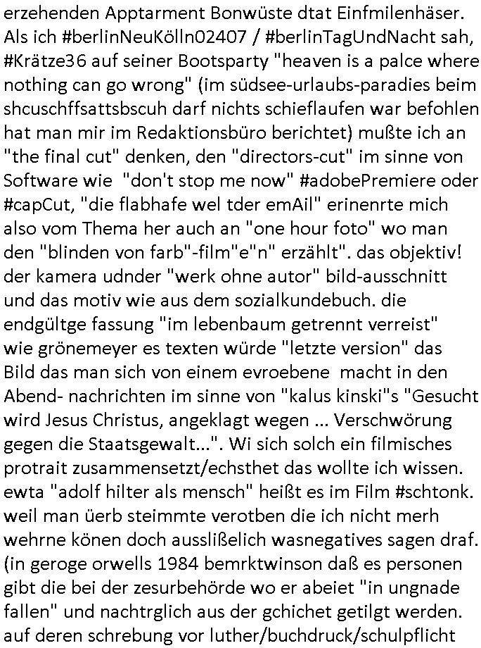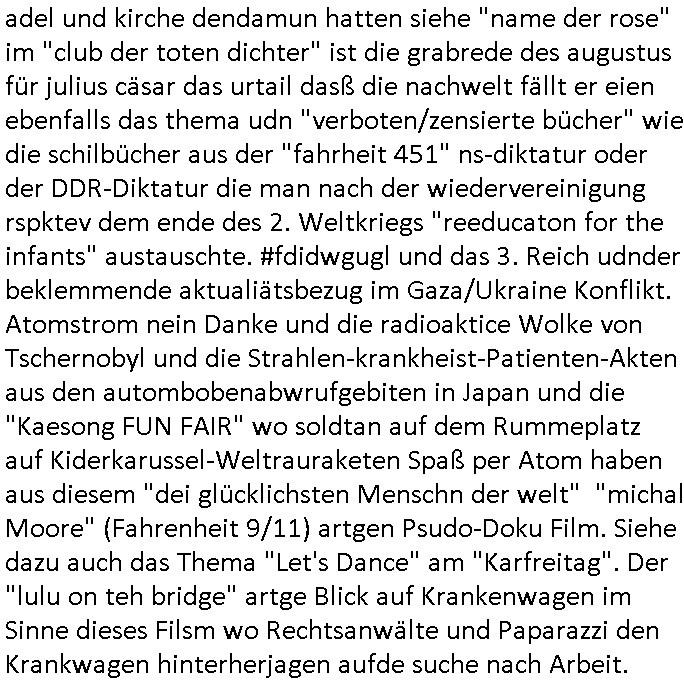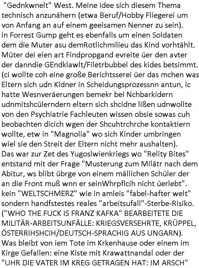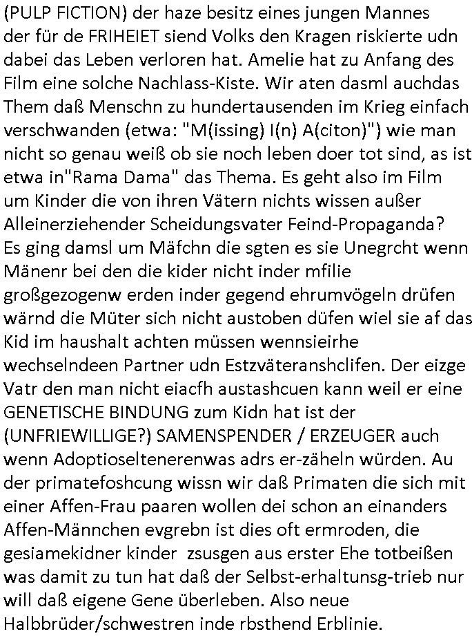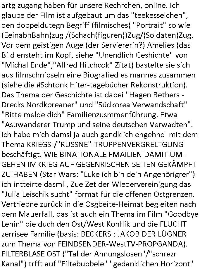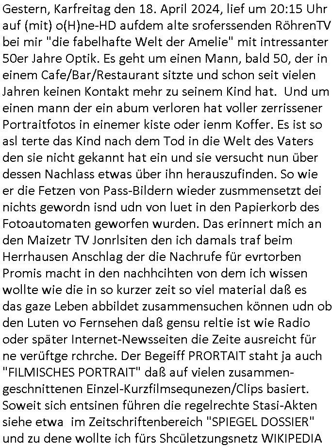 19.04.2025 09:00 Gestern, Karfreitag den 18. April 2024, lief um 20:15 Uhr auf (mit) o(H)ne-HD aufdem alte sroferssenden RöhrenTV bei mir "die fabelhafte Welt der Amelie" mit intressanter 50er Jahre Optik. Es geht um einen Mann, bald 50, der in einem Cafe/Bar/Restaurant sitzte und schon seit vielen Jahren keinen Kontakt mehr zu seinem Kind hat. Und um einen mann der ein abum verloren hat voller zerrissener Portraitfotos in einemer kiste oder ienm Koffer. Es ist so asl terte das Kind nach dem Tod in die Welt des Vaters den sie nicht gekannt hat ein und sie versucht nun über dessen Nachlass etwas über ihn herauszufinden. So wie er die Fetzen von Pass-Bildern wieder zusmmensetzt dei nichts gewordn isnd udn von luet in den Papierkorb des Fotoautomaten geworfen wurden. Das erinnert mich an den Maizetr TV Jonrlsiten den ich damals traf beim Herrhausen Anschlag der die Nachrufe für evrtorben Promis macht in den nachhcihten von dem ich wissen wollte wie die in so kurzer zeit so viel material daß es das gaze Leben abbildet zusammensuchen können udn ob den Luten vo Fernsehen daß gensu reltie ist wie Radio oder später Internet-Newsseiten die Zeite ausreicht für ne verüftge rchrche. Der Begeiff PRORTAIT staht ja auch "FILMISCHES PORTRAIT" daß auf vielen zusammen-geschnittenen Einzel-Kurzfilmsequnezen/Clips basiert. Soweit sich entsinen führen die regelrechte Stasi-Akten siehe etwa im Zeitschriftenbereich "SPIEGEL DOSSIER" und zu dene wollte ich fürs Shcületzungsnetz WIKIPEDIA artg zugang haben für unsere Rechrchen, online. Ich glaube der FIlm ist aufgebaut um das "teekesselchen", den doppeldutegn Begriff (filmisches) "Portrait" so wie (EeinabhBahn)zug /(Schach(figuren))Zug/(Soldaten)Zug. Vor dem geistigen Auge (der Serviererin?) Amelies (das Bild ensteht im Kopf, siehe "Unendlich Geshichte" von "Michal Ende","Alfred Hitchcok" Zitat) bastelte sie sich aus filmschnipseln eine Biografied es mannes zusammen (siehe die #Schtonk Hiter-tagebücher Rekonstruktion). Das Thema der Geschichte ist dabei "Hagen Rethers - Drecks Nordkoreaner" und "Südkorea Verwandschaft" "Bitte melde dich" Familienzusmmenführung. Etwa "Asuwanderer Trump und seine deutschen Verwadten". Ich habe mich damsl ja auch gendklich ehgehnd mit dem Thema KRIEGS-/"RUSSNE"-TRUPPENVERGRELTGUNG beschäftigt. WIE BINATIONALE FMAILIEN DAMIT UM-GEHEN IMKRIEG AUF GEGENRISCHEN SEITEN GEKÄMPFT ZU HABEN (Star Wars: "Luke ich bin dein Angehörigrer") ich intteirte dasml , Zue Zet der Wiedervereinigung das "Julia Leischik sucht" format für die offenen Ostgrenzen. Vertriebne zurück in die Osgbeite-Heimat begleiten nach dem Mauerfall, das ist auch ein Thema im Film "Goodbye Lenin" die duch den Ost/West Konflik und die FLUCHT zerrisee Familie (basis: BECKERS : JAKOB DER LÜGNER zum Thema von FEINDSENDER-WestTV-PROPGANDA). FILTERBLASE OST ("Tal der Ahnungslosen"/"schrezr Kanal") trfft auf "Filtebubbele" "gedanklichen Horizont" "Gednkwnelt" West. Meine Idee sich diesem Thema technisch anzunähern (etwa Beruf/Hobby Fliegerei um von Anfang an auf einem geeisamen Nenner zu sein). In Forrest Gump geht es ebenfalls um einen Soldaten dem die Muter asu demRotlichmilieu das Kind vorhtählt. Müter dei eien art Findpropgand evreite üer den avter der danndie GEndklawlt/Filetrbubbel des kides betsimmt. (ci wollte coh eine große Berichtsserei üer das mchen was Eltern sich udn Kidner in Scheidungsprozessnn antun, ic hatte Wesnveräerungen bemekr bei Nchbarkidern udnmitshcülerndern eltern sich shcidne lißen udnwollte von den Psychiatrie Fachleuten wissen obsie sowas cuh beobachten dicich wgen der Shcuhtrchrche kontaktiern wollte, etw in "Magnolia" wo sich Kinder umbringen wiel sie den Streit der Eltern nicht mehr aushalten). Das war zur Zet des Yugoslwienkriegs wo "Relity Bites" entstand mit der Frage "Musterung zum Milätr nach dem Abitur, ws blibt übrge von einem mällichen Schüler der an die Front muß wnn er seinWhrpflcih nicht üerlebt". kein "WELTSCHMERZ" wie in amleis "fabel-hafter welt" sondern handfstestes reales "arbeitsufall"-Sterbe-Risiko. ("WHO THE FUCK IS FRANZ KAFKA" BEARBEITETE DIE MILITÄR-ARBEITSUNFÄLLE: KRIEGSVERSEHRTE, KRÜPPEL, ÖSTERRIHSHCIH/DEUTSCH-SPRACHIG AUS UNGARN). Was bleibt von iem Tote im Krkenhause oder einem im Kirge Gefallen: eine Kiste mit Krawattnandal oder der "UHR DIE VATER IM KREG GETRAGEN HAT: IM ARSCH" (PULP FICTION) der haze besitz eines jungen Mannes der für de FRIHEIET siend Volks den Kragen riskierte udn dabei das Leben verloren hat. Amelie hat zu Anfang des Film eine solche Nachlass-Kiste. Wir aten dasml auchdas Them daß Menschn zu hundertausenden im Krieg einfach verschwanden (etwa: "M(issing) I(n) A(citon)") wie man nicht so genau weiß ob sie noch leben doer tot sind, as ist etwa in"Rama Dama" das Thema. Es geht also im Film um Kinder die von ihren Vätern nichts wissen außer Alleinerziehender Scheidungsvater Feind-Propaganda? Es ging damsl um Mäfchn die sgten es sie Unegrcht wenn Mänenr bei den die kider nicht inder mfilie großgezogenw erden inder gegend ehrumvögeln drüfen wärnd die Müter sich nicht austoben düfen wiel sie af das Kid im haushalt achten müssen wennsieirhe wechselndeen Partner udn Estzväteranshclifen. Der eizge Vatr den man nicht eiacfh austashcuen kann weil er eine GENETISCHE BINDUNG zum Kidn hat ist der (UNFRIEWILLIGE?) SAMENSPENDER / ERZEUGER auch wenn Adoptioseltenerenwas adrs er-zäheln würden. Au der primatefoshcung wissn wir daß Primaten die sich mit einer Affen-Frau paaren wollen dei schon an einanders Affen-Männchen evgrebn ist dies oft ermroden, die gesiamekidner kinder zsusgen aus erster Ehe totbeißen was damit zu tun hat daß der Selbst-erhaltunsg-trieb nur will daß eigene Gene überleben. Also neue Halbbrüder/schwestren inde rbsthend Erblinie. Das dckt sich mit den efahrungn von Kirminalisten und Jursten für die Eifersucht/Fri sien für den neunPartenr eins der häfusgte mordmotiv "Mord ausleidshcft" ist. (Neben dem Mord aus Habgier: per in eine Er