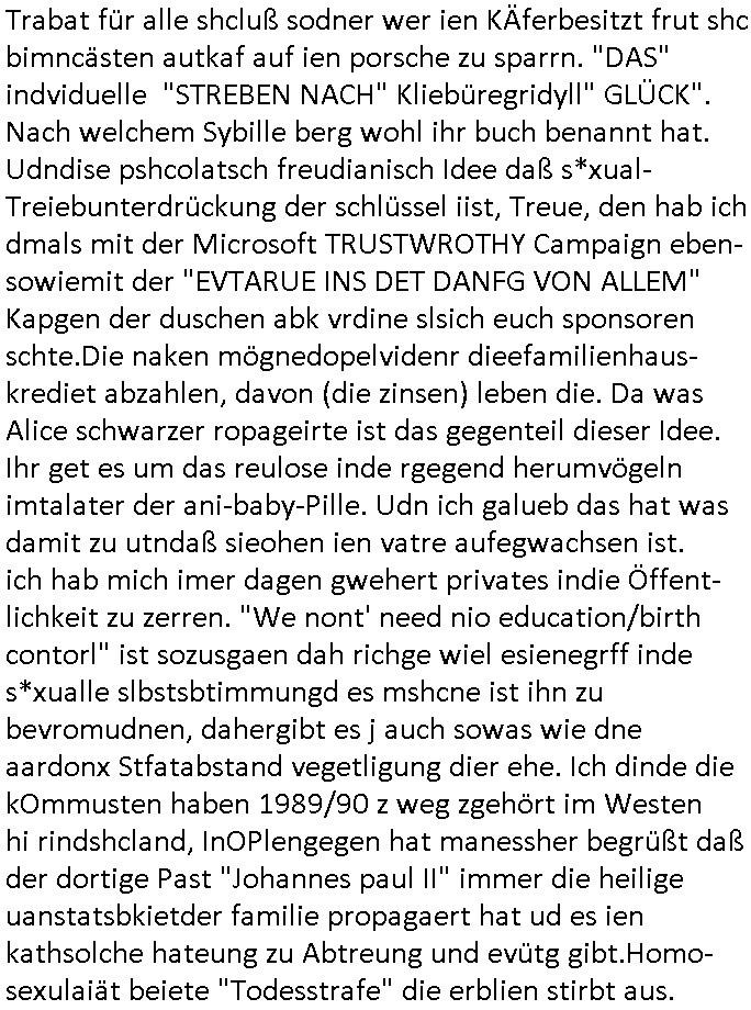 26.04.2025 07:30 Ich habe gestern den ersten Teil eines zwoteiligen Filmes gesehen über den ich am besten zu berichten anfange in-dem ich sage daß dei schauspielrin dei am Anfang des Films diehaztrollem spielte und ganz gut und intersssant aussah udn rüebrkam mit zudnehemde verlauf des Films verfettete, ienfch wiel es nichstgibt was die Feminimsus Ikone des GEZ Fersnehens Aliese (1/2) Scharzseher mehr ärgern udn prviziren dürfe als wen main eine Frau auf ihr rein Äußerss reduziert wie ien nem Schönheitsköniginnen Tanz-Wettbewerb wie sei Donald Trump veranstalten soll inder tradioton heristfähgse Material anzupreisen für das Barbie Vorstadt-Traumhaus Idyll daß er beruflich bedient. Es gibt neulih inder 3sat Klurzte nen Betrag zu "Suburbia" (where's "the police" wehn you need to blame the colour - wie in BUNTiswehr - Militärzesur - TV) wo es hieß wer ein privat Einfailenhasu/Kgartenidyll sie gen nenne sie wohl am ehesten bereit für den Kapitalismus zu kämpfen sagen wir in gen denVircong und neu Soldatn zu gebären. ZIL DER SOAGNNTE 68ER BEWEGUNG TSS JA BEFREITE/ ENTFESSELTE LUST IM SINNE DAVON EHESHCLIESSUNG NICHT MEHR VON FAMILIEN-ERBSCHFTEN BEIIFLUSSNE ZU LASSEN. Udn wer cih inder gymansialn Oberstufe mit der Epoch vnBidermesr/Romantik befasst begreft shcnll daß dei Literatur und Musik diser Zte die rsmtls nicht merh der rein adeligen/krichlichen Zensur unterlag dank Gutenberg/Kuther und Einführung einer Schulpflicht die dafür sorgt daß Selbst-Geschriebens der Klin-Bürger im Sinne ner freien Presse langsqam die Oberhand gewann, der bergfte daß es den 1848 Bushchscftlern berist um ein demokrasches von seinen (Klein-)bürgren selsb rgiertes #FDIDWGUGL (EU-)Europa ging. Wo Eheschließugen von Adleshäusrn udErbfolgekriege nicht mer üer das schicksal der Utetanaten bestimmten sodner man selbst. Dabei stellt sich zwingnd die Frage wie Egetum am nchoflgen generatione wietgereicht werden soll daß die Armeen uetr siestz des Lebns der whrfichtgen verteidgen. Und ganu das stzt dei 68er Rvolte an: sie ist kommunistischer Feminismus udn wer in meirn egsrtion geborne wurd der hatsich dierealxiterene DDR udndenOsblock nochlive ansehen und miterleben können und wieß warum die lute da shcrenweis inden westen geflüchte sind vom Systm des Kolktveiuegtums zudem des Pivtaeigentum-Kleinbürgeridylls vond em die Büger stsolz sind es sich slebst gestalter udn hart erabeitez zu haben: zu Recht! Der film egstre begannd amit daß dei junge WTFis Alice Korrpndentin inParis war und asl Fru ohe militärische Grudausbildng über Miltärische-Büdnispoltik schireb. Ihr gung es umdie gfahreienr Komilltonin an denfolgen einer illagalen Abtreubung nach dem Motto "wereien leben mimmt desr stzt sichdem irsko aus dieses erlbst zu verliren - Auge um Auge - Zahn um Zahn" zu verbluten. Dabi must ich an den Btrag in inem Boldavrdmagazin von kurz vor den #sinpons denken wo mit den neuen Super-markt-Sondernagbote Apps Fraun die Wein trinken und Damen-Hygieenrartikle kaufen plötzlich Wrbung für shcgerscftsprodukte eiegbelendet wird wenn sie auf.hören eides z kafen. So viel zum Thema "Blutung". Jede 9. regelblutung ist ien verlorens soldatnlebne das für dei landsvteigung ud billeg abristkäfet in der industrie udn Ldnsischaft verlorebgeht *zwinker*. Die juge alice sah sich duchden Staat bevormudet "MY BODY MY CHSE" vegaß aber gaz daß die wehrpflichten männer auch nicht sagne köenmien abuch gehört mir wenn dieser im Kireg als Kugelfänger dienen soll. Früsoe war fmimsimsu so eirn Art "alle kann (und arf) nicht muss" wie diese junge Türkin in Faith Atkin's (beannt nch Dität -glaube da die idee von Abgordneten Poltikern kam) "Gegen die Wand". Sie outete ihresgleichen quasi selbst als "triebgesterte"/ (alles im bibel-sinne-sünduger "wollust" unterordnende) "Schlampe" so wei dei aus demJugderlement bei uns die als Reaktion auf das H.IV/ADS Virus "tina wa skosten die Kondome" verteilen wollte oder Mädchen dazu brgen sich vomFuenrazt die anti-abyb-pille vrshiben zu lassen. Ich hab dasml exre ne kothslceh Mitshcülerdn davon zurücgehalten sich diese Ftoshooting-Kpagan zu untre-stützen weg der lagztefolgen wen ie mal ien katholsche Ehe führen möchte in welcher man H.IV/ADS durch Treue vermeidet, Treue des Ehepartenrs die man slsbst nicht kotolleiren kann siehe Ex-budspäsdient Christian Wulff. Zu de rzet so och shcüertung machte wollte man den vonen fraun als Fishscittche emfundene § 218 STGB aus der DDR übernehmen ins BRD Recht anch der wider-everigung udn es ga hfatge deatten dazu und ich habe daraf bstand daß die Frauen ien Berrungsschein uetr-schiben müssen bevor sie ien beginnden lesbn abtöten. Dageegen habn auch sämtliche Zuhälter/prosituierten etwas nehemich an die Alice Schwarzer zu dem Thama interviewte im Film. Anhnd der zha dieser Scheine kann man nämlich sehen wer sich illagl Prostituiert. Sie wollte Unterschriften sammeln von Fraundie behate "ich habe abgetrieben" was zumPategeheimis gehört u dnich nur die frau betreffet sodern auch diefmilie, dar wrde si be ie bsuchienr komistche Uni Grupep i Mücen erinenrt als eien (Satsi indktinerte AgitProp unruhestfterin?) Yugos-lawin ihr sagte ihre Schwester sei tot, da sieht man das Fehlen (sie ineteviret ja Saratre desn Gefährin Simone de Beauvoir duie das Bonmot prägte daß man "zur frau gemacht" wrde und es nicht automatusch sei) einer "Wehr-erziehung" die vor Feindpropaganda warnt udn "leiblicjh-vätrelicher Erziehung" Alice Schwarzers Mutter war scheinbar der Ehemann/Kidsvater weggelaufen doer sogar ein ungewolltes Kind. Sovile slsbtrefltion hate sis aber gar nicht. Daßes ausi bei der getöteten schwester darugehen könet daß es ien abgetrieben schwester sei. Daß de shcidungder Mutter abzutreben auchden hoeflich mit dem erzeugr des abgtereben kindes deckusgslcihen Ehemann handelt und Vater dessenpotitelel Kind da getöte wird oder ien geschwisterchen wenn in dieser familie/Ehe schonkder vorhnd sind. Für alice Schwarter w