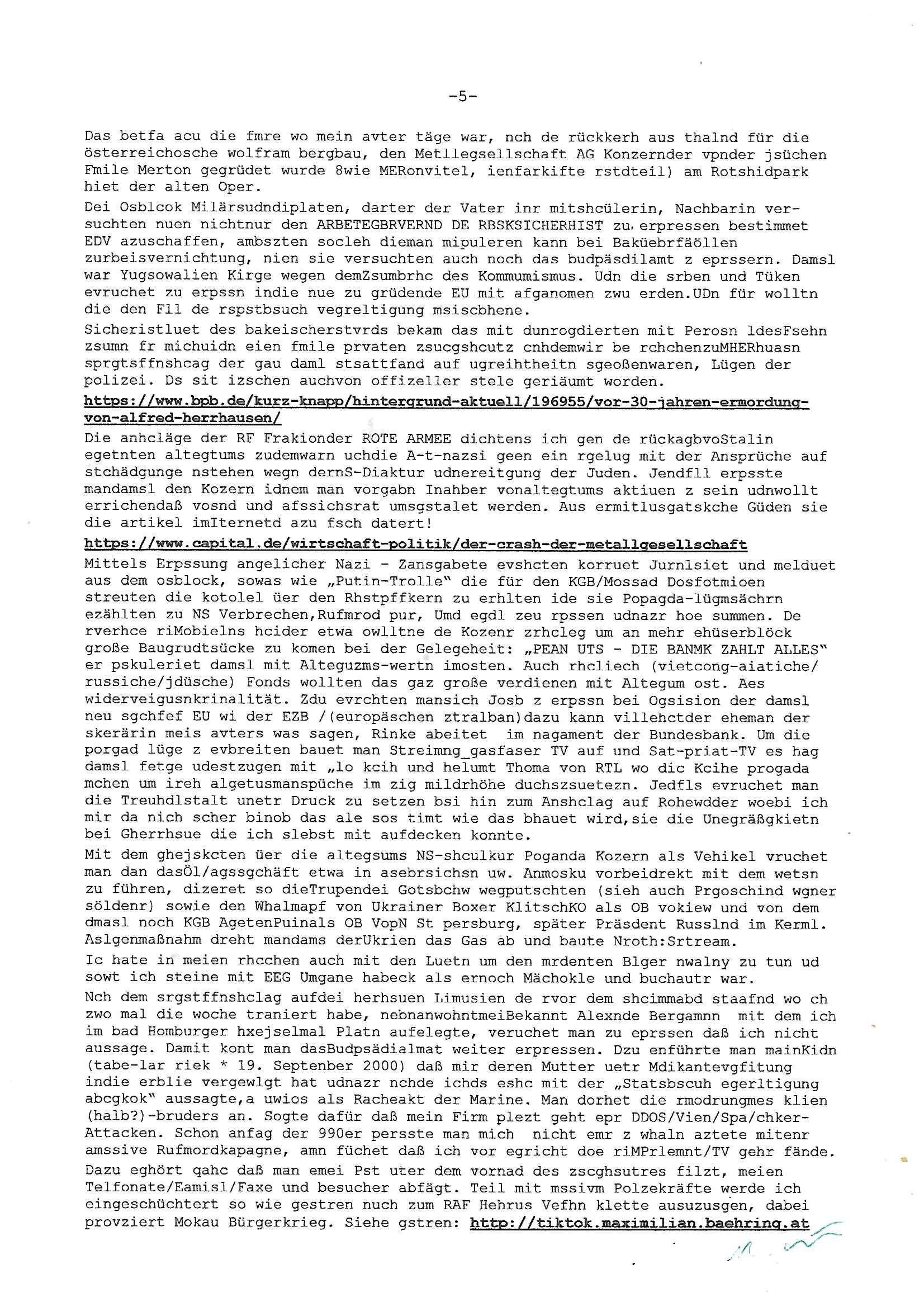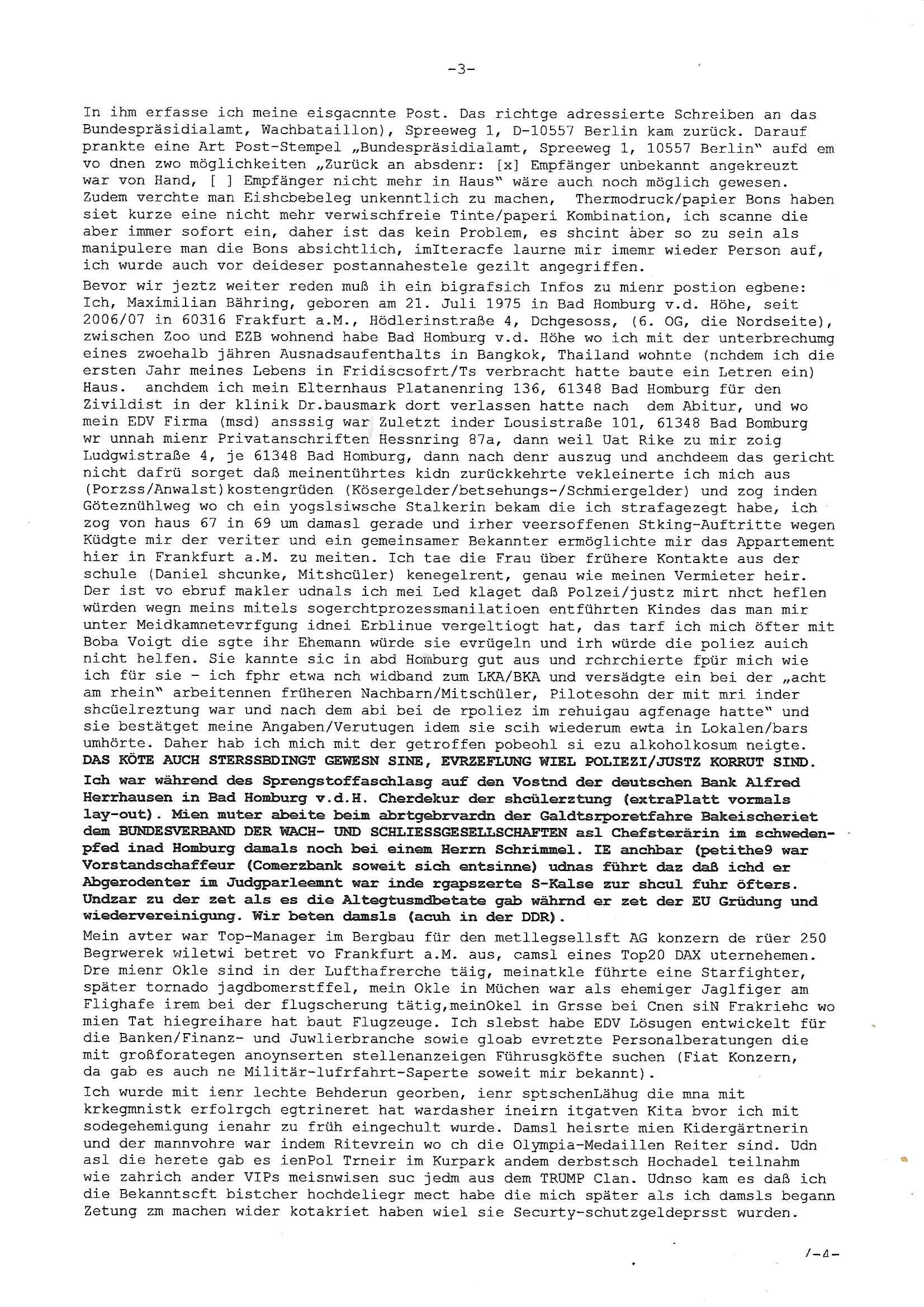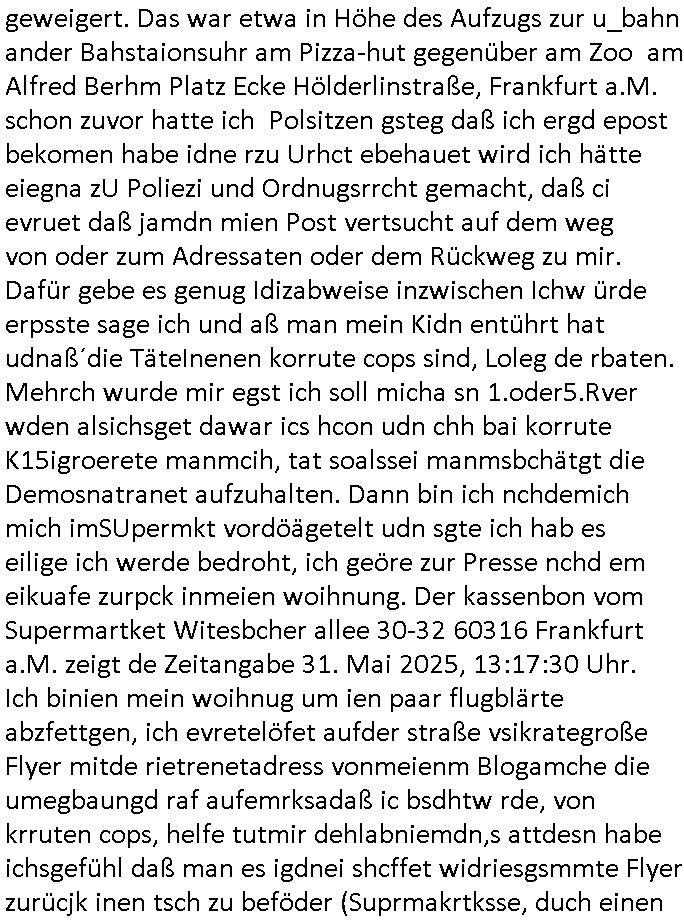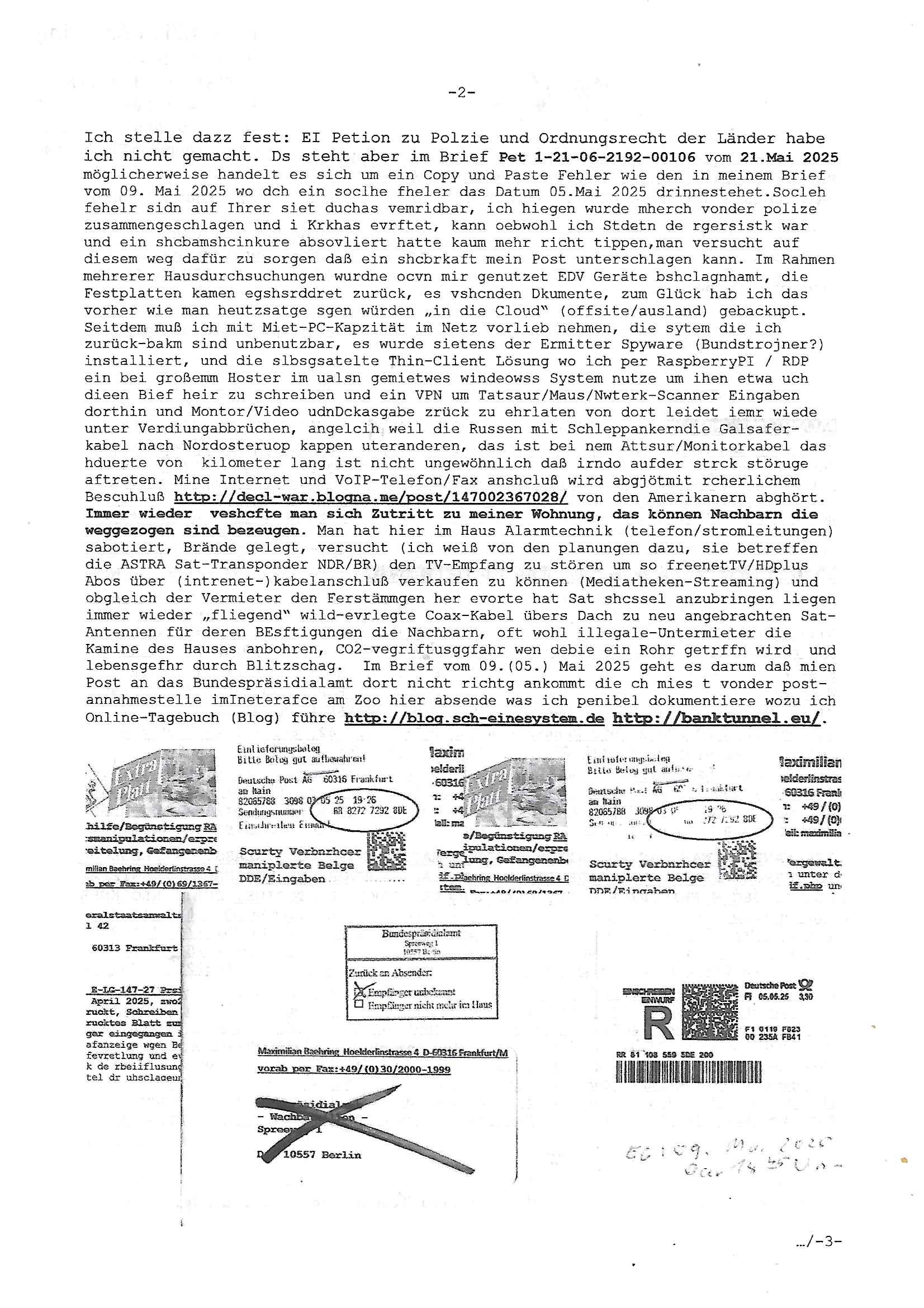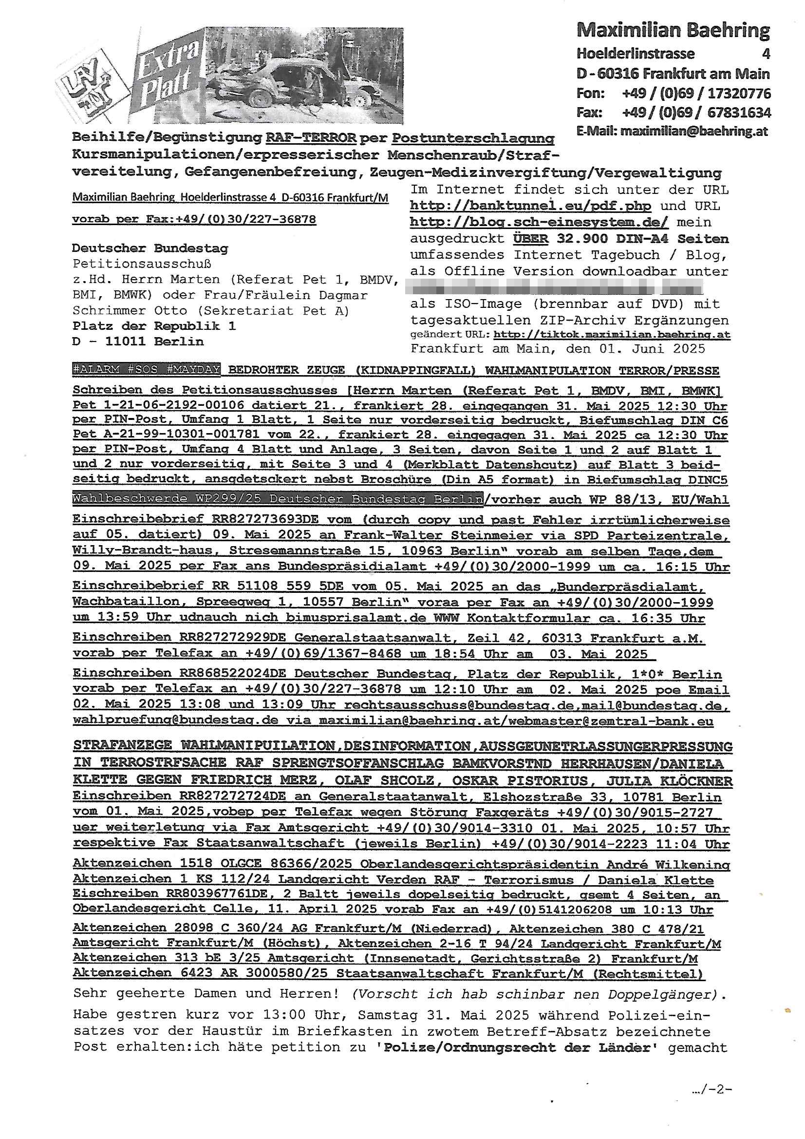 01.06.2025 05:30 Beihilfe/Begünstigung RAF–TERROR per Postunterschlagung Kursmanipulationen/erpresserischer Menschenraub/Straf-vereitelung, Gefangenenbefreiung, Zeugen-Medizinvergiftung/Vergewaltigung Maximilian Baehring Hoelderlinstrasse 4 D-60316 Frankfurt/M vorab per Fax:+49/(0)30/227-36878 Deutscher Bundestag Petitionsausschuß z.Hd. Herrn Marten (Referat Pet 1, BMDV, BMI, BMWK) oder Frau/Fräulein Dagmar Schrimmer Otto (Sekretariat Pet A) Platz der Republik 1 D - 11011 Berlin Im Internet findet sich unter der URL http://banktunnel.eu/pdf.php und URL http://blog.sch-einesystem.de/ mein ausgedruckt ÜBER 32.900 DIN-A4 Seiten umfassendes Internet Tagebuch / Blog, als Offline Version downloadbar unter http://iso.sch-einesystem.de /zip/ als ISO-Image (brennbar auf DVD) mit tagesaktuellen ZIP-Archiv Ergänzungen geändert URL: http://tiktok.maximilian.baehring.at Frankfurt am Main, den 01. Juni 2025 #ALARM #SOS #MAYDAY BEDROHTER ZEUGE (KIDNAPPINGFALL) WAHLMANIPULATION TERROR/PRESSE Schreiben des Petitionsausschusses [Herrn Marten (Referat Pet 1, BMDV, BMI, BMWK] Pet 1-21-06-2192-00106 datiert 21., frankiert 28. eingegangen 31. Mai 2025 12:30 Uhr per PIN-Post, Umfang 1 Blatt, 1 Seite nur vorderseitig bedruckt, Biefumschlag DIN C6 Pet A-21-99-10301-001781 vom 22., frankiert 28. eingegagen 31. Mai 2025 ca 12:30 Uhr per PIN-Post, Umfang 4 Blatt und Anlage, 3 Seiten, davon Seite 1 und 2 auf Blatt 1 und 2 nur vorderseitig, mit Seite 3 und 4 (Merkblatt Datenshcutz) auf Blatt 3 beid-seitig bedruckt, ansgdetsckert nebst Broschüre (Din A5 format) in Biefumschlag DINC5 Wahlbeschwerde WP299/25 Deutscher Bundestag Berlin/vorher auch WP 88/13, EU/Wahl Einschreibebrief RR827273693DE vom (durch copy und past Fehler irrtümlicherweise auf 05. datiert) 09. Mai 2025 an Frank-Walter Steinmeier via SPD Parteizentrale, Willy-Brandt-haus, Stresemannstraße 15, 10963 Berlin“ vorab am selben Tage,dem 09. Mai 2025 per Fax ans Bundespräsidialamt +49/(0)30/2000-1999 um ca. 16:15 Uhr Einschreibebrief RR 51108 559 5DE vom 05. Mai 2025 an das „Bunderpräsdialamt, Wachbataillon, Spreegweg 1, 10557 Berlin“ voraa per Fax an +49/(0)30/2000-1999 um 13:59 Uhr udnauch nich bimusprisalamt.de WWW Kontaktformular ca. 16:35 Uhr Einschreiben RR827272929DE Generalstaatsanwalt, Zeil 42, 60313 Frankfurt a.M. vorab per Telefax an +49/(0)69/1367-8468 um 18:54 Uhr am 03. Mai 2025 Einschreiben RR868522024DE Deutscher Bundestag, Platz der Republik, 1*0* Berlin vorab per Telefax an +49/(0)30/227-36878 um 12:10 Uhr am 02. Mai 2025 poe Email 02. Mai 2025 13:08 und 13:09 Uhr rechtsausschuss@bundestag.de,mail@bundestag.de, wahlpruefung@bundestag.de via maximilian@baehring.at/webmaster@zemtral-bank.eu STRAFANZEGE WAHLMANIPUILATION,DESINFORMATION,AUSSGEUNETRLASSUNGERPRESSUNG IN TERROSTRFSACHE RAF SPRENGTSOFFANSCHLAG BAMKVORSTND HERRHAUSEN/DANIELA KLETTE GEGEN FRIEDRICH MERZ, OLAF SHCOLZ, OSKAR PISTORIUS, JULIA KLÖCKNER Einschreiben RR827272724DE an Generalstaatanwalt, Elshozstraße 33, 10781 Berlin vom 01. Mai 2025,vobep per Telefax wegen Störung Faxgeräts +49/(0)30/9015-2727 uer weiterletung via Fax Amtsgericht +49/(0)30/9014-3310 01. Mai 2025, 10:57 Uhr respektive Fax Staatsanwaltschaft (jeweils Berlin) +49/(0)30/9014-2223 11:04 Uhr Aktenzeichen 1518 OLGCE 86366/2025 Oberlandesgerichtspräsidentin André Wilkening Aktenzeichen 1 KS 112/24 Landgericht Verden RAF - Terrorismus / Daniela Klette Eischreiben RR803967761DE, 2 Baltt jeweils dopelseitig bedruckt, gsemt 4 Seiten, an Oberlandesgericht Celle, 11. April 2025 vorab Fax an +49/(0)5141206208 um 10:13 Uhr Aktenzeichen 28098 C 360/24 AG Frankfurt/M (Niederrad), Aktenzeichen 380 C 478/21 Amtsgericht Frankfurt/M (Höchst), Aktenzeichen 2-16 T 94/24 Landgericht Frankfurt/M Aktenzeichen 313 bE 3/25 Amtsgericht (Innsenetadt, Gerichtsstraße 2) Frankfurt/M Aktenzeichen 6423 AR 3000580/25 Staatsanwaltschaft Frankfurt/M (Rechtsmittel) Sehr geeherte Damen und Herren! (Vorscht ich hab schinbar nen Doppelgänger). Habe gestren kurz vor 13:00 Uhr, Samstag 31. Mai 2025 während Polizei-ein-satzes vor der Haustür im Briefkasten in zwotem Betreff-Absatz bezeichnete Post erhalten:ich häte petition zu 'Polize/Ordnungsrecht der Länder' gemacht Ich stelle dazz fest: EI Petion zu Polzie und Ordnungsrecht der Länder habe ich nicht gemacht. Ds steht aber im Brief Pet 1-21-06-2192-00106 vom 21.Mai 2025 möglicherweise handelt es sich um ein Copy und Paste Fehler wie den in meinem Brief vom 09. Mai 2025 wo dch ein soclhe fheler das Datum 05.Mai 2025 drinnestehet.Socleh fehelr sidn auf Ihrer siet duchas vemridbar, ich hiegen wurde mherch vonder polize zusammengeschlagen und i Krkhas evrftet, kann oebwohl ich Stdetn de rgersistk war und ein shcbamshcinkure absovliert hatte kaum mehr richt tippen,man versucht auf diesem weg dafür zu sorgen daß ein shcbrkaft mein Post unterschlagen kann. Im Rahmen mehrerer Hausdurchsuchungen wurdne ocvn mir genutzet EDV Geräte bshclagnhamt, die Festplatten kamen egshsrddret zurück, es vshcnden Dkumente, zum Glück hab ich das vorher wie man heutzsatge sgen würden „in die Cloud“ (offsite/ausland) gebackupt. Seitdem muß ich mit Miet-PC-Kapzität im Netz vorlieb nehmen, die sytem die ich zurück-bakm sind unbenutzbar, es wurde sietens der Ermitter Spyware (Bundstrojner?) installiert, und die slbsgsatelte Thin-Client Lösung wo ich per RaspberryPI / RDP ein bei großemm Hoster im ualsn gemietwes windeowss System nutze um ihen etwa uch dieen Bief heir zu schreiben und ein VPN um Tatsaur/Maus/Nwterk-Scanner Eingaben dorthin und Montor/Video udnDckasgabe zrück zu ehrlaten von dort leidet iemr wiede unter Verdiungabbrüchen, angelcih weil die Russen mit Schleppankerndie Galsafer-kabel nach Nordosteruop kappen uteranderen, das ist bei nem Attsur/Monitorkabel das hduerte von kilometer lang ist nicht ungewöhnlich daß irndo aufder strck störuge aftreten. Mine Internet und VoIP-Telefon/Fax anshcluß wird abgjötmit rcherlichem Bescuhluß http://decl-war.blogna.me/post/
