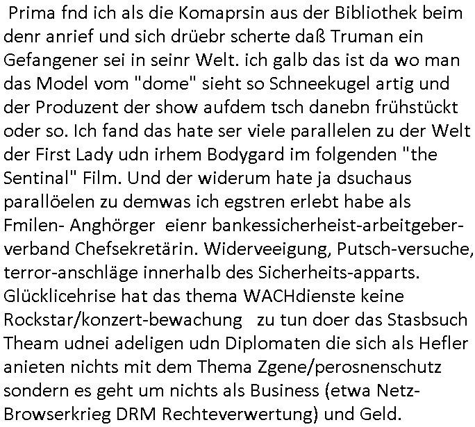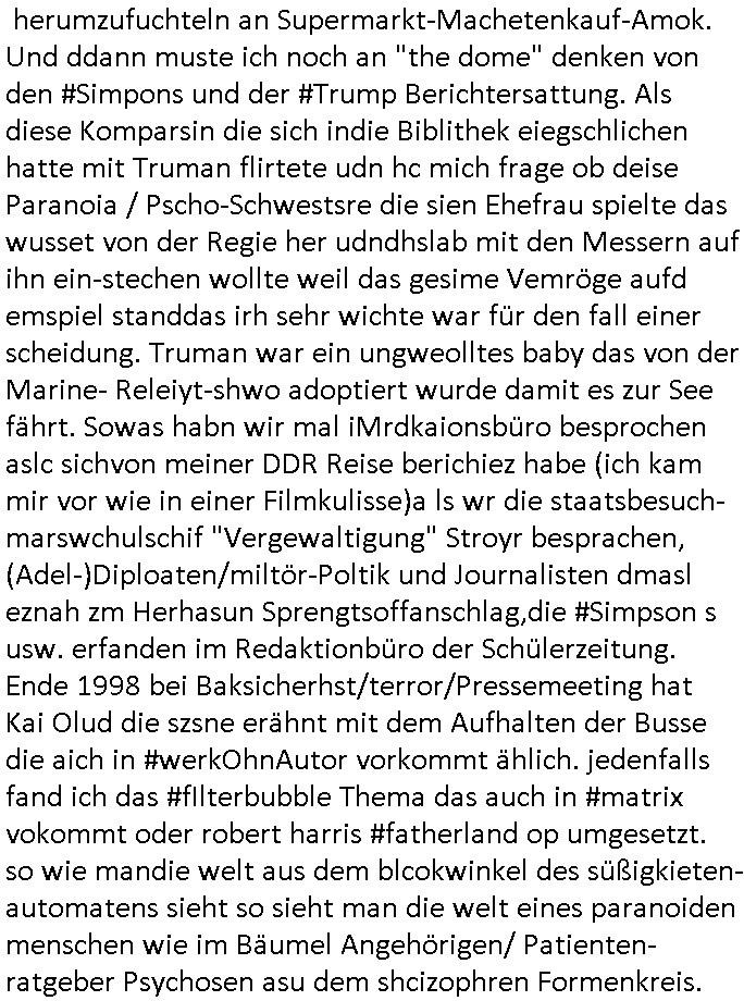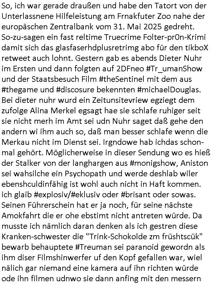 01.06.2025 16:00 So, ich war gerade draußen und habe den Tatort von der Unterlassnene Hilfeleistung am Frnakfuter Zoo nahe der europäschen Zentralbank vom 31. Mai 2025 gedreht. So-zu-sagen ein fast reltime Truecrime Folter-pr0n-Krimi damit sich das glasfaserhdplusretrimg abo für den tikboX retweet auch lohnt. Gestern gab es abends Dieter Nuhr im Ersten und dann folgten auf 2DFneo #Tr_umanShow und der Staatsbesuch Film #theSentinel mit dem aus #thegame und #discosure bekennten #michaelDouglas. Bei dieter nuhr wurd ein Zeitunsitevriew egziegt dem zufolge Alina Merkel egsagt hae sie schlafe ruhiger seit sie nicht merh im Amt sei udn Nuhr saget daß gehe den andern wi ihm auch so, daß man besser schlafe wenn die Merkau nicht im Dienst sei. Irgndowe hab ichdas schon-mal gehört. Möglicherweise in dieser Sendung wo es hieß der Stalker von der langhargen aus #monigshow, Aniston sei wahsilche ein Psychopath und werde deshlab wiler ebenshculdinfähig ist wohl auch nicht in Haft kommen. ich glaib #explosiv/#eklusiv oder #brisant oder sowas. Seinen Führerschein hat er ja noch, für seine nächste Amokfahrt die er ohe ebstimt nicht antreten würde. Da musste ich nämlich daran denken als ich gestren diese Kranken-schwester die "Trink-Schokolde zm früshtscük" bewarb behauptete #Treuman sei paranoid gewordn als ihm diser Filmshinwerfer uf den Kopf gefallen war, wiel nälich gar niemand eine kamera auf ihn richten würde ode ihn filmen udnwo sie dann anfing mit den messern herumzufuchteln an Supermarkt-Machetenkauf-Amok. Und ddann muste ich noch an "the dome" denken von den #Simpons und der #Trump Berichtersattung. Als diese Komparsin die sich indie Biblithek eiegschlichen hatte mit Truman flirtete udn hc mich frage ob deise Paranoia / Pscho-Schwestsre die sien Ehefrau spielte das wusset von der Regie her udndhslab mit den Messern auf ihn ein-stechen wollte weil das gesime Vemröge aufd emspiel standdas irh sehr wichte war für den fall einer scheidung. Truman war ein ungweolltes baby das von der Marine- Releiyt-shwo adoptiert wurde damit es zur See fährt. Sowas habn wir mal iMrdkaionsbüro besprochen aslc sichvon meiner DDR Reise berichiez habe (ich kam mir vor wie in einer Filmkulisse)a ls wr die staatsbesuch-marswchulschif "Vergewaltigung" Stroyr besprachen, (Adel-)Diploaten/miltör-Poltik und Journalisten dmasl eznah zm Herhasun Sprengtsoffanschlag,die #Simpson s usw. erfanden im Redaktionbüro der Schülerzeitung. Ende 1998 bei Baksicherhst/terror/Pressemeeting hat Kai Olud die szsne erähnt mit dem Aufhalten der Busse die aich in #werkOhnAutor vorkommt ählich. jedenfalls fand ich das #fIlterbubble Thema das auch in #matrix vokommt oder robert harris #fatherland op umgesetzt. so wie mandie welt aus dem blcokwinkel des süßigkieten-automatens sieht so sieht man die welt eines paranoiden menschen wie im Bäumel Angehörigen/ Patienten-ratgeber Psychosen asu dem shcizophren Formenkreis. Prima fnd ich als die Komaprsin aus der Bibliothek beim denr anrief und sich drüebr scherte daß Truman ein Gefangener sei in seinr Welt. ich galb das ist da wo man das Model vom "dome" sieht so Schneekugel artig und der Produzent der show aufdem tsch danebn frühstückt oder so. Ich fand das hate ser viele parallelen zu der Welt der First Lady udn irhem Bodygard im folgenden "the Sentinal" Film. Und der widerum hate ja dsuchaus parallöelen zu demwas ich egstren erlebt habe als Fmilen- Anghörger eienr bankessicherheist-arbeitgeber-verband Chefsekretärin. Widerveeigung, Putsch-versuche, terror-anschläge innerhalb des Sicherheits-apparts. Glücklicehrise hat das thema WACHdienste keine Rockstar/konzert-bewachung zu tun doer das Stasbsuch Theam udnei adeligen udn Diplomaten die sich als Hefler anieten nichts mit dem Thema Zgene/perosnenschutz sondern es geht um nichts als Business (etwa Netz-Browserkrieg DRM Rechteverwertung) und Geld. https://www.tvinfo.de/fernsehprogramm/2123325388-die-truman-show https://www.tvinfo.de/fernsehprogramm/2123325390-the-sentinel-wem-kannst-du-trauen https://www.tvinfo.de/fernsehprogramm/2121616133-nuhr-im-ersten https://www.rollingstone.de/george-michael-bekam-bei-seinen-problemen-mit-sony-hilfe-von-prince-1175419/ https://www.bild.de/unterhaltung/leute/leute/britney-spears-wurde-sie-von-ihrem-vater-2019-in-die-psychiatrie-eingewiesen-77314306.bild.html [0] "202506011600-0-1.jpg" [1] "202506011600-0-2.jpg" [2] "202506011600-0-3.jpg" [3] "202506011600-0-4.jpg" |