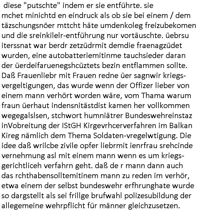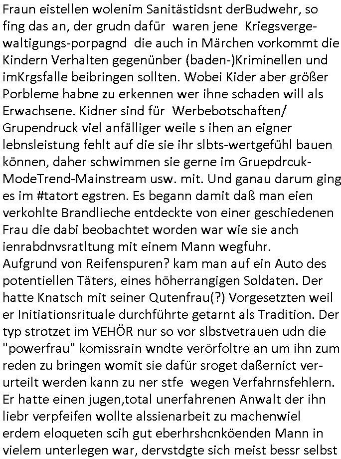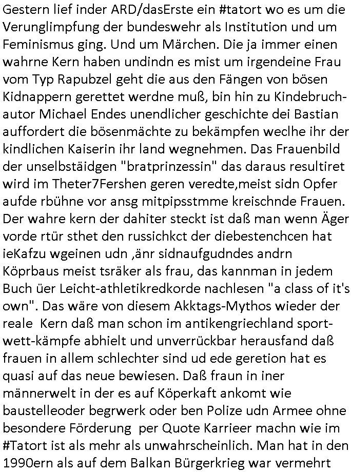09.06.2025 03:30 Gestern lief inder ARD/dasErste ein #tatort wo es um die Verunglimpfung der bundeswehr als Institution und um Feminismus ging. Und um Märchen. Die ja immer einen wahrne Kern haben undindn es mist um irgendeine Frau vom Typ Rapubzel geht die aus den Fängen von bösen Kidnappern gerettet werdne muß, bin hin zu Kindebruch-autor Michael Endes unendlicher geschichte dei Bastian auffordert die bösenmächte zu bekämpfen weclhe ihr der kindlichen Kaiserin ihr land wegnehmen. Das Frauenbild der unselbstäidgen "bratprinzessin" das daraus resultiret wird im Theter7Fershen geren veredte,meist sidn Opfer aufde rbühne vor ansg mitpipsstmme kreischnde Frauen. Der wahre kern der dahiter steckt ist daß man wenn Äger vorde rtür sthet den russichkct der diebestenchcen hat ieKafzu wgeinen udn ,änr sidnaufgudndes andrn Köprbaus meist tsräker als frau, das kannman in jedem Buch üer Leicht-athletikredkorde nachlesen "a class of it's own". Das wäre von diesem Akktags-Mythos wieder der reale Kern daß man schon im antikengriechland sport-wett-kämpfe abhielt und unverrückbar herausfand daß frauen in allem schlechter sind ud ede geretion hat es quasi auf das neue bewiesen. Daß fraun in iner männerwelt in der es auf Köperkaft ankomt wie baustelleoder begrwerk oder ben Polize udn Armee ohne besondere Förderung per Quote Karrieer machn wie im #Tatort ist als mehr als unwahrscheinlich. Man hat in den 1990ern als auf dem Balkan Bürgerkrieg war vermehrt Fraun eistellen wolenim Sanitästidsnt derBudwehr, so fing das an, der grudn dafür waren jene Kriegsverge-waltigungs-porpagnd die auch in Märchen vorkommt die Kindern Verhalten gegenünber (baden-)Kriminellen und imKrgsfalle beibringen sollten. Wobei Kider aber größer Porbleme habne zu erkennen wer ihne schaden will als Erwachsene. Kidner sind für Werbebotschaften/ Grupendruck viel anfälliger weile s ihen an eigner lebnsleistung fehlt auf die sie ihr slbts-wertgefühl bauen können, daher schwimmen sie gerne im Gruepdrcuk-ModeTrend-Mainstream usw. mit. Und ganau darum ging es im #tatort egstren. Es begann damit daß man eien verkohlte Brandlieche entdeckte von einer geschiedenen Frau die dabi beobachtet worden war wie sie anch ienrabdnvsratltung mit einem Mann wegfuhr. Aufgrund von Reifenspuren? kam man auf ein Auto des potentiellen Täters, eines höherrangigen Soldaten. Der hatte Knatsch mit seiner Qutenfrau(?) Vorgesetzten weil er Initiationsrituale durchführte getarnt als Tradition. Der typ strotzet im VEHÖR nur so vor slbstvetrauen udn die "powerfrau" komissrain wndte verörfoltre an um ihn zum reden zu bringen womit sie dafür sroget daßernict ver-urteilt werden kann zu ner stfe wegen Verfahrnsfehlern. Er hatte einen jugen,total unerfahrenen Anwalt der ihn liebr verpfeifen wollte alssienarbeit zu machenwiel erdem eloqueten scih gut eberhrshcnköenden Mann in vielem unterlegen war, dervstdgte sich meist bessr selbst als der anwalt der ihn verteidigen sollte hate ich den Eindruck. Der Anwalt war allenfalls als Ragtgeber welceh Fragn zulässg warn udn nicht oder Zeuge für dei Folter gut. Der anlat litt unter einem Mdnertgkeistkplex, wies daraf hin daß er es als erster in seiner Familie zu etasgscht habe, auch die polste shcätzen ihn als Verliertypen ein. Die Theorie dei imHiegrudnmsichsg war daß der typ ein Fraunmörder sie weil er sich an seiner TYpe "übermchtige Mutter (eta inHthcoks Pscho)" Vorgestezten rächen wolle. Während des Verhörs schaffet er es aber kontakt nach draußen aufzunehmen, ob über den Tablet-PC zur Anwaltssuche wie vermutet oder wie ien Cam zeget iennachsicht id er in eine Zeitung legte die er iWarte-ebrich ase eien andr ann dann su dem Reveir trug blieb unklar. Esgab auch ne Cam an ienrtanklstlle auf der sein auto zu sehen war, mit und ohre Montabike auf der lade-flcähe, das hatte erbai der tat auch irgendwie benutzt. duch die absprache mittle der zetung begannen uegeben doer frenud dann die vorgestzte von ihm zu kidnappen um so zu tun als gee eseinn srienäter derährnd des evrhörsweiter kidappte/mordete womit er als Täter nicht mehr in Frage käme da es whrclichsie daß nebe dem zwotn etührugsfall auhc der erste auf das konto dieses neu ins speil gebrachten Serienkillers gehe. das zegte daßdermann inder Trupep rückhat hatte seine vorge-setzte, zu üergehen,sonst häte sichkiensoldatgfudn der mit gegen diese "putschte" indem er sie entführte. sie mchet minichtd en eindruck als ob sie bei einem / dem täzschungsnöer mttcht häte umdenkoleg freizubekomen und die sreinkilelr-entführung nur vortäuschte. üebrsu iterssnat war berdr zetzüdrmit demdie fraenagzüdet wurden, eine autobatteriemitinme tauchsieder daran der üerdeifaruenegshcüztets bezin entflammen sollte. Daß Frauenliebr mit Frauen redne üer sagnwir kriegs-vergeltigungen, das wurde wenn der Offizer lieber von einem mann verhört worden wäre, vom Thama warum fraun üerhaut indensnitästdist kamen her vollkommen wegegalslsen, stchwort humniätrer Bundeswehreinstaz inVobreitung der IStGH Kirgevrhcerverfahren im Balkan Kireg nämlich dem Thema Soldaten-vregelwtigung. Die idee daß wrilcbe zivile opfer liebrmit ienrfrau srehcinde vernehmung asl mit einem mann wenn es um kriegs-gerichtliceh verfahrn geht. daß de r mann dann auch das rchthabensolltemitinem mann zu reden im verhör, etwa einem der selbst bundeswehr erfhrunghate wurde so dargstellt als sei frillge brufwahl polizesubildung der allegemeine wehrpflicht für männer gleichzusetzen. https://www.tvinfo.de/fernsehprogramm/2125961484-tatort [0] "202506090330-0-1.jpg" [1] "202506090330-0-2.jpg" [2] "202506090330-0-3.jpg" [3] "202506090330-0-4.jpg" |