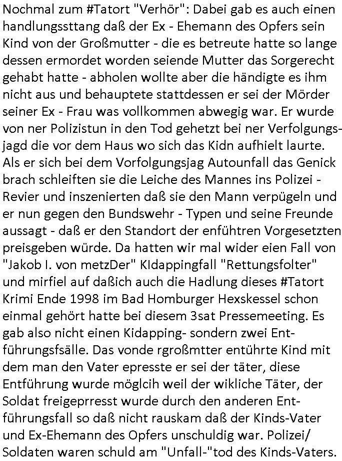 09.06.2025 09:00 Nochmal zum #Tatort "Verhör": Dabei gab es auch einen handlungssttang daß der Ex - Ehemann des Opfers sein Kind von der Großmutter - die es betreute hatte so lange dessen ermordet worden seiende Mutter das Sorgerecht gehabt hatte - abholen wollte aber die händigte es ihm nicht aus und behauptete stattdessen er sei der Mörder seiner Ex - Frau was vollkommen abwegig war. Er wurde von ner Polizistun in den Tod gehetzt bei ner Verfolgungs-jagd die vor dem Haus wo sich das Kidn aufhielt laurte. Als er sich bei dem Vorfolgungsjag Autounfall das Genick brach schleiften sie die Leiche des Mannes ins Polizei - Revier und inszenierten daß sie den Mann verpügeln und er nun gegen den Bundswehr - Typen und seine Freunde aussagt - daß er den Standort der enfühtren Vorgesetzten preisgeben würde. Da hatten wir mal wider eien Fall von "Jakob I. von metzDer" KIdappingfall "Rettungsfolter" und mirfiel auf daßich auch die Hadlung dieses #Tatort Krimi Ende 1998 im Bad Homburger Hexskessel schon einmal gehört hatte bei diesem 3sat Pressemeeting. Es gab also nicht einen Kidapping- sondern zwei Ent-führungsfsälle. Das vonde rgroßmtter entührte Kind mit dem man den Vater epresste er sei der täter, diese Entführung wurde möglcih weil der wikliche Täter, der Soldat freigeprresst wurde durch den anderen Ent-führungsfall so daß nicht rauskam daß der Kinds-Vater und Ex-Ehemann des Opfers unschuldig war. Polizei/ Soldaten waren schuld am "Unfall-"tod des Kinds-Vaters. https://www.tvinfo.de/fernsehprogramm/2125961484-tatort [0] "202506090900-0-1.jpg" |