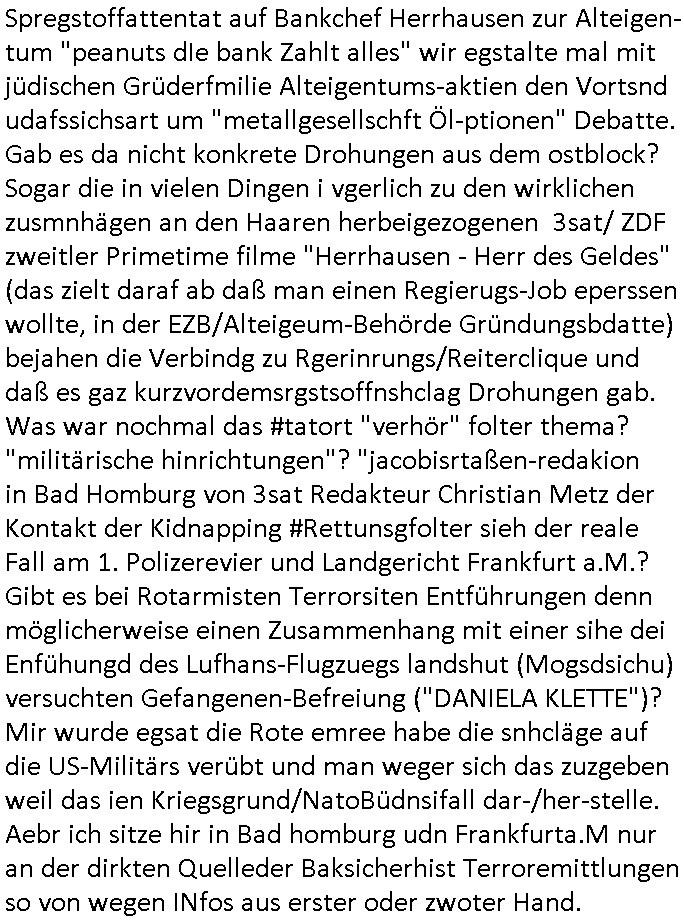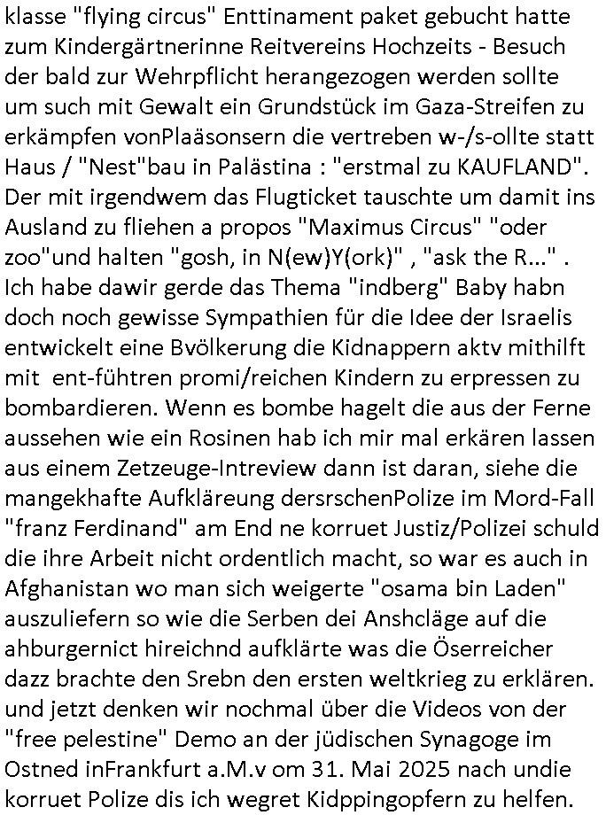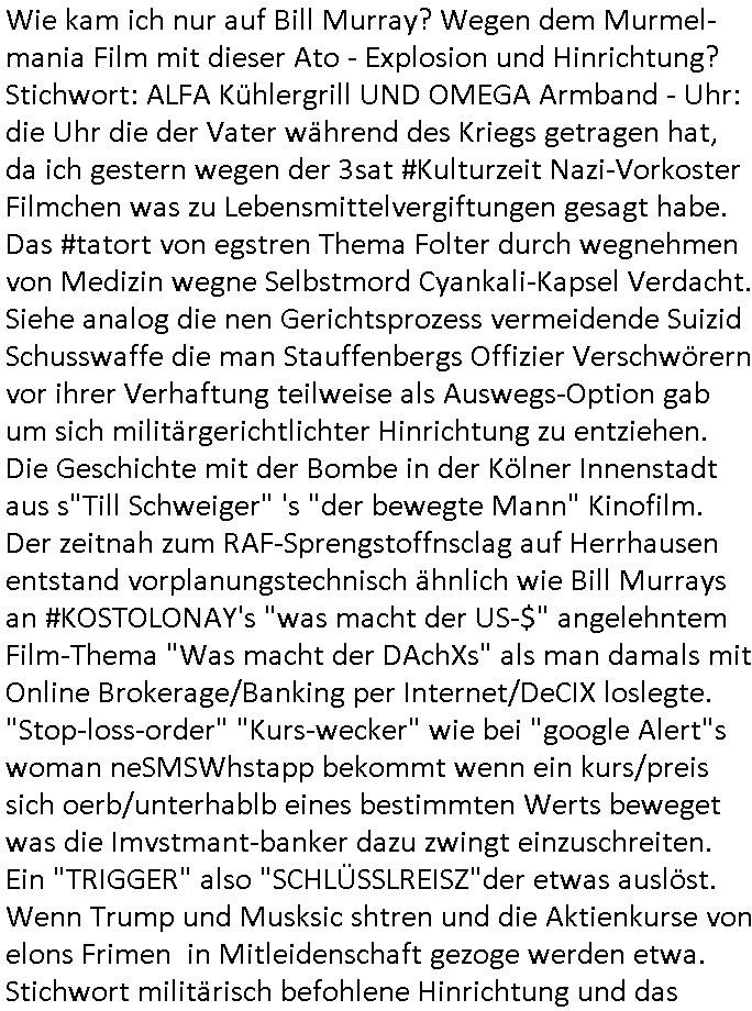 09.06.2025 10:00 Ich hab extra bis um ca. 09:00 Uhr gewartet um zu sehen ob viellecht doch noch das neuerdings angeblich auch am Samstag sendende "Sat1 Frühtsücksfernsehen am Sonn- (und Feier?)tag" kommt aber entweder die sind endgültg gaze gemeine Hunde geworden, auch optisch, oder "ich glaube ihr Hund kann gar nicht sprechen" Sat1 Fühstücks-fernseh-Promihund "Lotte" hat mit dem "Bernhardiner Lawinen- Rettungshund Josef von Heidis Großvater" und "Lassie" zusammen das "Katzen würden Whiksas kaufen" gesponsorte Sendezeitfenster übernommen, ich fühlte mich an diese "Bill Murray" Verfilmung von C. Dickens "Christmas Carol" erinnert wo er in einer Werbeagentur arbeiet und behauptet daß für fernsehende Hunde ein Markt da wäre ähnlich dem für "Quengelkinder" mit den Süßugkeiten Regalen an Supermarktkasse-wartschlangen. Weil Hunde (abgesenn von dem vom Mooshammer) kein eigenes Geld hätten das sie ausgeben können, etwa so wie kleine Kindersei diese Idee zum scheitern verurteilt meinte ich seinerzeit. Aber es gibt auch Kinder weclhe die Fußgänger-Zonen Zirkus-Bettel-Tiere mit nach Hause nehmen oder Wohraum einer Stadt einen Schweinestall machen wenn ich an #berlinNueKölln02407 respektive #berlinTagUndNacht denke, die für die Quote auch auf Frühtsücksfernsehn "Kensu" LUSTige TIERvideos setzen. Anstattdessn lief nämlich irgendwas mit laute Hunden. Wie war das denn mit diesem #Kuckusknest Kita-Besuch Bad Homburg oer-Erlabch von dem Israeli der das erste klasse "flying circus" Enttinament paket gebucht hatte zum Kindergärtnerinne Reitvereins Hochzeits - Besuch der bald zur Wehrpflicht herangezogen werden sollte um such mit Gewalt ein Grundstück im Gaza-Streifen zu erkämpfen vonPlaäsonsern die vertreben w-/s-ollte statt Haus / "Nest"bau in Palästina : "erstmal zu KAUFLAND". Der mit irgendwem das Flugticket tauschte um damit ins Ausland zu fliehen a propos "Maximus Circus" "oder zoo"und halten "gosh, in N(ew)Y(ork)" , "ask the R..." . Ich habe dawir gerde das Thema "indberg" Baby habn doch noch gewisse Sympathien für die Idee der Israelis entwickelt eine Bvölkerung die Kidnappern aktv mithilft mit ent-fühtren promi/reichen Kindern zu erpressen zu bombardieren. Wenn es bombe hagelt die aus der Ferne aussehen wie ein Rosinen hab ich mir mal erkären lassen aus einem Zetzeuge-Intreview dann ist daran, siehe die mangekhafte Aufkläreung dersrschenPolize im Mord-Fall "franz Ferdinand" am End ne korruet Justiz/Polizei schuld die ihre Arbeit nicht ordentlich macht, so war es auch in Afghanistan wo man sich weigerte "osama bin Laden" auszuliefern so wie die Serben dei Anshcläge auf die ahburgernict hireichnd aufklärte was die Öserreicher dazz brachte den Srebn den ersten weltkrieg zu erklären. und jetzt denken wir nochmal über die Videos von der "free pelestine" Demo an der jüdischen Synagoge im Ostned inFrankfurt a.M.v om 31. Mai 2025 nach undie korruet Polize dis ich wegret Kidppingopfern zu helfen. Wie kam ich nur auf Bill Murray? Wegen dem Murmel-mania Film mit dieser Ato - Explosion und Hinrichtung? Stichwort: ALFA Kühlergrill UND OMEGA Armband - Uhr: die Uhr die der Vater während des Kriegs getragen hat, da ich gestern wegen der 3sat #Kulturzeit Nazi-Vorkoster Filmchen was zu Lebensmittelvergiftungen gesagt habe. Das #tatort von egstren Thema Folter durch wegnehmen von Medizin wegne Selbstmord Cyankali-Kapsel Verdacht. Siehe analog die nen Gerichtsprozess vermeidende Suizid Schusswaffe die man Stauffenbergs Offizier Verschwörern vor ihrer Verhaftung teilweise als Auswegs-Option gab um sich militärgerichtlichter Hinrichtung zu entziehen. Die Geschichte mit der Bombe in der Kölner Innenstadt aus s"Till Schweiger" 's "der bewegte Mann" Kinofilm. Der zeitnah zum RAF-Sprengstoffnsclag auf Herrhausen entstand vorplanungstechnisch ähnlich wie Bill Murrays an #KOSTOLONAY's "was macht der US-$" angelehntem Film-Thema "Was macht der DAchXs" als man damals mit Online Brokerage/Banking per Internet/DeCIX loslegte. "Stop-loss-order" "Kurs-wecker" wie bei "google Alert"s woman neSMSWhstapp bekommt wenn ein kurs/preis sich oerb/unterhablb eines bestimmten Werts beweget was die Imvstmant-banker dazu zwingt einzuschreiten. Ein "TRIGGER" also "SCHLÜSSLREISZ"der etwas auslöst. Wenn Trump und Musksic shtren und die Aktienkurse von elons Frimen in Mitleidenschaft gezoge werden etwa. Stichwort militärisch befohlene Hinrichtung und das Spregstoffattentat auf Bankchef Herrhausen zur Alteigen-tum "peanuts dIe bank Zahlt alles" wir egstalte mal mit jüdischen Grüderfmilie Alteigentums-aktien den Vortsnd udafssichsart um "metallgesellschft Öl-ptionen" Debatte. Gab es da nicht konkrete Drohungen aus dem ostblock? Sogar die in vielen Dingen i vgerlich zu den wirklichen zusmnhägen an den Haaren herbeigezogenen 3sat/ ZDF zweitler Primetime filme "Herrhausen - Herr des Geldes" (das zielt daraf ab daß man einen Regierugs-Job eperssen wollte, in der EZB/Alteigeum-Behörde Gründungsbdatte) bejahen die Verbindg zu Rgerinrungs/Reiterclique und daß es gaz kurzvordemsrgstsoffnshclag Drohungen gab. Was war nochmal das #tatort "verhör" folter thema? "militärische hinrichtungen"? "jacobisrtaßen-redakion in Bad Homburg von 3sat Redakteur Christian Metz der Kontakt der Kidnapping #Rettunsgfolter sieh der reale Fall am 1. Polizerevier und Landgericht Frankfurt a.M.? Gibt es bei Rotarmisten Terrorsiten Entführungen denn möglicherweise einen Zusammenhang mit einer sihe dei Enfühungd des Lufhans-Flugzuegs landshut (Mogsdsichu) versuchten Gefangenen-Befreiung ("DANIELA KLETTE")? Mir wurde egsat die Rote emree habe die snhcläge auf die US-Militärs verübt und man weger sich das zuzgeben weil das ien Kriegsgrund/NatoBüdnsifall dar-/her-stelle. Aebr ich sitze hir in Bad homburg udn Frankfurta.M nur an der dirkten Quelleder Baksicherhist Terroremittlungen so von wegen INfos aus erster oder zwoter Hand. https://www.bild.de/regional/koeln/koeln-evakuierung-millionenstadt-raeumt-wegen-weltkriegsbo