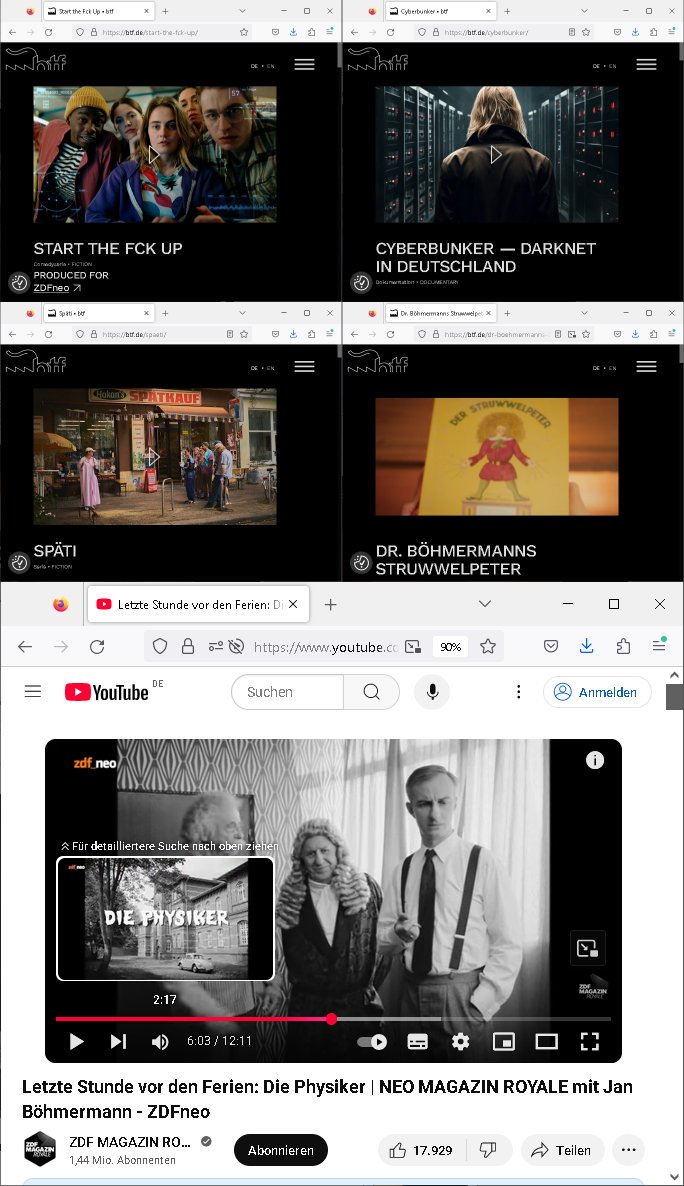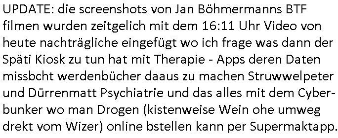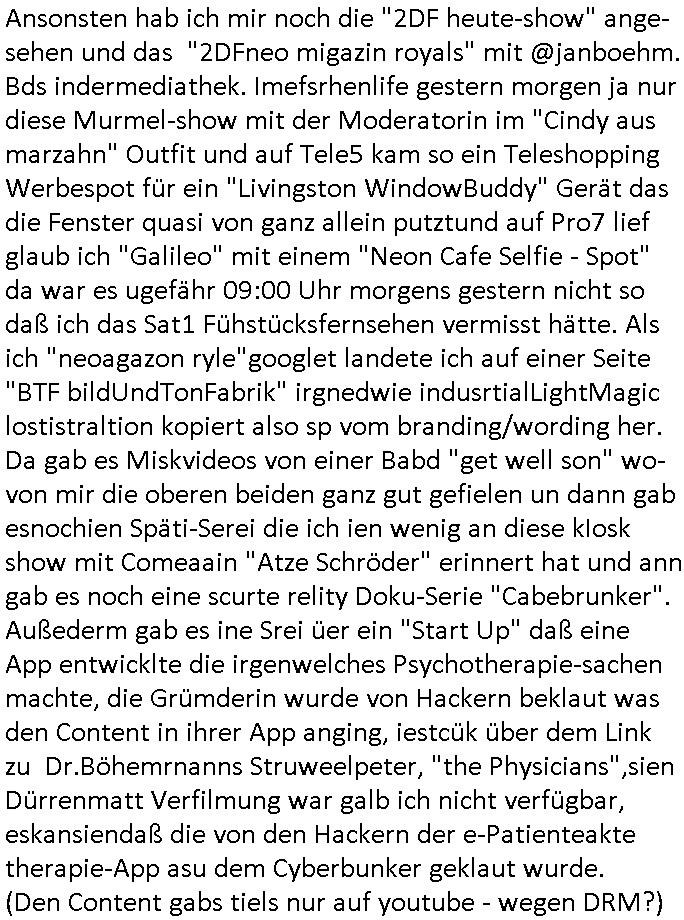 09.06.2025 12:00 Ansonsten hab ich mir noch die "2DF heute-show" ange-sehen und das "2DFneo migazin royals" mit @janboehm. Bds indermediathek. Imefsrhenlife gestern morgen ja nur diese Murmel-show mit der Moderatorin im "Cindy aus marzahn" Outfit und auf Tele5 kam so ein Teleshopping Werbespot für ein "Livingston WindowBuddy" Gerät das die Fenster quasi von ganz allein putztund auf Pro7 lief glaub ich "Galileo" mit einem "Neon Cafe Selfie - Spot" da war es ugefähr 09:00 Uhr morgens gestern nicht so daß ich das Sat1 Fühstücksfernsehen vermisst hätte. Als ich "neoagazon ryle"googlet landete ich auf einer Seite "BTF bildUndTonFabrik" irgnedwie indusrtialLightMagic lostistraltion kopiert also sp vom branding/wording her. Da gab es Miskvideos von einer Babd "get well son" wo-von mir die oberen beiden ganz gut gefielen un dann gab esnochien Späti-Serei die ich ien wenig an diese kIosk show mit Comeaain "Atze Schröder" erinnert hat und ann gab es noch eine scurte relity Doku-Serie "Cabebrunker". Außederm gab es ine Srei üer ein "Start Up" daß eine App entwicklte die irgenwelches Psychotherapie-sachen machte, die Grümderin wurde von Hackern beklaut was den Content in ihrer App anging, iestcük über dem Link zu Dr.Böhemrnanns Struweelpeter, "the Physicians",sien Dürrenmatt Verfilmung war galb ich nicht verfügbar, eskansiendaß die von den Hackern der e-Patienteakte therapie-App asu dem Cyberbunker geklaut wurde. (Den Content gabs tiels nur auf youtube - wegen DRM?) https://btf.de/start-the-fck-up/ https://btf.de/cyberbunker/ https://btf.de/dr-boehmermanns-struwwelpeter/ https://www.youtube.com/watch?v=jRl3dCa7uPk&pp=0gcJCdgAo7VqN5tD https://www.mediashop.tv/p/livington-window-buddy-fensterreinigungsgeraet-1-plus-1 https://de.wikipedia.org/wiki/Alles_Atze https://btf.de/spaeti/ UPDATE: die screenshots von Jan Böhmermanns BTF filmen wurden zeitgelich mit dem 16:11 Uhr Video von heute nachträgliche eingefügt wo ich frage was dann der Späti Kiosk zu tun hat mit Therapie - Apps deren Daten missbcht werdenbücher daaus zu machen Struwwelpeter und Dürrenmatt Psychiatrie und das alles mit dem Cyber-bunker wo man Drogen (kistenweise Wein ohe umweg drekt vom Wizer) online bstellen kann per Supermaktapp. [0] "202506091200-0-1.jpg" [1] "202506091200-0-2.jpg" [2] "202506091200-0-3.jpg" [3] "202506091200-0-4.jpg" |