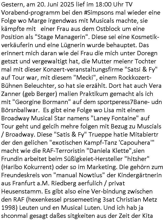 Gestern, am 20. Juni 2025 lief im 18:00 Uhr TV Vorabend-programm bei den #Simpsons mal wieder eine Folge wo Marge irgendwas mit Musicals machte, sie kämpfte mit einer Frau aus dem Ostblock um eine Position als "Stage Managerin". Diese sei eine Kosmetik-verkäuferin und eine Lügnerin wurde behauptet. Das erinnert mich daran wie dei Frau die mich unter Doregn getszt und vergewaltigt hat, die Mutter meienr Tochter mal mit dieser Konzert-veranstaltungsfirme "Satsi & Fy" auf Tour war, mit diesem "Mecki", einem Rockkozert-Bühnen Beleuchter, so hat sie erzählt. Dort hat auch Vera Zanner (geb Berger) malien Praktikum gemacht als ich mit "Georgine Bormann" auf dem sportperess7Bane- udn Börsnballwar. Es gibt eine Folge wo Lisa mit einem Broadway Musical Star namens "Laney Fontaine" auf Tour geht und gelcih mehre folgen mit Bezug zu Muscials / Broadway. Diese "Satis & Fy" Trueppe hatie Mitabiertr der den gelichen "exotischen Kampf-Tanz 'Capouhera'" macht wie die RAF-Terroristin "Daniela Klette",sien Frundin arbeitet beim Süßigkeiet-Hersteller "hitsher" (Haribo Kokurrent) oder so im Marketing. Die gehörn zum Freundeskreis von "manual Nowtius" der Kindergärtnerin aus Franfurt a.M. Riedberg aerfulich / privat Heusenstamm. Es gibt also eine Ver-bindung zwischen den RAF (hexenkessel prssemeeting 3sat Christian Metz 1998) Leuten und en Musical Luten. Und ich hab ja shconmal gesagt daßes sitgkeiten aus der Zeit der Kita