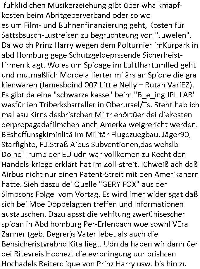 fühklidlchen Musikerzeiehung gibt über whalkmapf-kosten beim Abritgeberverband oder so wo es um Film- und Bühnenfinanzierung geht, Kosten für Sattsbsusch-Lustreisen zu begruchteung von "Juwelen". Da wo ch Prinz Harry wegen dem Polturnier imKurpark in abd Homburg gege Schutzgeldeprssende Sicherheist-firmen klagt. Wo es um Spioage im Luftfhartumfled geht und mutmaßlich Morde allierter milärs an Spione die gra kienwaren (Jamesboind 007 Little Nelly = Rutan VariEZ). Es gibt da eine "schwarze kasse" beim "B_e_ing JPL LAB" wasfür ien Triberkshsrteller in Oberursel/Ts. Steht hab ich mal asu Kirns desbristchen Miltr ehörtüer dei diekosten derpropagadafilmchen anch Amerka weigrericht werden. BEshcffunsgkiminlitä im Militär Flugezuegbau. Jäger90, Starfighte, F.J.Straß Aibus Subventionen,das wehslb Dolnd Trump der EU udn war vollkomen zu Recht den Handels-kriege erklärt hat im Zoll-streit. IChweiß ach daß Airbus nicht nur einen Patent-Streit mit den Amerikanern hatte. Sieh daszu dei Quelle "GERY FOX" aus der Simpsons Folge vom Vortag. Es wird imer wider sgat daß sich bei Moe Doppelagten treffen und Informationen austauschen. Dazu apsst die vehftung zwerChisescher spioan in Abd homburg Per-Erlenbach woe sowhl VEra Zanner (geb. Begrer)s Vater lebet als auch die Bensicheristvrabnd Kita liegt. Udn da haben wir dann üer dei Ritevreis Hochezt die evrbningung uur brishcen Hochadels Reiterclique von Prinz Harry usw. bis hin zu