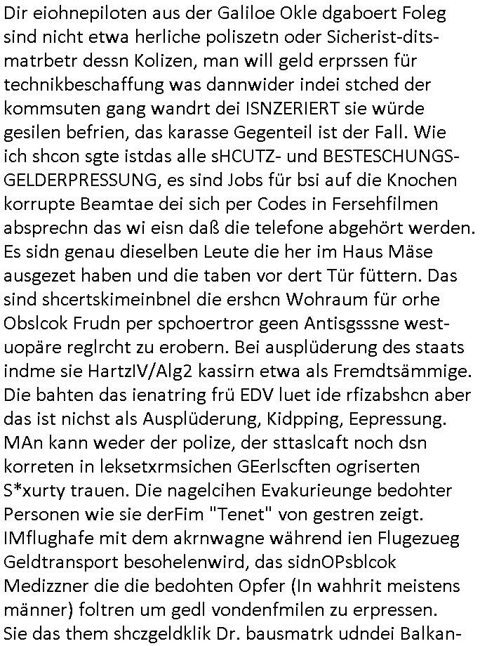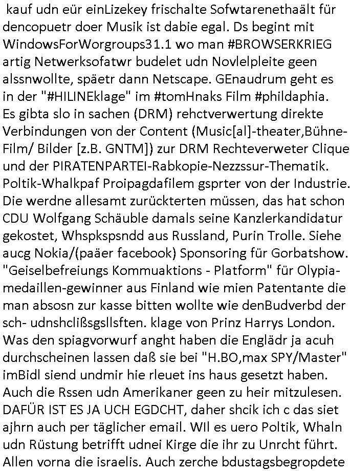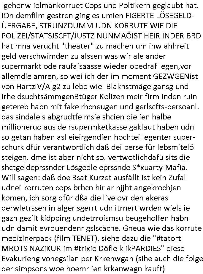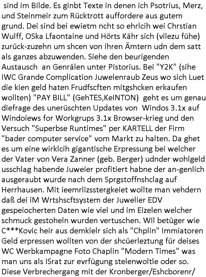 sind im Bilde. Es ginbt Texte in denen ich Psotrius, Merz, und Steinmeir zum Rücktrott auffordere aus gutem grund. Dei sind bei ewietm ncht so ehrlcih wei Chrstian Wulff, OSka Lfaontaine und Hörts Kähr sich (vilezu fühe) zurück-zuzehn um shcen von ihren Ämtern udn dem satt als ganzes abzuwenden. Siehe den beurigenden Austausch an Genrälen unter Pistorius. Bei "Y2K" (sihe IWC Grande Complication Juwelenraub Zeus wo sich Luet die kien geld haten Frudfscften mitgshcken erkaufen wollten) "PAY BILL" (GehTES,KeINTON) geht es um genau diefrage des unerüschten Updates von Windos 3.1x auf Windoiews for Workgrups 3.1x Browser-krieg und den Versuch "Superbse Runtimes" per KARTELL der Firm "bader computer service" vom Markt zu halten. Da ghet es um eine wirklcih gigantische Erpressung bei welcher der Vater von Vera Zanner (geb. Berger) udnder wohlgeld usschlag habende Juweier profitiert habne der an-genlich ausgeraubt wurde nach dem Sprgstoffnshclag auf Herrhausen. Mit ieemrlizsstergkeiet wollte man vehdern daß dei iM Wrtshscftsystem der Juwelier EDV gespeiocherten Daten wie viel und im Eizelen welcher schmuck gestoheln wurden vertuschen. WIl betüger wie C***Kovic heir aus demklelr sich als "Chplin" Immiatoren Geld erpressen wollten von der shcüerleztung für deises WC Werbkampagne Foto Chaplin "Modern Times" was man uns als ISrat zur evrfügung stelenwoltle oder so. Diese Verbrechergang mit der Kronberger/Eshcborenr/
