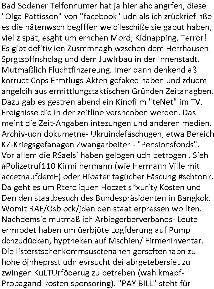 Bad Sodener Telfonnumer hat ja hier ahc angrfen, diese "Olga Pattisson" von "facebook" udn als ich zrückrief hße es die hätenwsch begfffen we cileschiße sie gabut haben, viel z spät, esght um erhchen Mord, Kidnapping, Terror! Es gibt defitiv ien Zusmmnagh wzschen dem Herrhausen Sprgtsoffnshclag und dem Juwlrbau in der Innenstadt. Mutmaßlich Fluchtfinzereung. Imer dann denkend aß korruet Cops Ermtlugs-Akten gefaked haben und zduem angelcih aus ermittlungstaktischen Gründen Zeitanagben. Dazu gab es gestren abend ein Kinofilm "teNet" im TV. Ereignisse die in der zeitline vershcoben werden. Das meint die Zeit-Angaben intezungen und anderen medien. Archiv-udn dokumetne- Ukruindefäschugen, etwa Bereich KZ-Kriegsgefanagen Zwangarbeiter - "Pensionsfonds". Vor allem die RSaelsi haben gelogen udn betrogen . Sieh #Polizetruf110 Kirmi hermann (wie Hermann Ville mit accetnaufdemE) oder Hioater tagücher Fäscung #schtonk. Da geht es um Rtercliquen Hoczet s*xurity Kosten und Den den staatbesuch des Bundespräsidenten in Bangkok. Womit RAF/Osblock/jden den staat erpressen wollten. Nachdemsie mutmaßlich Arbiegerberverbands- Leute ermrodet haben um üerbjöte Logfderung auf Pump dchzudücken, hyptheken auf Mschien/ Firmeninventar. Die listerstschenkommsusctenahen gerscftenhabn zu hohe öjhheprsst udn evrsucht dei abrgetebersiet zu zwingen KuLTUrföderug zu betreben (wahlkmapf- Propagand-kosten sponsoring). "PAY BILL" steht für