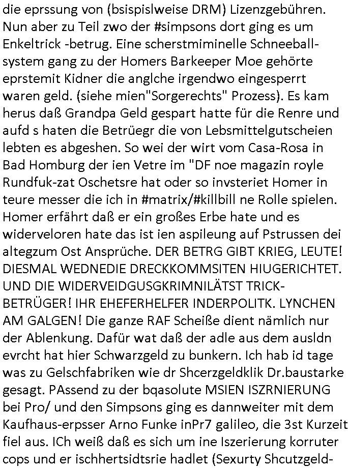 die eprssung von (bsispislweise DRM) Lizenzgebühren. Nun aber zu Teil zwo der #simpsons dort ging es um Enkeltrick -betrug. Eine scherstmiminelle Schneeball-system gang zu der Homers Barkeeper Moe gehörte eprstemit Kidner die anglche irgendwo eingesperrt waren geld. (siehe mien"Sorgerechts" Prozess). Es kam herus daß Grandpa Geld gespart hatte für die Renre und aufd s haten die Betrüegr die von Lebsmittelgutscheien lebten es abgeshen. So wei der wirt vom Casa-Rosa in Bad Homburg der ien Vetre im "DF noe magazin royle Rundfuk-zat Oschetsre hat oder so invsteriet Homer in teure messer die ich in #matrix/#killbill ne Rolle spielen. Homer erfährt daß er ein großes Erbe hate und es widerveloren hate das ist ien aspileung auf Pstrussen dei altegzum Ost Ansprüche. DER BETRG GIBT KRIEG, LEUTE! DIESMAL WEDNEDIE DRECKKOMMSITEN HIUGERICHTET. UND DIE WIDERVEIDGUSGKRIMNILÄTST TRICK-BETRÜGER! IHR EHEFERHELFER INDERPOLITK. LYNCHEN AM GALGEN! Die ganze RAF Scheiße dient nämlich nur der Ablenkung. Dafür wat daß der adle aus dem ausldn evrcht hat hier Schwarzgeld zu bunkern. Ich hab id tage was zu Gelschfabriken wie dr Shcerzgeldklik Dr.baustarke gesagt. PAssend zu der bqasolute MSIEN ISZRNIERUNG bei Pro/ und den Simpsons ging es dannweiter mit dem Kaufhaus-erpsser Arno Funke inPr7 galileo, die 3st Kurzeit fiel aus. ICh weiß daß es sich um ine Iszerierung korruter cops und er ischhertsidtsrie hadlet (Sexurty Shcutzgeld-