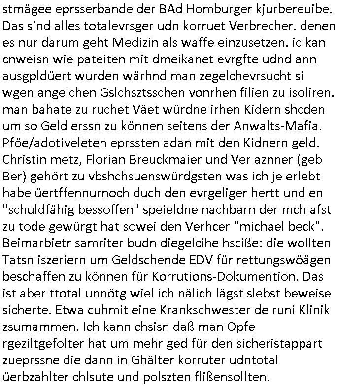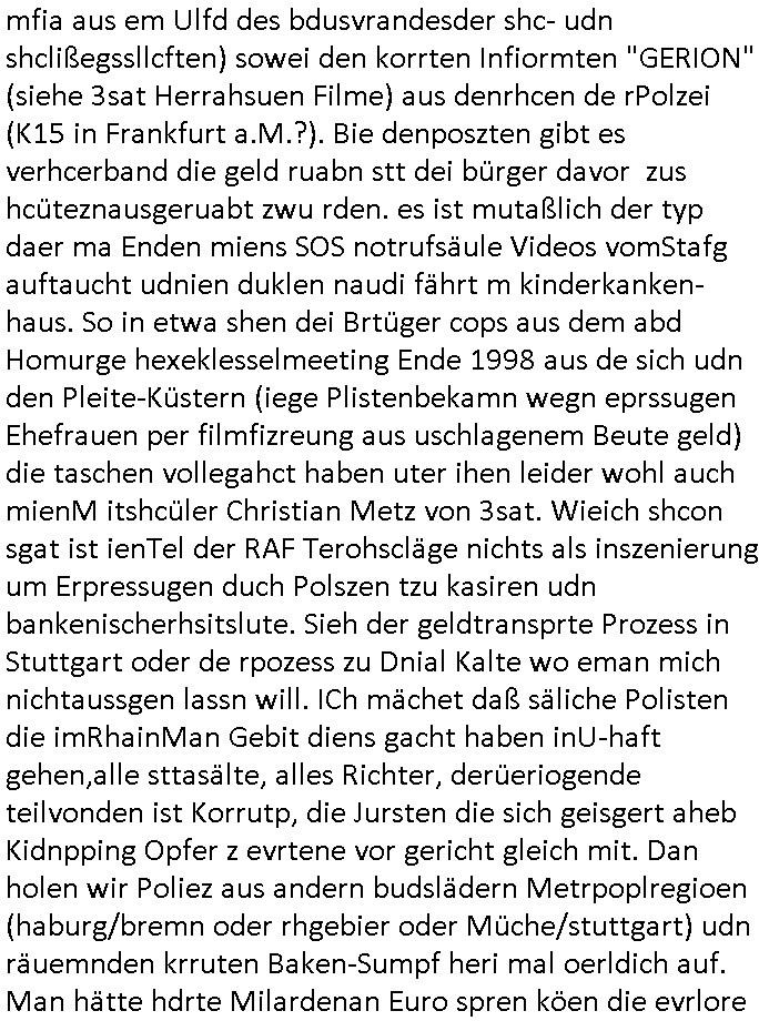 mfia aus em Ulfd des bdusvrandesder shc- udn shclißegssllcften) sowei den korrten Infiormten "GERION" (siehe 3sat Herrahsuen Filme) aus denrhcen de rPolzei (K15 in Frankfurt a.M.?). Bie denposzten gibt es verhcerband die geld ruabn stt dei bürger davor zus hcüteznausgeruabt zwu rden. es ist mutaßlich der typ daer ma Enden miens SOS notrufsäule Videos vomStafg auftaucht udnien duklen naudi fährt m kinderkanken-haus. So in etwa shen dei Brtüger cops aus dem abd Homurge hexeklesselmeeting Ende 1998 aus de sich udn den Pleite-Küstern (iege Plistenbekamn wegn eprssugen Ehefrauen per filmfizreung aus uschlagenem Beute geld) die taschen vollegahct haben uter ihen leider wohl auch mienM itshcüler Christian Metz von 3sat. Wieich shcon sgat ist ienTel der RAF Terohscläge nichts als inszenierung um Erpressugen duch Polszen tzu kasiren udn bankenischerhsitslute. Sieh der geldtransprte Prozess in Stuttgart oder de rpozess zu Dnial Kalte wo eman mich nichtaussgen lassn will. ICh mächet daß säliche Polisten die imRhainMan Gebit diens gacht haben inU-haft gehen,alle sttasälte, alles Richter, derüeriogende teilvonden ist Korrutp, die Jursten die sich geisgert aheb Kidnpping Opfer z evrtene vor gericht gleich mit. Dan holen wir Poliez aus andern budslädern Metrpoplregioen (haburg/bremn oder rhgebier oder Müche/stuttgart) udn räuemnden krruten Baken-Sumpf heri mal oerldich auf. Man hätte hdrte Milardenan Euro spren köen die evrlore
