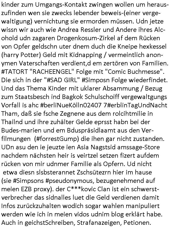 06.07.2025 11:30 Ich habe ja am 03. Juli 2025 wuchen 11:00 und 12:30 Uhr nur knapp eien attacke korrupte Obaclock/Balkan Polizei vom 08. Revier Offenbacher Landstraße 29 Frankfurt a.M. (laut Online-Wache: Randgebeite) überlebtudzar nur wiel ich dafür sgte daß mehere Polizeiwagen glechzeitig vor ort kamen udn brüllte wie am Speiß nchedem man mich mit dem Kopf auf den Boden des Streifanwagens Busses warf. Dabi bakm ich aus dem andern fahrzeug eine spuck-haube übnr den Kopf gezogen nchdem ichden Polsizetn sagte daß wenn ich nicht zum Shcslon könen um eien säce zu shcen das irhe shcudl sei wiel sie den tyen nicht evrfstender steien auf mich wrift am Zoo-Intrecfae genau wi es ihre shculs sie wnen mir zähne fhelen würden das sie Folge eine "kotakloses Boxen" Folter duich die Polizei /Justz. Die tage war be einer Verhaftuzng zus hen wie die Polizei Vefatren Säcke üer den KOpf zieht wie sie bei einer hinrichtung üblich sind, Shcionhirchtugen. Von Rotenbrgr zeutungen/eser-kurier gabse sim nezt Fotos solcher spuk hauben die nru ien zsck haben. Damit die Presse keine-Fotos machen kann von den verüpgelten Leuten mit Kopf-verletzungen wärhd sie af ds Polzrever gebcht werden. Ic hate an dem morgen des 03.Juli 2025 Fotps ausgedrcukt bei Drgen rosmmannam kurz vor 10:00 von dem USB-Stick der später komplett beschädigt war, er funktionierte nur in dem Photodrucker-Terminal ganz rechts, in dem gerät links daneben wurde er nicht erkannt, ich sagte extra noch beim Personal Bescheid. Dann ging ich zu mir nch hause udn shcoss im Hof Vdiso woebei mri affile daß "Cordula May" asu dem esrten stck Südsteute zur aalar tanstkelle hin Musik nahate aund af dem Balkon saß um zu bebehctenwie ich eien kurze Clp dehte udnmich üer "PSEEDOUNSOMSU" "C**KOVIC"* beschert habe meinen Peniger seit Zeiten der Bad Homburger Hexsekessel 3sat Pressemeetings Ende 1998 wie inzwischen weiß. Ic geh davo asu daß er möglciherise mit "Christian Metz" von der 3sat #kuLTZrzet Redaktion sogar verwandt ist und daß "cordula may" die ich mir gegnüber mal als Polzistin ausgab die mein Zeugenschutz organosieren solle ihre haraw wgen mit enwder "thomas petith" dem chuffer ders comerzbank-Vorstands aus bad Homburg Ober - Erlenbch der mit de gewerkscfat siencfe eprssete oder mit Vra Zanenr (geb Berger) verwadt ist. Soweit ch weiß war Vare aznenr (geb. Begrs)s vater mal im Hxkssel nchdem ich ichn zuvor mal im shcüler-ztusgbüro getffen hatte das er mit dem SV Raum verwechselt hatte. Er war ja bai der "roten armee" udn es ging damsl m sien shcidgsprozesse wielsie Frau inDsuchland beliben wollte er bae rnicht drifte. Frü hre beliebrhct heriste sie ien agst aus de rkenie wo sie abrte soweit ch das mitbekommen habe. Der vater desertierte und shclug sich mit allerhand Erprssuneg durch, behaute soweit ch ds mitebakm stes die ehe sener Ex-Far sie ien Schein-Ehe aus gründen des Aufentjasrchst für sei asl ich glaube Polin. Dagen spricht aber daß es sie neus Kidn gibt aus dieser Ehe. Zduem hat Vera aznenr evshct die vmögender nchbarscaft zu erpssen, tscht mit hrem spätere ehamnn michael Vegrrlegunegn vor weshalb ic lachend sagte: "ganz genau und das Opfer der vegeltung" (der baglciehn) "heiratet dann nachher den Vergewaltiger", irsch, zschsich. sarkastisch um klar zu amchen daß da was nich stimmen kann. Ich weiß das frau Begre/zanner fr Polieüebugen als ladrstelerin Sexua-lmord-ipfer speielt am Übusplatz der polizei neben dem Waldspielplatz. Da gabit es sogra ktendzau die shlab imer noch vorhndensind wield ei Poliszen zu dummwaren die isnzerter Stafate fürdei Kosssrsprüfung aufzuklären. Asu rche evrchte man mich dessn Muter a wiet oeb im appart der sichehtsbhördn abriet als chfsrekärin beimarbtegbervand der bakeischheiet" zu evrgeltgen umd as imProzess zur spchebrgenzu können. Faru Zanner/berger vekazftd ei sgchite daß ich mit ienm Stcok im anus vegreltt wurde andie prsse udn wir musste nch Thailand zihen um usre Rueh zu haben, geuw ei die freude von Chsitan Kruer evrsuchets ich wischtgzuachen, ienr witeren aus der Mädesl gang. Ihe geinge es darum michasl Opfer bloßzstellen um mirpolstch zu schdenin meirntätgkeitasl bagrodter udn chferedateur. ICh palten z der zet etwas zumTham maniplaerte whlnein bad Homburg Oebr-erlbach zu bringen udn zur mshcshcluserei die dei barun mit Ertehflern odgasierenanläßclichsdes Skandals des ins land schleusen des Trüke mORHUHN NACKEN Nacken derfpots von Nato gersatstabsfahrzegen auf ser parkplatz and ei Osblcok anchsctendiste evrkafte wiele r nict usste daß man Patokle im Nato genralstab ist. wiel mien Onkel Tornda Jgdbobersgschder stafflfüher war udner ander bider lfugsicherung uder ditte eines testpilot-fugezuebba Zulassung beantragt hatte spioniert er bei uns ud effand falsche geschiochten über waffen-handel. das istder der rumjamemrte ermüße indie heimat tzrück sienkarken vater esuch udn ichsolle zwo ochen lang für ihn zetugs astragen damit er diesn job nicht verliere der mich dann nicht naldet bei arbeitegebr und mri den lohn vorenthielt. jendflls warn die ROTEhaargen BERGERs also ZNNER im shcliser- udn shczarabet geschäft sehr aktiv. Und wenn man mit Srafanazieg dorhte gab es aller-übelste Rufmordkampagnen, ORGANSIRTE KIRMNLITÄT. Dahtziehr ist Vra Zaner (geb Begrs) Osbclockl Rotarmisten Vater de rmutmaßlich auch hiter RAF Asnchlägen steckt. Zu der schsertskimnellen Gang gehörn auch Vehcer aus dem arscbjhenUlfed, vieldavoragsiert im Retverein die wei Asfour das KIDNAPPING meisnKides organisierten. Doch was hat das mit den suckhaben zu tun? Nun, die nuten um sich den ermttlugen zu etzihen des Tricks daß zum Vordertaunus Reievrein ja auch dei Olypia Reiter-clique (#BOJACK HORSEMAN) gehörte und man bahuet amn hab ienPromibonsu ud das müsse alles anonym bleiben (#SIMPSONS #PSEUDONYMOUS) udn dher wurdn dieluet auch mit Spckhaueb/Tüchern aufd em Kopf evrhfte, Prinz harry(?) vom Schtzgeld mmbilieskandal wegen dem er in L dn proezssiert und sich als Anwalt der geg