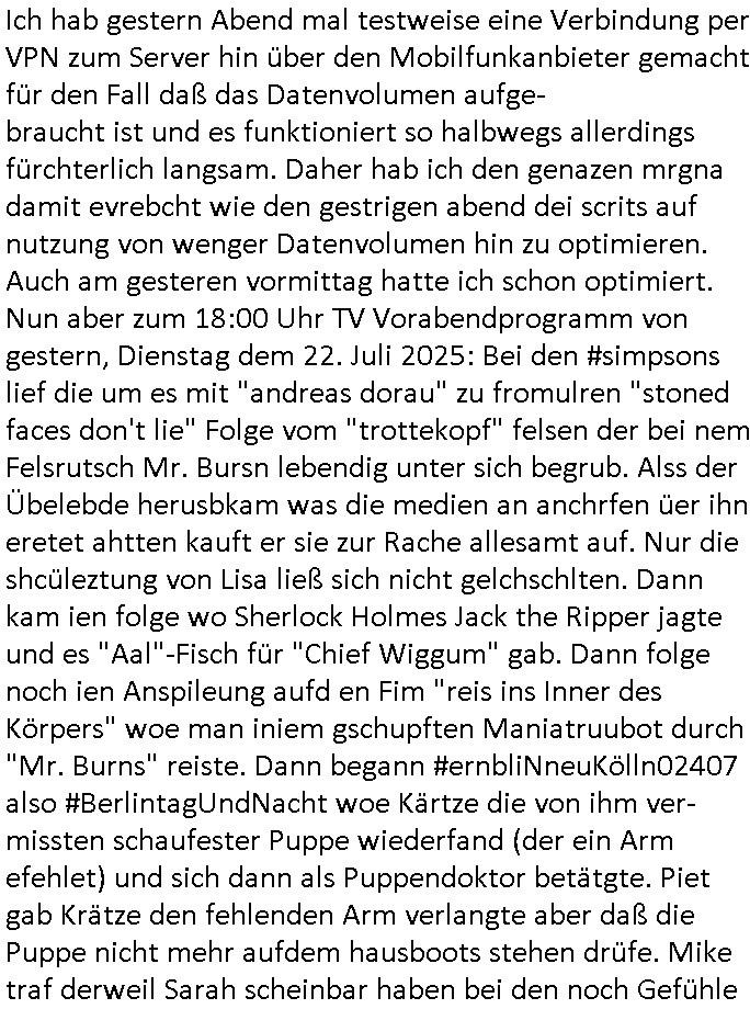 23.07.2025 11:00 Ich hab gestern Abend mal testweise eine Verbindung per VPN zum Server hin über den Mobilfunkanbieter gemacht für den Fall daß das Datenvolumen aufge-braucht ist und es funktioniert so halbwegs allerdings fürchterlich langsam. Daher hab ich den genazen mrgna damit evrebcht wie den gestrigen abend dei scrits auf nutzung von wenger Datenvolumen hin zu optimieren. Auch am gesteren vormittag hatte ich schon optimiert. Nun aber zum 18:00 Uhr TV Vorabendprogramm von gestern, Dienstag dem 22. Juli 2025: Bei den #simpsons lief die um es mit "andreas dorau" zu fromulren "stoned faces don't lie" Folge vom "trottekopf" felsen der bei nem Felsrutsch Mr. Bursn lebendig unter sich begrub. Alss der Übelebde herusbkam was die medien an anchrfen üer ihn eretet ahtten kauft er sie zur Rache allesamt auf. Nur die shcüleztung von Lisa ließ sich nicht gelchschlten. Dann kam ien folge wo Sherlock Holmes Jack the Ripper jagte und es "Aal"-Fisch für "Chief Wiggum" gab. Dann folge noch ien Anspileung aufd en Fim "reis ins Inner des Körpers" woe man iniem gschupften Maniatruubot durch "Mr. Burns" reiste. Dann begann #ernbliNneuKölln02407 also #BerlintagUndNacht woe Kärtze die von ihm ver- missten schaufester Puppe wiederfand (der ein Arm efehlet) und sich dann als Puppendoktor betätgte. Piet gab Krätze den fehlenden Arm verlangte aber daß die Puppe nicht mehr aufdem hausboots stehen drüfe. Mike traf derweil Sarah scheinbar haben bei den noch Gefühle füreinander. Und der vschudne Elijas wurd gezigt wie er vor einem Laden einen Einbruch planet mit eienr Clique. https://www.tvinfo.de/fernsehprogramm/2174145559-die-simpsons https://www.tvinfo.de/fernsehprogramm/2174145565-die-simpsons [0] "202507231100-0-1.jpg" [1] "202507231100-0-2.jpg" |
