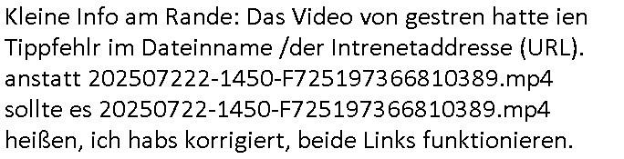 23.07.2025 14:30 Kleine Info am Rande: Das Video von gestren hatte ien Tippfehlr im Dateinname /der Intrenetaddresse (URL). anstatt 202507222-1450-F725197366810389.mp4 sollte es 20250722-1450-F725197366810389.mp4 heißen, ich habs korrigiert, beide Links funktionieren. http://tiktok.maximilian.baehring.at/20250722-1450-F725197366810389.mp4 ( http://tiktok.maximilian.baehring.at/202507222-1450-F725197366810389.mp4 ) [0] "202507231430-0-1.jpg" |