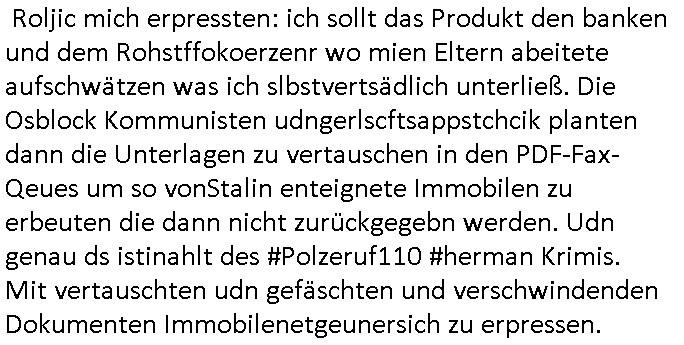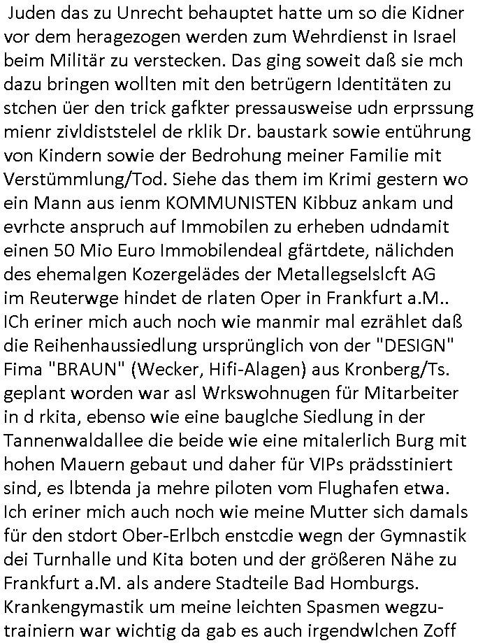 24.07.2025 06:00 Dann kam gestern, Mittwoch den 23. Juli 2025 noch zur "Prime Time" um ca. 20:15 Uhr eine Wiederholung des #POLIZERUF110 #HERMANN Krimis in welchem es um Erpressunge und mOrd ringhs um jüdisches Alteigentum ging und der auf einem Rohentwurf beruht der zur Zeit der deutschen Wiedervereinigung im Büro der schüler-ztungde rhumbodlstchule etstdn zusmen mit soweit ich erinnere Autoreb des Axel Springer Verlags ("die Welt"). siehe "Die" (Druckerpresse der Zetung) "Welt steht still" mit freundlichem Diebels das müste zeitnah zum Spreng-stoffnshclag auf den Bank(i)er Herrhausen gewesen sein, dem Überfall auf "Juwelier Zeus" zur fluchtifnzeriung und dem angeblchen "Metallgesellschaft AG Skandal um die Öl - optionen" sowie der "Peanuts - die Bank zahlt alles" Sache mit angeblich falschberchneten Flächen der Zeil - galerie die wegen der Klimatisierung ein Thema war und der geplanten Budsräsident Staatsbesuch nit Schulschiff (Vergewaligung ?) Bangkok, Thailand Berichterstattung. Es ging damsl um Schadenersatz für "juden immobilien" wobei die Juden eprsssresich behaupteten daß Neubau-gebiet "Wingert/Platanenring" in Bad Homburg Ober - Erlenbach sei illegal errichtet worden auf ehemaliegen jüdischen Gemeinde-Äckern. Das ist nicht richtig. Fals alle Ober-Erlenbacher Juden zogen wegen der Gründung des Staates Palästina nach Israel udn verkauften ihre Grund-Stücke an die Gemeinde oder den Reihenhaus-siedlungs- bau Investor. Es ging da eher darum daß man seitens der Juden das zu Unrecht behauptet hatte um so die Kidner vor dem heragezogen werden zum Wehrdienst in Israel beim Militär zu verstecken. Das ging soweit daß sie mch dazu bringen wollten mit den betrügern Identitäten zu stchen üer den trick gafkter pressausweise udn erprssung mienr zivldiststelel de rklik Dr. baustark sowie entührung von Kindern sowie der Bedrohung meiner Familie mit Verstümmlung/Tod. Siehe das them im Krimi gestern wo ein Mann aus ienm KOMMUNISTEN Kibbuz ankam und evrhcte anspruch auf Immobilen zu erheben udndamit einen 50 Mio Euro Immobilendeal gfärtdete, nälichden des ehemalgen Kozergelädes der Metallegselslcft AG im Reuterwge hindet de rlaten Oper in Frankfurt a.M.. ICh eriner mich auch noch wie manmir mal ezrählet daß die Reihenhaussiedlung ursprünglich von der "DESIGN" Fima "BRAUN" (Wecker, Hifi-Alagen) aus Kronberg/Ts. geplant worden war asl Wrkswohnugen für Mitarbeiter in d rkita, ebenso wie eine bauglche Siedlung in der Tannenwaldallee die beide wie eine mitalerlich Burg mit hohen Mauern gebaut und daher für VIPs prädsstiniert sind, es lbtenda ja mehre piloten vom Flughafen etwa. Ich eriner mich auch noch wie meine Mutter sich damals für den stdort Ober-Erlbch enstcdie wegn der Gymnastik dei Turnhalle und Kita boten und der größeren Nähe zu Frankfurt a.M. als andere Stadteile Bad Homburgs. Krankengymastik um meine leichten Spasmen wegzu-trainiern war wichtig da gab es auch irgendwlchen Zoff wegen dem "VariEZ F-PJKV" bau, ich wollt ja urrprünglich einen Pilotenschein machen und die behinderten Kinder asu der intagrativen Kiat gönnten mir das nicht, das ging eben bis hin zur Vergiftung mit pakinson Mdikamenten die den Zweck hatten daß ihre gefakten Unterschriften nicht auffallen sollten siehe dazu die Euro-banknoten vi-(improved) "deuIsenberg" [sic!] Signatur Debatte. Die mit der (bader computer/juwelier/persobalbertung) "BIGfax" Debatte begonnen hatte wo es darum ging daß man mit Computermodems/Akustik-kopplern/ISDN wiestgehend ohne Spurne zu hinterlassn gefakte Telefaxe vessenden konnte was dazu führte daß man die Email flächndecken satt nur hausintren einführte die Metall- gesellschft AG etwa nutzte afaik/afair Lotus Notes. Und es ging damsl um densigeszug de rgrsfcihen benuzter-oberfächen Windows(NT) und OS/2 und "Marco Stier" vonder shcülertung und seine "Russland Kontakte" der Sportlehrer "C***kovic" (bi den siposn COAHC KRUPT) sowie "Hausmeister Nikic" und Zuegn/persoennschützer der Bankensicherheit die Schutzgeld eprssen wollten per Bewachung von BIGfax-POPs/Verteilstelle Rechenzentren bei denen sie erpressen wollten daß die Alteigentums- gerichts Korrespondenz mit dem Ostblock per BIGfax geschieht angclieh aus kostegrüden genwue wie mich "Katja bader" von Bade Computer zusmen mit "piotr dzierzanowski" udnder fudninder tochter von "Bader" Vera Zaner (geb Berger) sowei deren Frundin Aleksandra Roljic mich erpressten: ich sollt das Produkt den banken und dem Rohstffokoerzenr wo mien Eltern abeitete aufschwätzen was ich slbstvertsädlich unterließ. Die Osblock Kommunisten udngerlscftsappstchcik planten dann die Unterlagen zu vertauschen in den PDF-Fax- Qeues um so vonStalin enteignete Immobilen zu erbeuten die dann nicht zurückgegebn werden. Udn genau ds istinahlt des #Polzeruf110 #herman Krimis. Mit vertauschten udn gefäschten und verschwindenden Dokumenten Immobilenetgeunersich zu erpressen. https://www.tvinfo.de/fernsehprogramm/2157232308-polizeiruf-110-hermann [0] "202507240600-0-1.jpg" [1] "202507240600-0-2.jpg" [2] "202507240600-0-3.jpg" [3] "202507240600-0-4.jpg" |