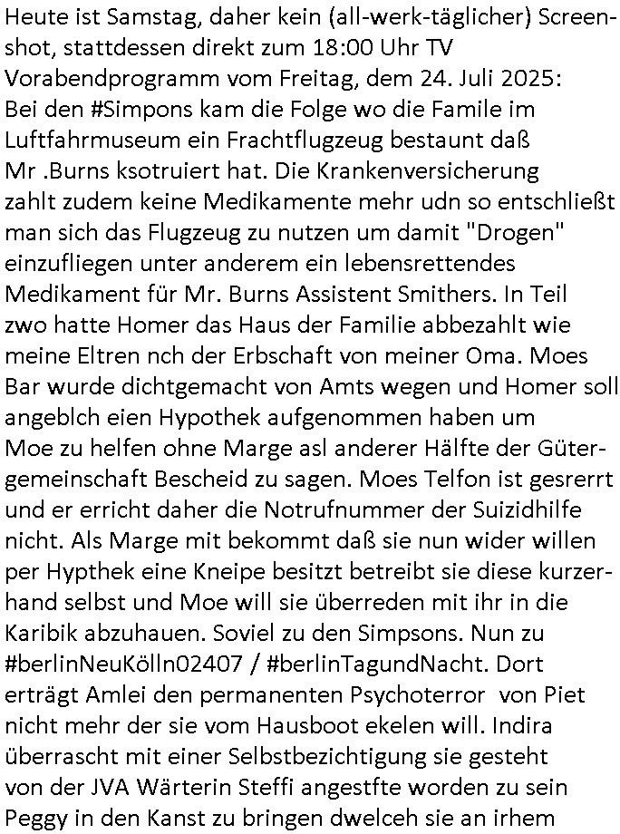 26.07.2025 09:30 Heute ist Samstag, daher kein (all-werk-täglicher) Screen-shot, stattdessen direkt zum 18:00 Uhr TV Vorabendprogramm vom Freitag, dem 24. Juli 2025: Bei den #Simpons kam die Folge wo die Famile im Luftfahrmuseum ein Frachtflugzeug bestaunt daß Mr .Burns ksotruiert hat. Die Krankenversicherung zahlt zudem keine Medikamente mehr udn so entschließt man sich das Flugzeug zu nutzen um damit "Drogen" einzufliegen unter anderem ein lebensrettendes Medikament für Mr. Burns Assistent Smithers. In Teil zwo hatte Homer das Haus der Familie abbezahlt wie meine Eltren nch der Erbschaft von meiner Oma. Moes Bar wurde dichtgemacht von Amts wegen und Homer soll angeblch eien Hypothek aufgenommen haben um Moe zu helfen ohne Marge asl anderer Hälfte der Güter-gemeinschaft Bescheid zu sagen. Moes Telfon ist gesrerrt und er erricht daher die Notrufnummer der Suizidhilfe nicht. Als Marge mit bekommt daß sie nun wider willen per Hypthek eine Kneipe besitzt betreibt sie diese kurzer- hand selbst und Moe will sie überreden mit ihr in die Karibik abzuhauen. Soviel zu den Simpsons. Nun zu #berlinNeuKölln02407 / #berlinTagundNacht. Dort erträgt Amlei den permanenten Psychoterror von Piet nicht mehr der sie vom Hausboot ekelen will. Indira überrascht mit einer Selbstbezichtigung sie gesteht von der JVA Wärterin Steffi angestfte worden zu sein Peggy in den Kanst zu bringen dwelceh sie an irhem Arbeitsplatz, dem Friseursalon "Schnitte" besucht. https://www.tvinfo.de/fernsehprogramm/2174146362-die-simpsons https://www.tvinfo.de/fernsehprogramm/2174146373-die-simpsons [0] "202507260930-0-1.jpg" [1] "202507260930-0-2.jpg" |