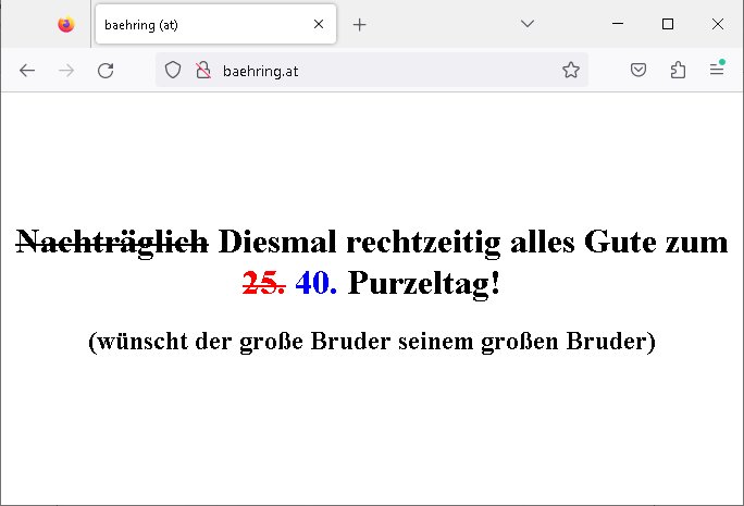 31.07.2025 07:30 Diesmal rechtzeitig alles Gute zum 40. Purzeltag! (wünscht der große Bruder seinem großen Bruder) http://baehring.at/ (auch von Asien aus http://baehring.at.jp.banktunnel.eu/ ) [0] "202507310730-0-1.jpg" |