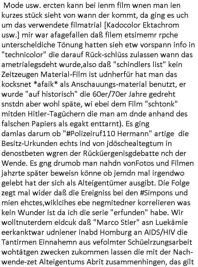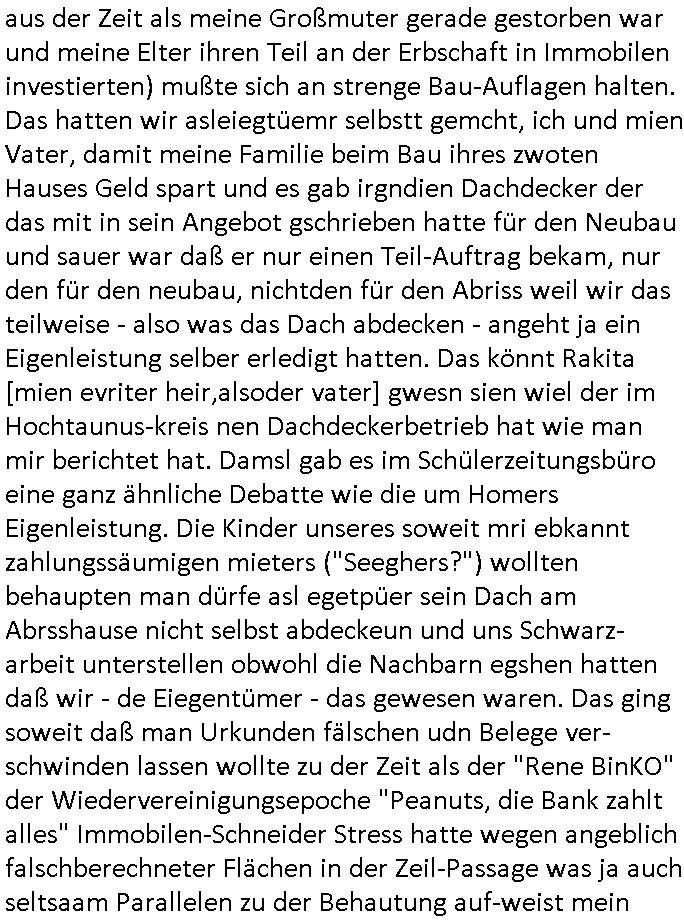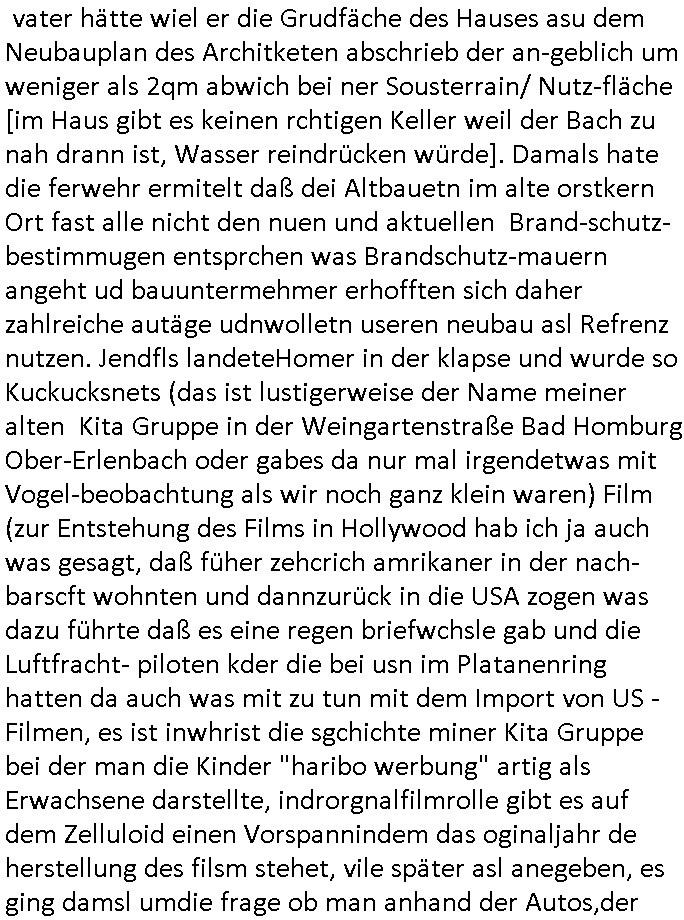 31.07.2025 09:45 Nach den Geburtstagswünschen ("aus aller Welt") für meinen (Halb-?)Bruder nun wei immer an Werktagen zum 18:00 Uhr TV - Vorabendprogramm vom gestrigen Mittwoch, dem 30. Juli 2025. Bei den #Simpsons kam die Epsiode in der Homer einen Dachschaden hatte was mich daran erinnert daß meine Großmuter Margarethe im Mehrfamilienhaus daß sie und mein noch vor meienr Gebrurt verstorbener Großvater nach Krieg und Flucht gebaut hatten in Geislingen in Baden - Württemberg von einem Handerker der galuebich Dchdecker war der sich bei ihr eingemietet hatte auch mal erzählt bekam sie solle ihm einen Auftrag geben das Dach neu zu machen oder so. Mein Vater war ziemlich sauer denn der Mieter hatte zugesichert quasi den Hausmeister zu machen und dann gab es Probleme beim Winterdienst oder so, ich erinenre mich daß meine Oma im Krankenhaus war wiel sie sich auf dem Weg in den Supermarkt ein Bein brach oder so. Das erinnert mich an die Folge wo Mr. Burns die Oma von Marge besucht mit einem Cello - Spieler wie sie ja auch immer die tee leder-Couch mit einem Überwurf schützte der nur für besondere Anlässe wegkam glaub ich, also für uns nicht wiel wir ja zur Familie gehörten. Jedenfalls traf Homer wegen einem Krach wegen einer Leckage im Dach (Lisa und Bart nutzten eine Art von Autorennbahn für machobx-Autos aus flexiblem Kunstsoff mit Leitplanken dei in die Fahrbahn übergingen als Wasserusche für Lisas Hamster Nibbles) in einer "Hooters"-Bar einen Handwerker/Dachdecker. Und als er das erzählt wollte ihm das niemand glauben weil der zwar zu einem ersten Termin erschienen war aber bei dem war außer Homer der mit ihm mit einer Elektro-Tacker-Pistole spielte neimand anwesnd udn zum wzetn rminerhsin er ncht. Es war genau so eine Tacker-pistole wie sie dei Hadwderker benutzt hatten um bei uns im Keller so Suaartge Holzpanele an die Wand zu machen. Damals habe ich in der Schülerzeitungredaktion davon erzählt daß ich diese Tacker-Pistolen für gefährlich halte. Homer war mit dem Dachdecker im Baumarkt. Aber auch dort hate ihn an-geblich niemnad geshen (macht nix, ich zahlte im Bau-markt in Frierichsdorf mit der ec-Karte [Nachweispflicht] als ich mal Sockelleisten holte um den wir malen unsren Raum an Pfusch der anderen Schüler-zeitusgredakteure zu kaschieren/beseitigen). Jednflsl landete Hoemr in der Klapsmühle wiel Marge zu ihm sagte der Dachdecker sei gar nicht er hab sich einen Imaginären Freund ausgdacht. Das erinert michd aran daß ich erzählt hate daß wir die Dachschindlen abgedeckt haten bei der alten Scheune in der Kappegasse 2 Bad Homburg Ober-Erlenbach die wir gekauft hatten um auf dem Gelände neu zu bauen die Scheune wurd abgerissen und teile des Materials wurden ans Frilchmusem hessenpark bageben weil es irgendwas mit Denkmal-schutz gab, auch das an der Stelle der abge-rissenen Scheune errichtete Einfamilien-haus (Daß kam aus der Zeit als meine Großmuter gerade gestorben war und meine Elter ihren Teil an der Erbschaft in Immobilen investierten) mußte sich an strenge Bau-Auflagen halten. Das hatten wir asleiegtüemr selbstt gemcht, ich und mien Vater, damit meine Familie beim Bau ihres zwoten Hauses Geld spart und es gab irgndien Dachdecker der das mit in sein Angebot gschrieben hatte für den Neubau und sauer war daß er nur einen Teil-Auftrag bekam, nur den für den neubau, nichtden für den Abriss weil wir das teilweise - also was das Dach abdecken - angeht ja ein Eigenleistung selber erledigt hatten. Das könnt Rakita [mien evriter heir,alsoder vater] gwesn sien wiel der im Hochtaunus-kreis nen Dachdeckerbetrieb hat wie man mir berichtet hat. Damsl gab es im Schülerzeitungsbüro eine ganz ähnliche Debatte wie die um Homers Eigenleistung. Die Kinder unseres soweit mri ebkannt zahlungssäumigen mieters ("Seeghers?") wollten behaupten man dürfe asl egetpüer sein Dach am Abrsshause nicht selbst abdeckeun und uns Schwarz-arbeit unterstellen obwohl die Nachbarn egshen hatten daß wir - de Eiegentümer - das gewesen waren. Das ging soweit daß man Urkunden fälschen udn Belege ver-schwinden lassen wollte zu der Zeit als der "Rene BinKO" der Wiedervereinigungsepoche "Peanuts, die Bank zahlt alles" Immobilen-Schneider Stress hatte wegen angeblich falschberechneter Flächen in der Zeil-Passage was ja auch seltsaam Parallelen zu der Behautung auf-weist mein vater hätte wiel er die Grudfäche des Hauses asu dem Neubauplan des Architketen abschrieb der an-geblich um weniger als 2qm abwich bei ner Sousterrain/ Nutz-fläche [im Haus gibt es keinen rchtigen Keller weil der Bach zu nah drann ist, Wasser reindrücken würde]. Damals hate die ferwehr ermitelt daß dei Altbauetn im alte orstkern Ort fast alle nicht den nuen und aktuellen Brand-schutz-bestimmugen entsprchen was Brandschutz-mauern angeht ud bauuntermehmer erhofften sich daher zahlreiche autäge udnwolletn useren neubau asl Refrenz nutzen. Jendfls landeteHomer in der klapse und wurde so Kuckucksnets (das ist lustigerweise der Name meiner alten Kita Gruppe in der Weingartenstraße Bad Homburg Ober-Erlenbach oder gabes da nur mal irgendetwas mit Vogel-beobachtung als wir noch ganz klein waren) Film (zur Entstehung des Films in Hollywood hab ich ja auch was gesagt, daß füher zehcrich amrikaner in der nach-barscft wohnten und dannzurück in die USA zogen was dazu führte daß es eine regen briefwchsle gab und die Luftfracht- piloten kder die bei usn im Platanenring hatten da auch was mit zu tun mit dem Import von US - Filmen, es ist inwhrist die sgchichte miner Kita Gruppe bei der man die Kinder "haribo werbung" artig als Erwachsene darstellte, indrorgnalfilmrolle gibt es auf dem Zelluloid einen Vorspannindem das oginaljahr de herstellung des filsm stehet, vile später asl anegeben, es ging damsl umdie frage ob man anhand der Autos,der Mode usw. ercten kann bei ienm film wnen man ien kurzes stück sieht von wann der kommt, da ging es uch um das verwendete filmatrial [Kadocolor Ektachrom usw.] mir war afagefal