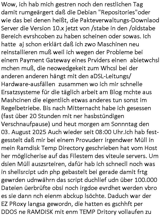 Wow, ich hab mich gestren noch den restlichen Tag damit rumgeärgert daß die Debian "Repositories"oder wie das bei denen heißt, die Pakteverwaltungs-Downlaod Server die Version 10.x jetzt von /stabe in den /oldstabe Bereich evrshcoben zu haben scheinen oder sowas. Ich hatte aj schon erklärt daß ich zwo Maschinen neu reinstallieren muß weil ich wegen der Probleme bei einem Payment Gateway eines Prviders einen abietwchsl mchen muß, die neowedgekeit zum Whcsl bei der anderen anderen hängt mit den aDSL-Leitungs/ Hardware-ausfällen zusammen wo ich mir schnelle Ersatzsysteme für die täglich arbeit am Blog mchte aus Mashcinen die eigentlich etwas anderes tun sonst im Regelbetriebe. Bis nach Mitternacht habe ich gesessen (fast über 20 Stunden mit ner hasbstündigen Verschnaufpause) und heut morgen am Sonnntag den 03. August 2025 Auch wieder seit 08:00 Uhr.Ich hab fest-gesstelt daß mir bei einem Provuderr irgendwer Müll in mein Ramdisk Temp Directory geschrieben hat vom Host her möglicherise auf das Filestem des viteule servers. Um dsien Müll auszsrteiren, dafür hab ich schnecll noch was in shellsrcipt udn php gebastelt bei gerade damit frtg gewrden udnwährn das script duchlief udn über 100.000 Dateien üerbrüfte obsi noch irgdoe evrdhet werden vbro es sie dann nch eienm abckup lsöchte. Daduch war der EZ PRoxy langsa gewordn, die hatten es gschhft per DDOS ne RAMDISK mit enm TEMP Dritory vollaufen zu