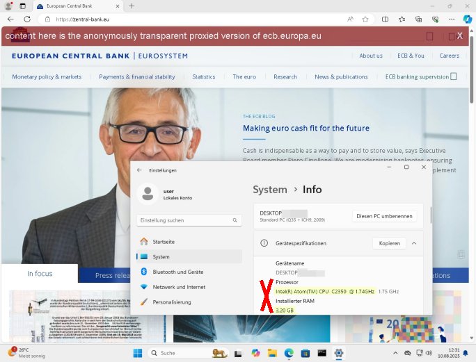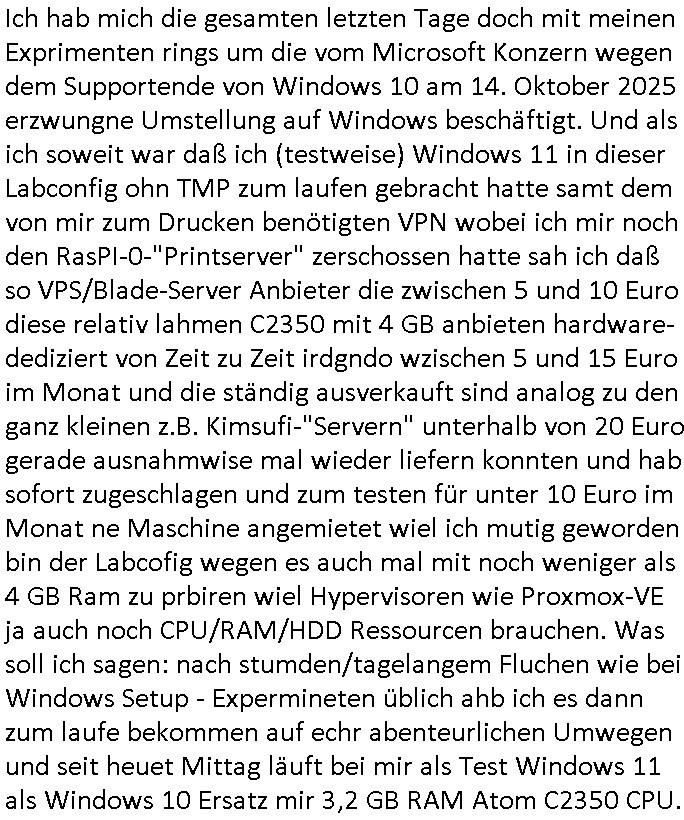 Ich hab mich die gesamten letzten Tage doch mit meinen Exprimenten rings um die vom Microsoft Konzern wegen dem Supportende von Windows 10 am 14. Oktober 2025 erzwungne Umstellung auf Windows beschäftigt. Und als ich soweit war daß ich (testweise) Windows 11 in dieser Labconfig ohn TMP zum laufen gebracht hatte samt dem von mir zum Drucken benötigten VPN wobei ich mir noch den RasPI-0-"Printserver" zerschossen hatte sah ich daß so VPS/Blade-Server Anbieter die zwischen 5 und 10 Euro diese relativ lahmen C2350 mit 4 GB anbieten hardware-dediziert von Zeit zu Zeit irdgndo wzischen 5 und 15 Euro im Monat und die ständig ausverkauft sind analog zu den ganz kleinen z.B. Kimsufi-"Servern" unterhalb von 20 Euro gerade ausnahmwise mal wieder liefern konnten und hab sofort zugeschlagen und zum testen für unter 10 Euro im Monat ne Maschine angemietet wiel ich mutig geworden bin der Labcofig wegen es auch mal mit noch weniger als 4 GB Ram zu prbiren wiel Hypervisoren wie Proxmox-VE ja auch noch CPU/RAM/HDD Ressourcen brauchen. Was soll ich sagen: nach stumden/tagelangem Fluchen wie bei Windows Setup - Expermineten üblich ahb ich es dann zum laufe bekommen auf echr abenteurlichen Umwegen und seit heuet Mittag läuft bei mir als Test Windows 11 als Windows 10 Ersatz mir 3,2 GB RAM Atom C2350 CPU.