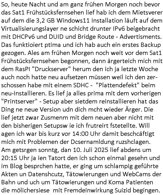 11.08.2025 14:00 So, heute Nacht und am ganz frühen Morgen noch bevor das Sat1 Frühstücksfernsehen lief hab ich dem Mietsverer auf dem die 3,2 GB Windows11 Installation läuft auf dem Virtualisierungslayer ne schicht drunter IPv6 beigebracht mit DHCPv6 und DUID und Bridge Route - Advertisments. Das funktioiert ptima und ich hab auch ein erstes Backup gezogen. Ales am frühen Morgen noch weit vor dem Sat1 Frühstücksfernsehen begonnen, dann ärgerteich mich mit dem RasPI "Druckserver" herum den ich ja letzte Woche auch noch hatte neu aufsetzen müssen weil ich den zer-schossen habe mit einem SDHC - "Plattendefekt" beim neu-Installieren. Es lief ja alles prima mit dem vorherigen "Printserver" - Setup aber sietdem reinstallieren hat das Ding ne neue Version udn dich mcht wieder Ärger. Die lief jetzt zwar Zusmenm mit dem neuen aber nicht mit den bisherigen Setupsw ie ich frutreirt fstetellte. Will agen ich war bis kurz vor 14:00 Uhr damit beschcäftigt mich mit Problemen der Dcsernamldung ruzshclagen. Am getsrgen sonntg, dan 10. Juli 2025 lief abdens um 20:15 Uhr ja ien Tatort den ich schon einmal gesehn und im Blog besprchen hatte, er ging um schlampig geführte Akten un Datenshcutz, Tätowierungen und WebCams der Bahn und uch um Tätowierungen und Koma Patienten die mölichersiese mit Fremdeinwirkung Suizid begingen. https://tvinfo.de/fernsehprogramm/2172237294-tatort [0] "202508111400-0-1.jpg" |